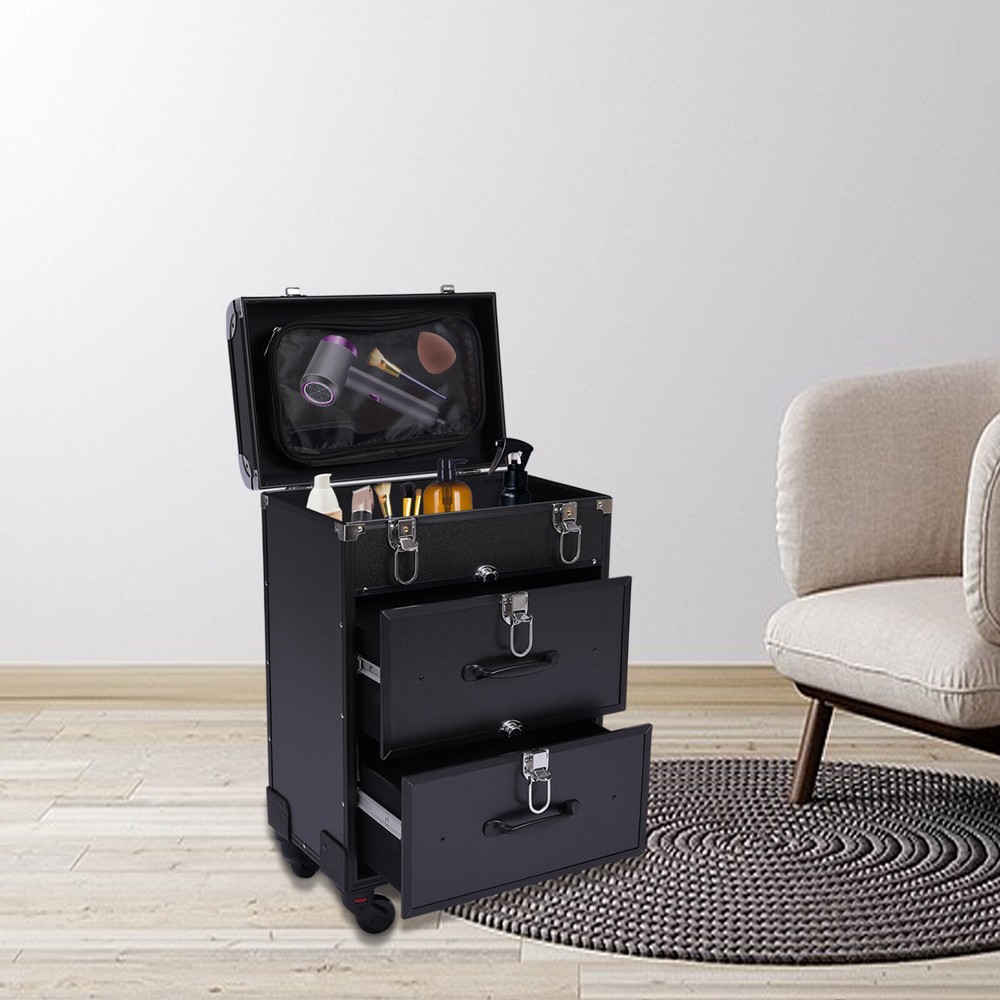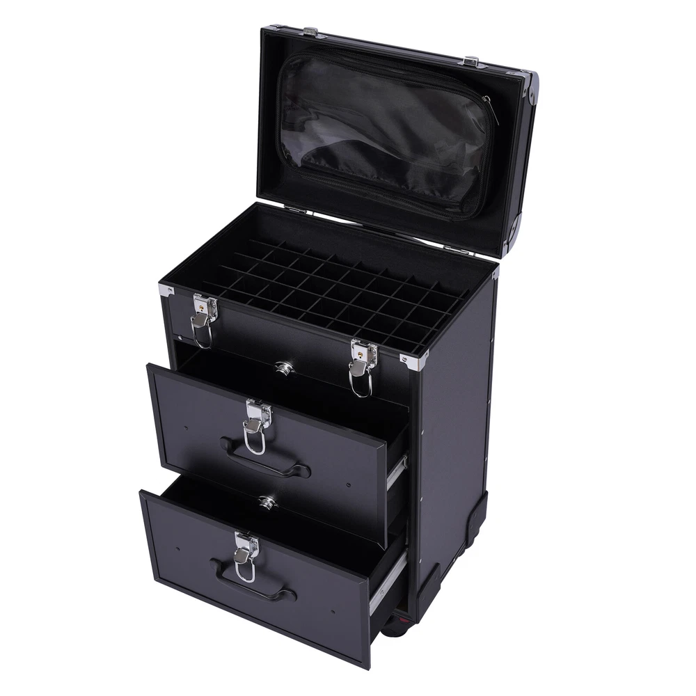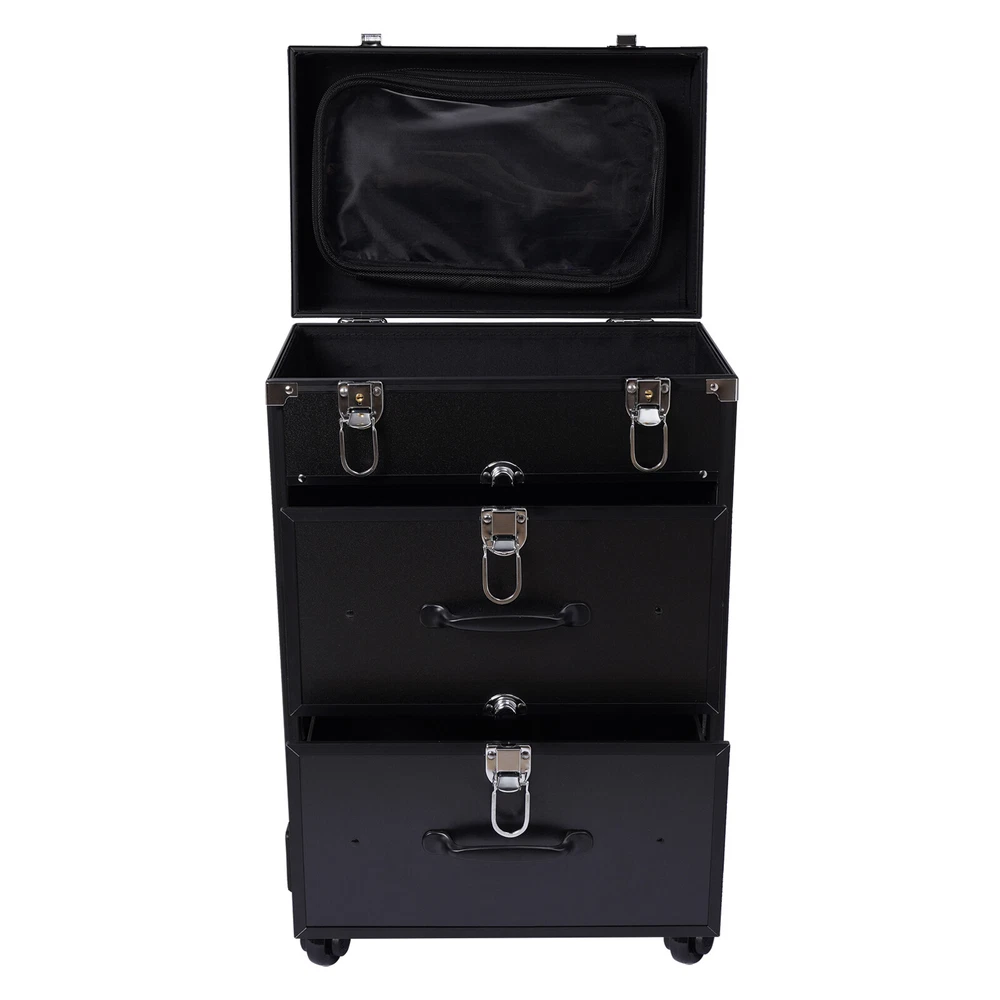 💖 WELCOME 💖 Rolling Aluminum Makeup Train Case Salon Cosmetic Trolley Travel Organizer Box Description This is a movable multi-layered makeup case designed for professional beauty artists to make up anytime and anywhere. This rolling makeup case is constructed of high-quality aluminum alloy that is sturdy and durable. It has extra large capacity compartments and multi-layer drawers. This case is ideal for all people who love beauty or nail art. Specification Number of Layers: 3 Color: Black Material: Aluminum Alloy Frame and Plastic Fireproof Board Panel Shape: Rectangular Processing Method: Frosted Rolling Wheel Style: Universal Wheel Carrying Parts: Retractable Handle Gross Weight: 9kg/ 19.8lbs Net Weight: 7.5kg/16.5lbs Package Size: 57*42*32cm/22.4*16.5*12.6inch Product Size: 36*23*58cm/14.2*9.1*22.8in Maximum Load: 50kg/110.3lbs Key Features High-quality Materials: The frame of the makeup case is wrapped with high-quality aluminum alloy, which will not easily rust and fade. And the thicker, all-aluminum drawbar makes the case more stable, refusing to shake. Large Capacity: This makeup case has 3 layers, the top layer can store nail polish or lipstick; the bottom two drawers can store full-size cosmetics and beauty appliances, such as perms, manicure machines and light therapy supplies. This multifunctional product can meet your storage needs. Excellent Weight-bearing Capacity: The rectangular construction and aluminum alloy frame give the case a superb load-bearing capacity (up to 110.3 lbs). You can safely put all your hair and beauty tools on it. Sorted Storage: Beauty products with different functions and sizes are stored in the corresponding drawer and compartment, making the tools ranged orderly, so it is convenient for you to quickly find the tools you want. Easy to Move and Carry: The universal wheels are easy to move and very convenient, especially for nail salons and beauty salons that have a lot of tools and need to move frequently. And it comes with a telescopic pull bar (maximum length is 32.7inchs) and a top handle, which is easy to carry on trips and business trips. Stylish Appearance: This rolling make-up case gives a stylish and exquisite look with its simple construction and stylish black. Such a retro make-up case will decorate your dressing room well and make a good impression when you are working outside. Secure & Reliable: The metal locks of the case protect the contents securely and the lockable design ensures security and privacy. Worry-free Service: We have been working hard to provide better service and quality for our customers, which is our goal. If there is any quality problem with our products. Please contact us in time. Details Transparent Storage Bag: The transparent storage bag on the inside of the lid allows for wet and dry storage, for example, you can store wet beauty eggs and powder puffs to avoid cross-contamination. Rounded Edges: The top of the cosmetic case has been designed with rounded corners rather than sharp edges to avoid scuffing. Reinforced Lock: Reinforced lock not only makes it convenient for you to open and close, but also does not affect the appearance, and solves the embarrassment of bursting when going out. Application This rolling make-up case is suitable for professional make-up artists, hairdressers, nail technicians, and beauticians in beauty centers, salons, private homes, parties, and other occasions. Package Included 1 x Makeup Case 4 x Universal Wheels 2 x Keys Payment Delivery details Terms of sales About us Contact us Payment We accept ebay payment 。 Fees such as import duties, taxes are not included in the item price or shipping costs. These charges are the buyer's responsibility. Delivery details Shipping: 2-9 working days to: USA Terms of sales We maintain high standards of excellence and strive for hundred percent customer satisfaction. Feedback is very important to us. We hope that you contact us immediately before you give neutral or negative feedback, so that we can address your concerns. It is impossible to address issues if we do not know about them! About us Your satis faction is our ultimate goal. We work hard to earn your trust and future business. Our certified technicians have tested each item before shipping. The unit comes with 1 year limited warranty on all manufacturing defects. a) If you receive a defective item, you may return it or ask for a discount. Please contact us within 14 days after you receive the package. b) What you returned must be intact and in its original packaging as re? u. Customer is responsible for shipping costs of the returned item. c) We will cover the cost of shipping back t with the shipping rate indicated in the registration page. We will send you a new unit or refund the full payment you paid. Thank you. Contact us Business Hour Business Hour: Monday To Friday: 8:30 AM to 5:00 PM (Beijing China time) Due to time zones, our reply to your questions may not be immediately. But within above working time, we will reply your email within 24 hours. If it's non-workdays, please kindly be patient and wait till Monday. Please contact us with ebay message. Please feel free to contact us if you have any questions. Monday To Friday: 8:30 AM to 5:00 PM (Beijing China time) Due to time zones, our reply to your questions may not be immediately. But within above working time, we will reply your email within 24 hours. If it's non-workdays, please kindly be patient and wait till Monday. Please contact us with ebay message. Please feel free to contact us if you have any questions.