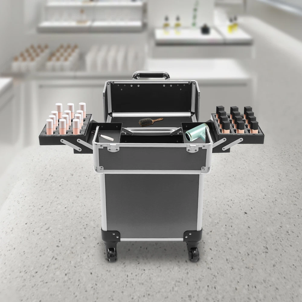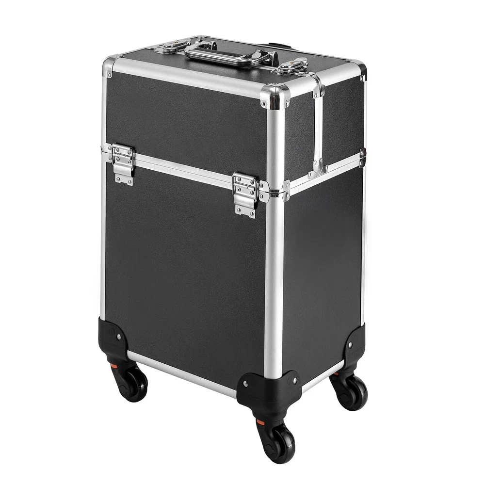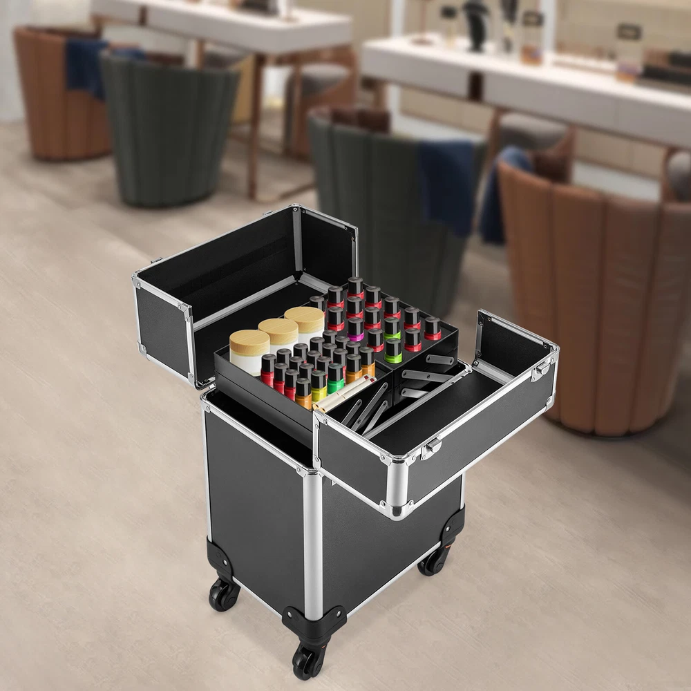 Specification Material: Aluminum Alloy, ABS Color: Black Shape: Rectangular Processing Method: Frosted Rolling Wheel Style: Universal Wheel Carrying Parts: Retractable Handle Model: HXS-05 Opening Method: Latch Number of Trays: 4 Maximum Load:100kg/220.46 lbs Shaking Degree: ±1cm/±0.39in Total Length of Trolley Bar: 80cm/31.5in Universal Wheel Height: 8cm/3.1in The Height of the Latch to the Bottom of the Case: 33 cm/13in Box Cover Height: 12cm/4.7in Base Layer Size: 32*22*31cm/12.6*8.66*12.2in Tray Size: 21.5*14.5*3.5cm/8.5*5.7*1.4in Gross Weight: 4.6kg/ 10.14 lbs Net Weight: 4.3kg/ 9.48 lbs Product Size: 34*24*45cm/ 13.4*9.4*17.7 in Package Size: 38*28.5*51cm/ 14.96*11.22*20.08in Package Included 1 * Rolling Makeup Train Case 2 * Keys Professional Travel Makeup Case Beauty Train Case Rolling Cosmetic Organizer New Description This is a removable multi-layer makeup case designed for professional beauticians to apply makeup anytime and anywhere. This rolling makeup train case is made of high-quality aluminum alloy and ABS for sturdiness and durability. It has an extra-large capacity base and 4 tiers of trays. The fashionable shape is safe and elegant, simple and fashionable. The humanized layout inside the case can reasonably manage the items for you and bring you a comfortable makeup experience. Key Features High-quality Material: This product is made of high-quality aluminum alloy and ABS fireproof board. It has the characteristics of corrosion resistance, wear resistance, and is not easy to fade. Classified Storage: This product has four sliding trays and a large bottom layer. Different functions and sizes of beauty products can be stored in the corresponding trays and compartments, making the storage of tools orderly and convenient for you to find the tools you want quickly. Safe and Stable: The case has a built-in alloy lock cylinder that securely protects the contents of the case and ensures privacy. The entire box is reinforced with aluminum alloy, which is more solid and durable. Large Capacity: This makeup case has four sliding trays measuring 8.46*5.71*1.38 inches that can hold 3.94in height nail polish bottles and a large bottom measuring 12.6*8.66*12.2 inches that can store cosmetics and beauty appliances, such as perms, manicure machines, and light therapy supplies. This versatile product will meet your storage needs. Excellent Weight Capacity: The rectangular structure and aluminum alloy frame give the case a superb weight capacity (up to 220.46 lbs.). You can safely put all your hair and beauty tools in it. Easy to Move and Carry: The universal wheels are easy to move and very convenient, especially for manicurists and cosmetologists who have more tools and need to go out often. And it comes with a telescoping trolley bar (maximum height of 31.5 inches) and a top handle, making it easy to carry when traveling and on business. Stylish Appearance: This rolling makeup train case gives a stylish and elegant look with its simple structure and pure colors. Such a vintage makeup case can nicely decorate your dressing room and make a good impression when you are out at work. Installation-free: This product has a one-piece structure, and you can use it directly without additional installation of it after receiving it. Details Three-position Trolley Bar: The thickened aluminum alloy trolley bar has a three positions design, which can be used by people of different heights. It has also undergone a 4,000 times fatigue test, which can control the shaking degree within ±0.39 inches. Removable Foam Compartment: The left tray uses a square 12-compartment foam compartment; the right tray uses a round 15-compartment foam compartment. It can put your cosmetics or nail polish in a more orderly way. And the foam can also protect the cosmetics well from wear and tear. Silent Universal Wheel: This product uses high-quality rubber removable silent universal wheels, which are strong and resistant to wear and tear. Detachable wheels can be easily removed or replaced if needed. Damping Handle: It is made of load force TEP and nylon, which is slow rebounded, durable, and not easy to break. And it also adopts the ergonomic width design, which can effectively relieve the pressure on your fingers. Application This rolling make-up case is suitable for professional make-up artists, hairdressers, nail technicians, and beauticians. Notes Please allow the slight color difference caused by the shooting light and the 1-3 cm error due to manual measurement, and make sure you do not mind before ordering. Payment Delivery details Terms of sales About us Contact us Payment We accept ebay payment 。 Fees such as import duties, taxes are not included in the item price or shipping costs. These charges are the buyer's responsibility. Delivery details Shipping: 2-9 working days to: USA Terms of sales We maintain high standards of excellence and strive for hundred percent customer satisfaction. Feedback is very important to us. We hope that you contact us immediately before you give neutral or negative feedback, so that we can address your concerns. It is impossible to address issues if we do not know about them! About us Your satis faction is our ultimate goal. We work hard to earn your trust and future business. Our certified technicians have tested each item before shipping. The unit comes with 1 year limited warranty on all manufacturing defects. a) If you receive a defective item, you may return it or ask for a discount. Please contact us within 14 days after you receive the package. b) What you returned must be intact and in its original packaging as re? u. Customer is responsible for shipping costs of the returned item. c) We will cover the cost of shipping back t with the shipping rate indicated in the registration page. We will send you a new unit or refund the full payment you paid. Thank you. Contact us Business Hour Business Hour: Monday To Friday: 8:30 AM to 5:00 PM (Beijing China time) Due to time zone