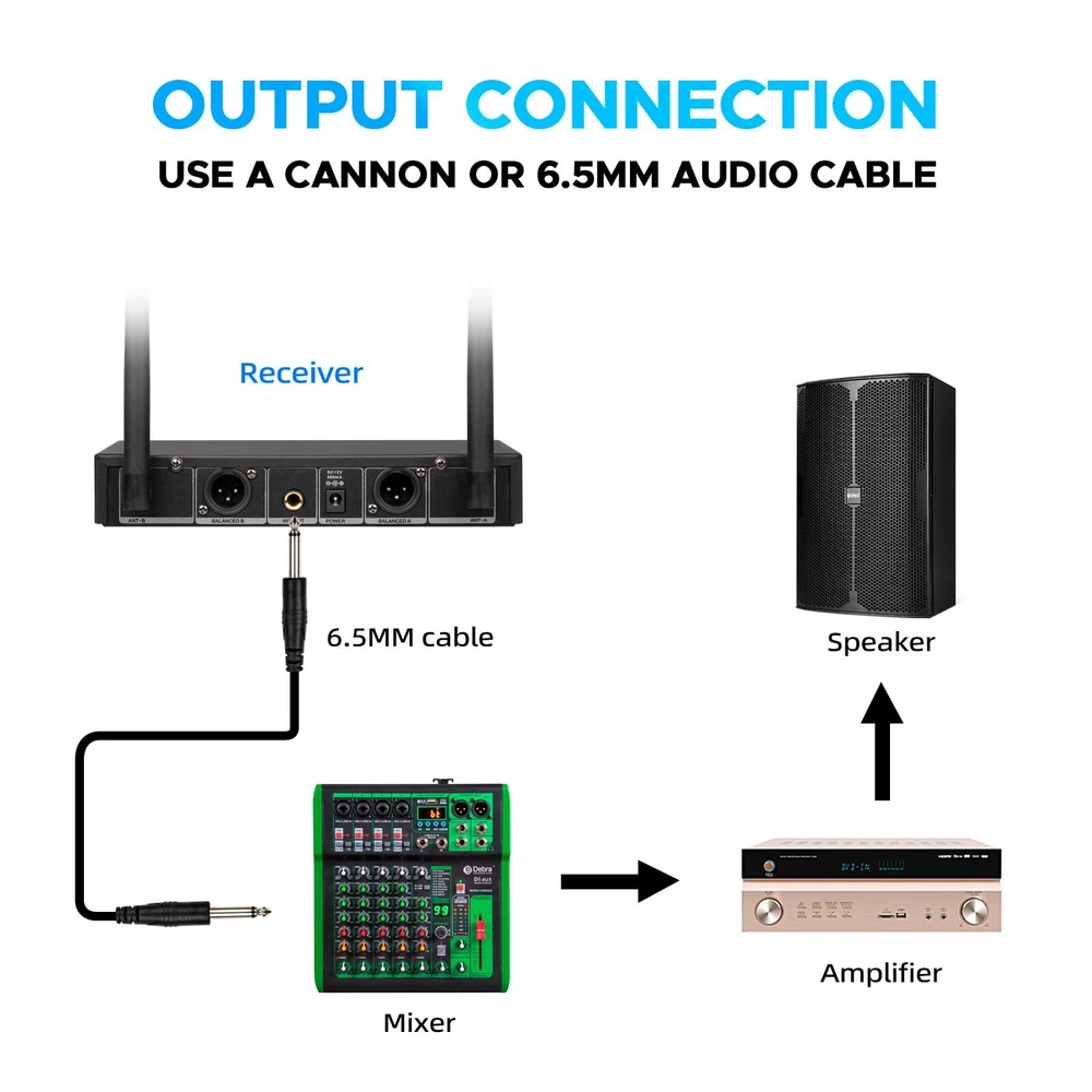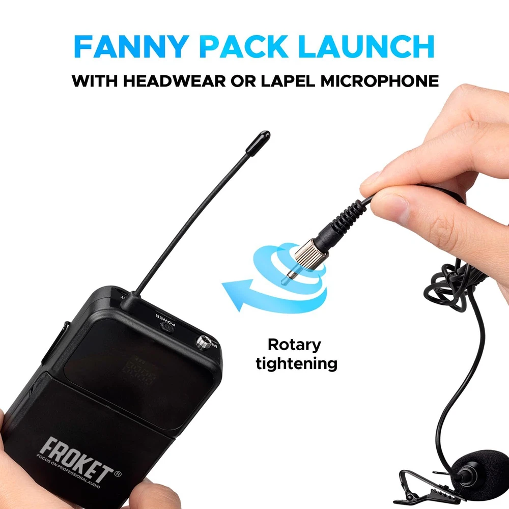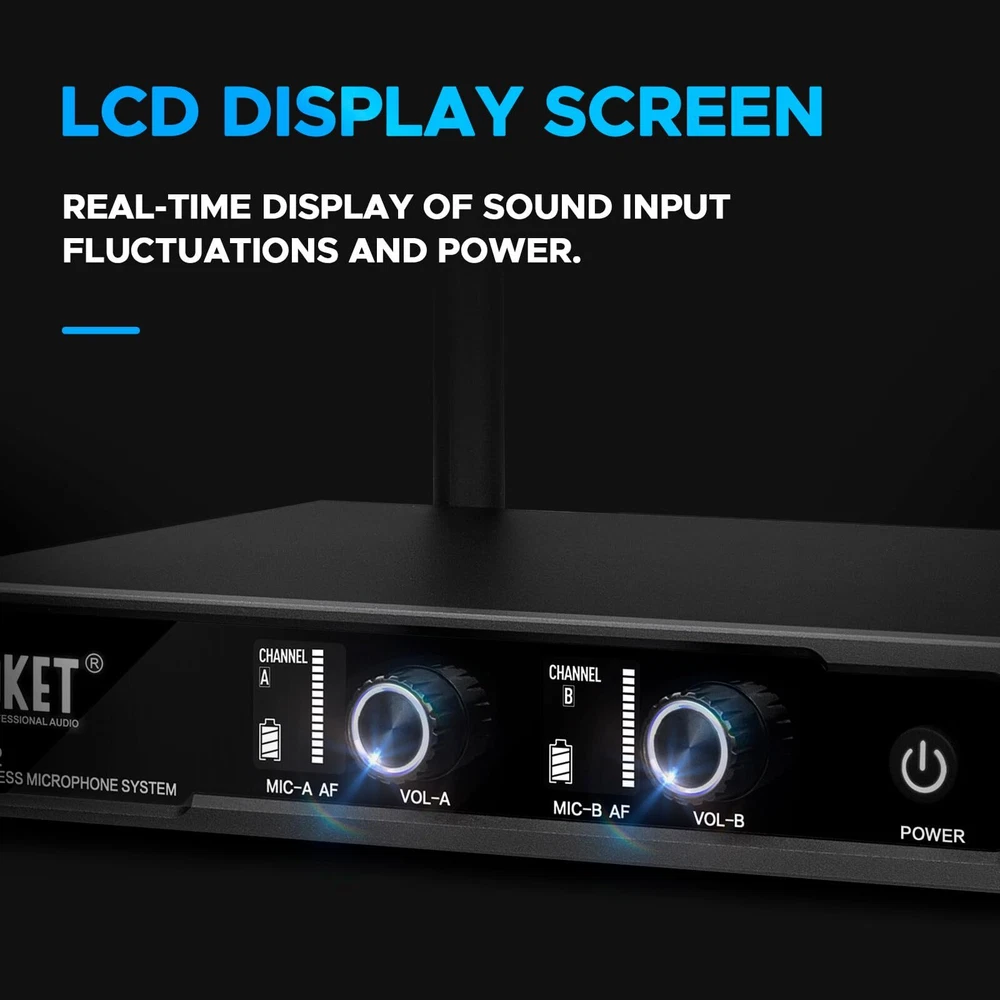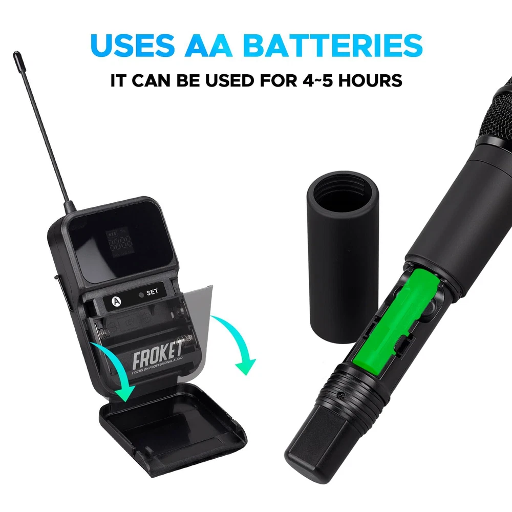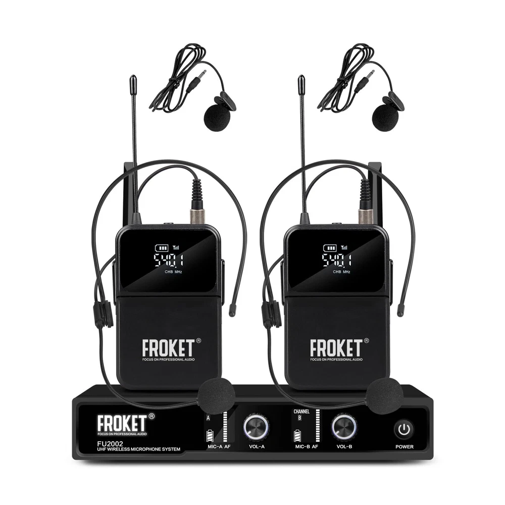 MICROPHONE PARAMETER: 1.Frequency Range: 520.30~579.30MHz. 2.Channel number A, B channel 30 (conservative value) each time pairing, the ID code changes randomly, in the frequency range set by the manufacturer. 3.Oscillator mode DSP chip frequency lock. 4.Frequency Stability: ±10ppm. 5.RF Power: 10dBm. 6.The frequency is 40 to 18000Hz. 7.Distortion Degree: ≤0.5%. 8.Battery specifications 1.5Vx 2/2 AA Size alkaline batteries. 9.Continuation time 4-6 hours(depending on battery type and capacity). RECEIVER PARAMETER: 1.Frequency Range: 520.30~579.30MHz. 2.Number of channels A, B channel 30(conservative value) each time pairing, the ID code changes randomly, in the frequency range set by the manufacturer. 3.Oscillator mode DSP chip frequency lock. 4.Rate Stability: ±10ppm. 5.Receiving Sensitivity: -95~-71dBm. 6.The frequency is 40 to 18000Hz. 7.Distortion Degree: ≤0.5%. 8.The Signal-to-Noise Ratio: ≥90dB. 9.Audio Output: 350mv(Max). 10.DC Voltage: DC 12V 5W. 𝐒𝐭𝐚𝐛𝐥𝐞 𝐖𝐢𝐫𝐞𝐥𝐞𝐬𝐬 𝐏𝐞𝐫𝐟𝐨𝐫𝐦𝐚𝐧𝐜𝐞: Each mic has a top-class cardioid dynamic sound core and upgraded circuit. Transmits sound smoothly. Stable and amazing sound. Ideal for karaoke, parties, etc 𝐋𝐨𝐧𝐠 𝐃𝐢𝐬𝐭𝐚𝐧𝐜𝐞 𝐑𝐞𝐜𝐞𝐩𝐭𝐢𝐨𝐧: Has two high-gain antennas. Stable signal. Anti-interference. Covers up to 260 ft/80 meters. Retractable antennas for storage and portability 𝟐x𝟑𝟎 𝐀𝐝𝐣𝐮𝐬𝐭𝐚𝐛𝐥𝐞 𝐂𝐡𝐚𝐧𝐧𝐞𝐥𝐬: Dual mics in UHF 510-590MHz band. 30 adjustable frequency groups per channel. Select frequencies. No interference. Use multiple groups simultaneously 𝐄𝐚𝐬𝐲 𝐭𝐨 𝐔𝐬𝐞: Once you turn on the wireless mics and the receiver, they'll pair automatically. Moreover, the receiver tracks frequencies. Keep in mind, each mic requires 2 x AA batteries (not included) 𝐔𝐬𝐞𝐫-𝐅𝐫𝐢𝐞𝐧𝐝𝐥𝐲 𝐃𝐞𝐬𝐢𝐠𝐧: The simple and intuitive operation of this microphone set makes it a breeze to use. No complicated setup or technical skills required. Just turn it on and enjoy seamless audio transmission 𝐖𝐡𝐚𝐭 𝐘𝐨𝐮 𝐆𝐞𝐭: Microphone system set contents 1x receiver, 2x bodypack transmitter, 2x lavalier microphone, 2x headset microphone, 1x power adapter, 1x 6.5mm audio cable, 1x user manual. 𝐍𝐨𝐭𝐞: Batteries not included