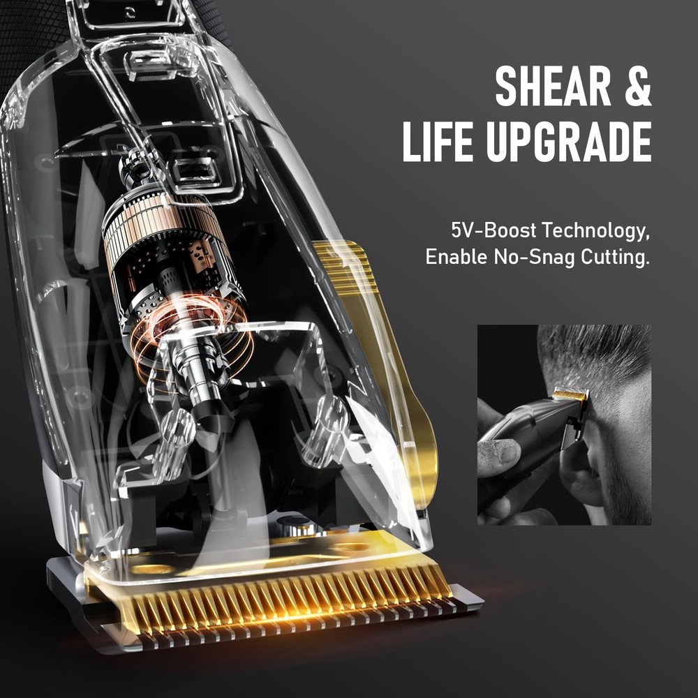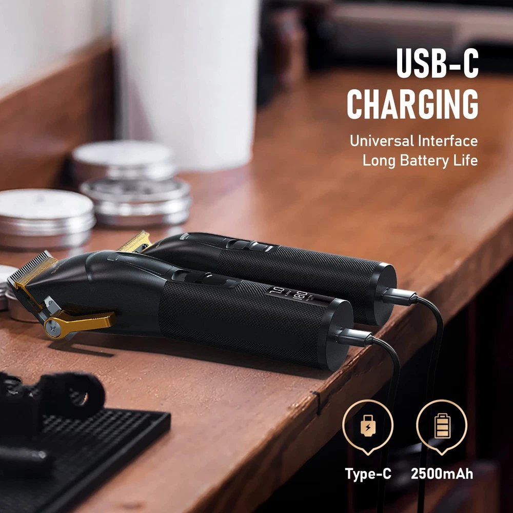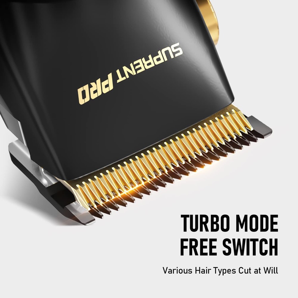 LUXURY PROFESSIONAL HAIR CLIPPERS - The cordless hair clippers include a clipper and trimmer to provide barbers with precise trimming (0.2mm-20mm). The adjustable lever length is 0.8mm/1.2mm/1.6mm/2.0mm making it easy to cut all types and lengths of hair and the trimmer is suitable for art carving/tapering/blending/fading, etc. With 8 guards for hair cutting and 4 guards for detail trimming, you can more easily control the trim length, ideal for all barbers and stylists. BLADES for BARBER'S NEED - Our professional hair clippers are equipped with market-leading powdered ink metallurgical high corrosion resistant fixed blades for ultra sharp and wear resistance. Naturally lubricated and extremely rust-free ceramic titanium-coated dynamic blades are slowly heated for long-lasting power. ADJUSTABLE & STRONGER MOTOR- TURBO mode is available at 2 speeds to meet the power requirements in different scenarios. The advanced high torque engine with 5V-Boost tech maintains stable power during cutting, delivers maximum power when working with coarse dense hair. Equipped with a charging protection device to ensure charging safety. LONG LIFE LI-ION BATTERY & LED SMART DISPLAY - 2500mAh high-capacity battery can easily work all day per charge. It supports USB-C cord/cordless use, so you don't need to worry about power outages at work. The ultra high definition LED display clearly shows speed and working time, ensuring you do a full day's work. COMFORT & CONTROL - To enhance the user experience, the knurled barbell grip is waterproof and oil resistant, so you won't have to slide or accidentally drop it while using it. The grip is slotted on both sides to actively adapt to the palm structure for optimum control and comfort, making it easier to change and adjust. WARM TIPS - 1. When charging, please use a power adapter with an input voltage not higher than 5V 1A (not included) to ensure safety and efficiency. 2. It is recommended to drip oil on the blade after every 3-5 times of use to keep the blade sharp, and it can also alleviate possible problems such as heat and noise to a certain extent. 3. It is recommended to replace the SUPRENT Replacement Blade regularly.4.The style of the packing box and hair cutting cape is random.