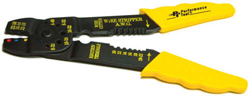 Wire cutter, bolt cutter, terminal crimper and wire stripper in one handy tool Black anodized finish with insulated hand grips Includes assorted terminals Display packaged
