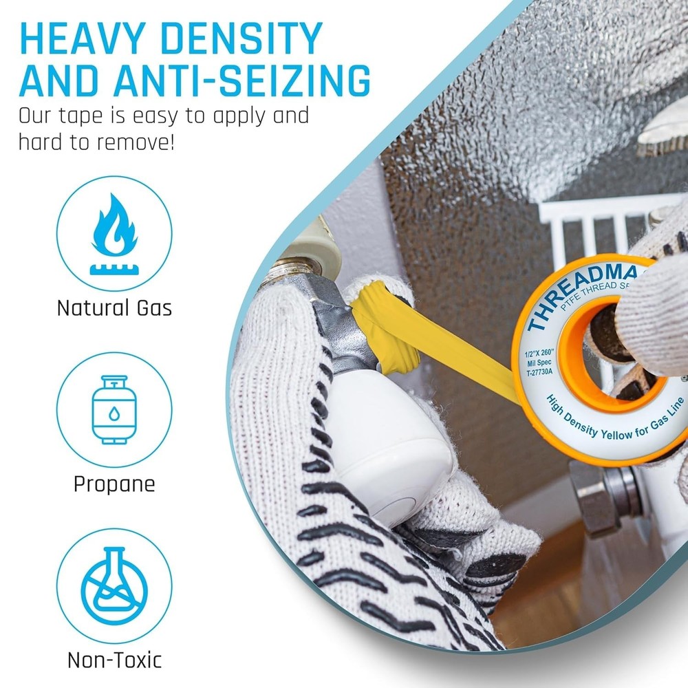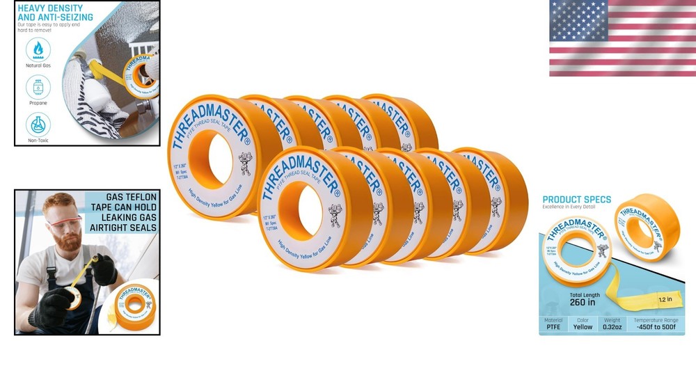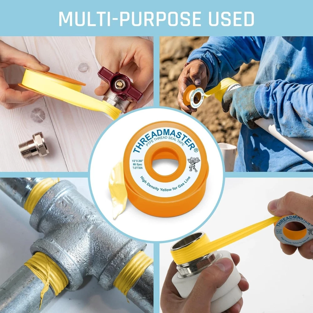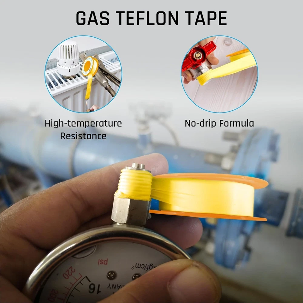 Professional-Grade Plumbers Tape for Gas Pipes - Pack of 10 Elevate your plumbing projects with our professional-grade gas line tape, designed specifically for effortless application and superior sealing capabilities. This essential tool ensures optimal safety and reliability, making it the preferred choice of both professional plumbers and DIY enthusiasts. Key Features: Easy Application: Smooth and user-friendly design for a seamless sealing experience. Durable Seal: Provides long-lasting protection against leaks with robust tensile strength. Distinct Yellow Color: High visibility ensures accurate application, while signifying compatibility with gas-related projects. Versatile Compatibility: Perfectly suited for all sizes of gas pipes, ideal for propane, natural gas, butane, and more. Professional-Grade Quality: Trusted by experts for its reliability and effective sealing performance. Benefits: Effortlessly seal gas pipes and connections with confidence. Maintain a safe environment with a tape designed for gas-related applications. Versatile use for both domestic and industrial tasks. Enhanced durability for lasting results. Why Choose Our Professional-Grade Plumbers Tape? Ensure the integrity of your gas connections with our Professional-Grade Plumbers Tape. Engineered for both safety and ease of use, this tape provides a reliable barrier against leaks, making it a must-have for any plumbing project. Whether you're tackling a home improvement task or working in an industrial setting, our gas line tape delivers exceptional performance every time. Don't compromise on safety—opt for a sealing solution you can trust. Order your pack of 10 today and experience the difference in quality and reliability that sets our tape apart! Unit Quantity: 10 Type: Pipe Thread Sealant Tape Unit Type: Unit