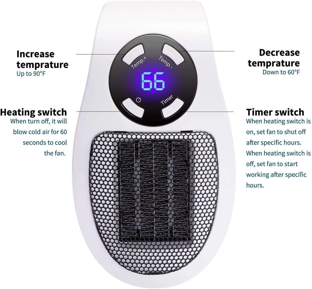 Brand GiveBest Special Feature Programmable Thermostat, Manual Thermostat, Adjustable Temperature, Overheat Protection, Digital Display, Noiseless, Portable, Remote Control, Lightweight Programmable Thermostat, Manual Thermostat, Adjustable Temperature, Overheat Protection, Digital Display, Noiseless, Portable, Remote Control, Lightweight Color White, Black Form Factor Dish Indoor/Outdoor Usage Indoor Power Source Corded Electric Heating Method Convection Item Weight 1.1 Pounds Heat Output 450 Watts About this item Low Energy Consumption: The heater runs on 450-watt low wattage, more energy-saving and cost-effective than those high power-consuming space heaters. Besides, it will not overload the electrical circuit. Great for people living in a mild climate Adjustable Temperature and LED Display: The temperature is adjustable from 60°F to 90°F, and it will display on the LED screen giving you a clear picture 180° Rotatable Plug: The plug of the space heater is able to rotate 180° to accommodate power sockets in different condition and positions. If your power outlet is upside down, just rotate the plug to fit the outlet Built-in Timer: This ceramic space heater for indoor use is designed with a timer function from 1 to 12 hours in 1-hour increment. Simply press the " Timer " button to set the desired time Safety Overheat Protection: Made of quality-assured flame retardant material, this electric heater achieves zero safety hazard. Overheat protection will shut heater off automatically when overheating