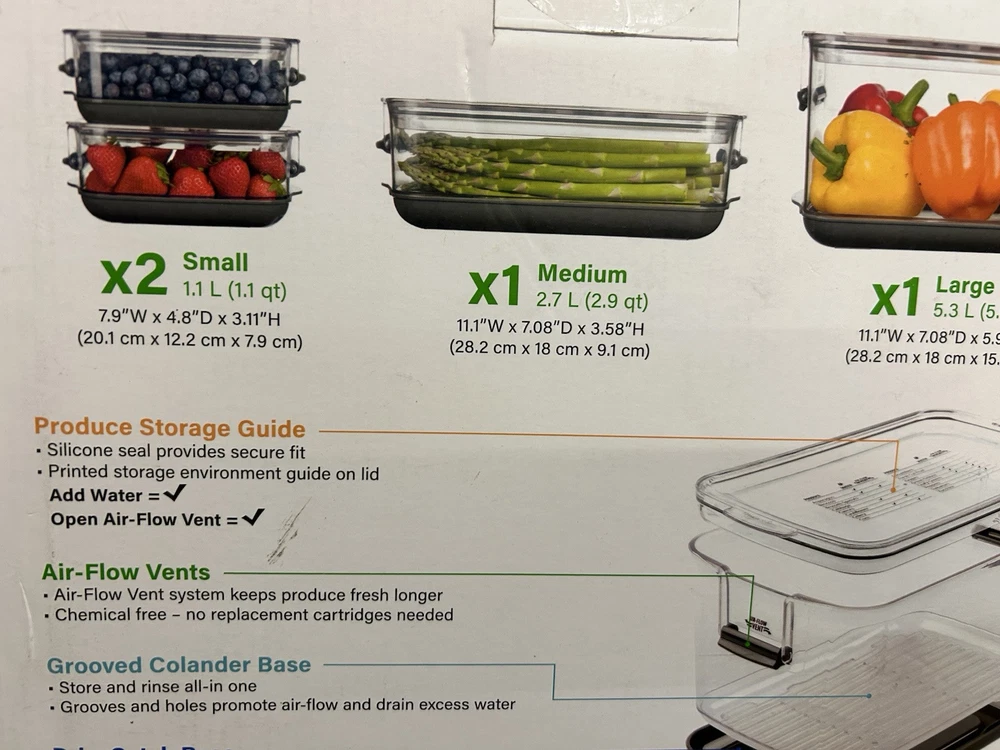 Brand Kirkland Signature Colour Clear Material Plastic Material feature Hand Wash Only Product dimensions 38.1L x 63.5W x 38.1H centimetres Recommended product uses Fruit, Vegetable, Herb Special features Air Tight Container Shape Rectangular Closure type Snap Is dishwasher-safe No