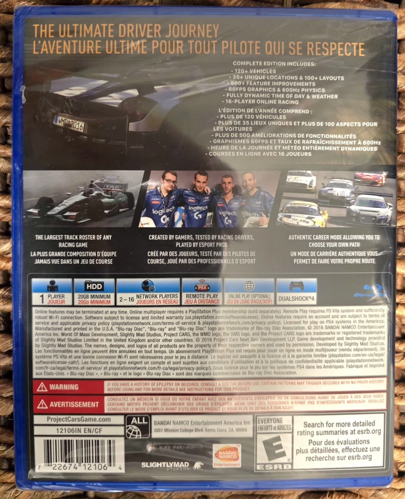 Game Name Edition:Complete EditionControl Elements:Gamepad/Joystick, Steering WheelRating:E-EveryoneUPC:0722674121064Game Name:Project Cars: Complete Edition, Project CARSGenre:RacingRelease Year:2016Country/Region of Manufacture:USAPublisher:Slightly MAD StudiosNumber of Players:1-16Platform:Sony PlayStation 4gtin13:0722674121064brand:Slightly MAD Studios