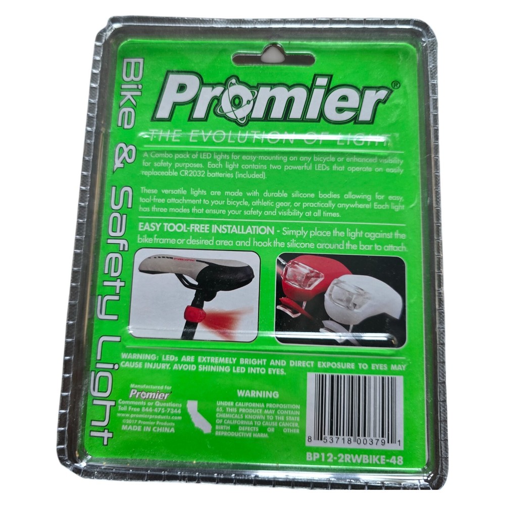 This is a Promier Clip-On Light designed for bikes and safety with 3 lighting modes - continuous, slow strobe, and fast strobe. The light features ultra-bright LED bulbs and is weather-resistant. The product is new and unopened. It is a versatile accessory for cycling and outdoor activities. Batteries ARE included (2 cell CR2032). Body is flexible silicone, has 70 hours of battery run time, and 3 lighting modes. Compact, affordable, attaches anywhere, and easy to install.
