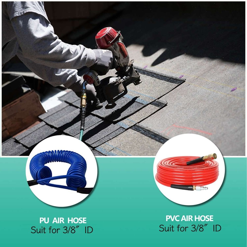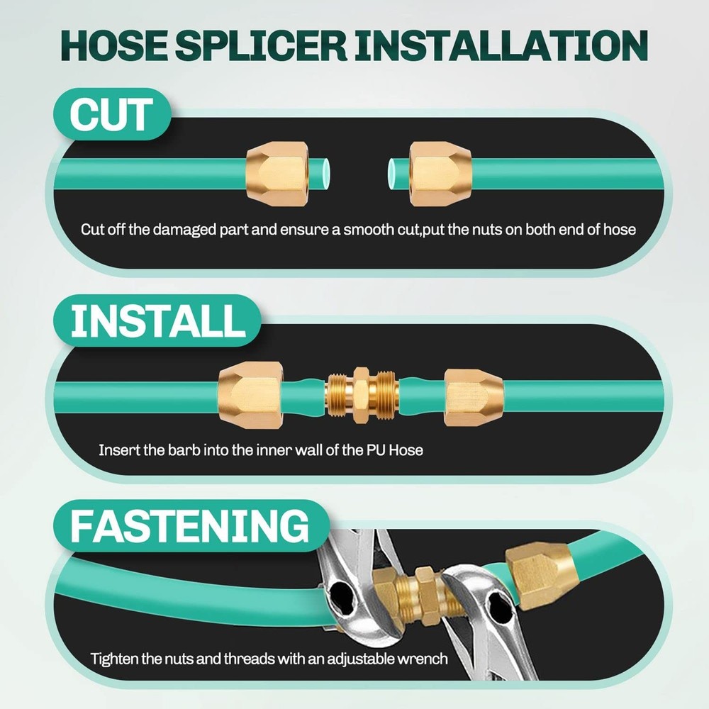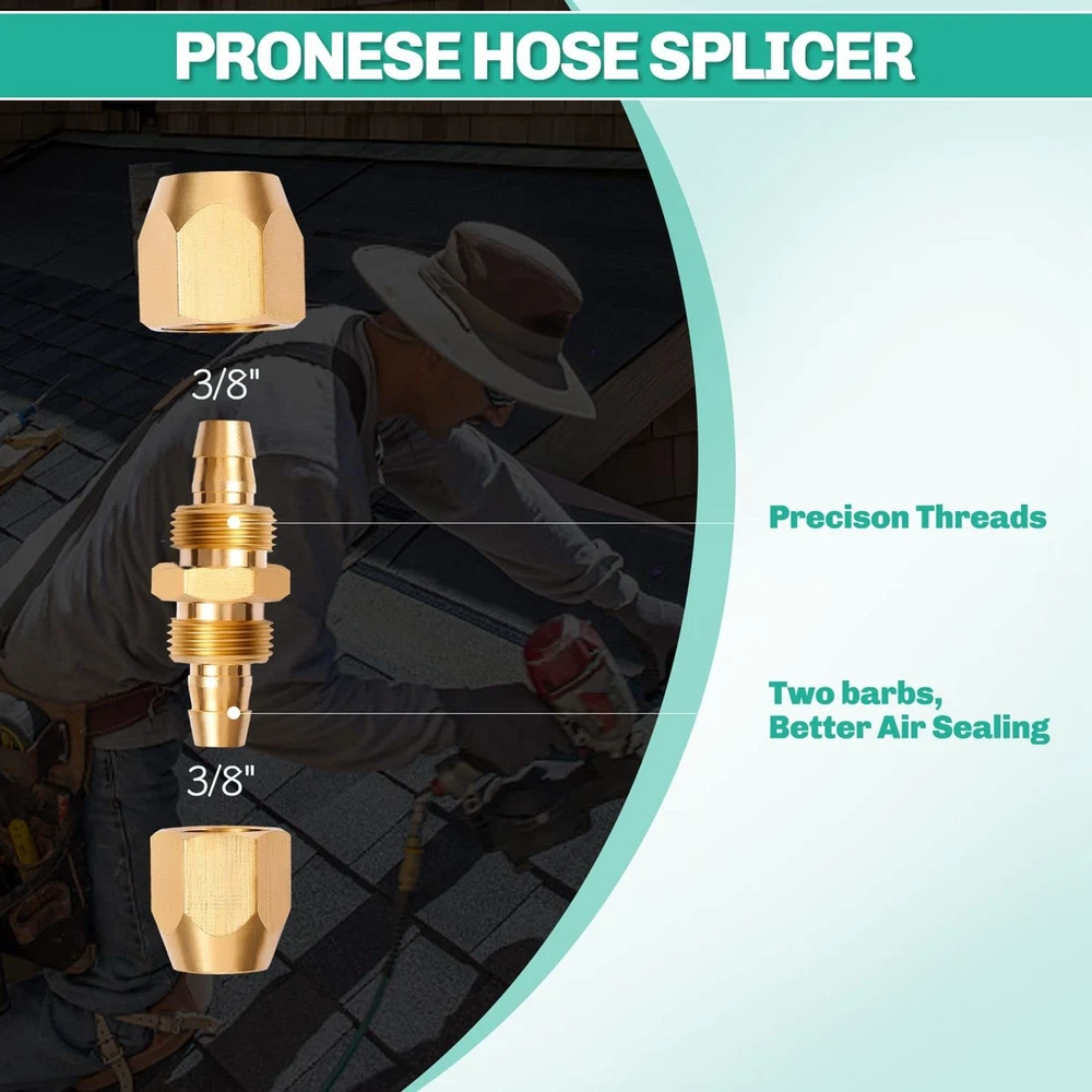 Pronese 2 Pack Soild Brass HPT Air Reusable Hose 3/8 Inch PU PVC, Product Details Applications: Suitable for plastic air hoses such as PU PVC, 3/8" barb can work for 3/8"ID x 1/2" OD or 9/16"OD (14x10mm) hose. If your air hose is rubber,please check the size befor buying! SIZE: Barb Size--3/8 inch x 3/8 inch,Maximum pressure rating of 300 psi,Temperature range of -40 to +250 degrees F. Introduction: With these fittings, hoses can be customized to any length, allowing your jobsite needs to be met.Durable design means our fittings can be used in any environment, from home garages to professional auto shops. Material: Solid Brass construction. Durable Brass for corrosion resistance, ductility at high temperatures, and low magnetic permeability. Package Include: 2Pack 3/8 inch x 3/8 inch Hose Splicer with 1pcs teflon tape. Specification:1. Easy to disassemble no flaring tool required.2. This fitting is made of brass for corrosion resistance, ductility at high temperatures, and low magnetic permeability.3. Fitting body and 2 nuts for splicing damaged hose.4.Very easliy to install.Package includes:2Pack 3/8 inch x 3/8 inch Hose Splicer with 1pcs teflon tape.★ Fits:Suitable for plastic air hoses such as PU PVC, 1/4" barb can work for 1/4"ID x 3/8" OD(10x6.4mm) hose or 5/16"ID x 15/32"OD(12x8mm) hose. If your air hose is rubber,please check the size befor buying!Suitable for plastic air hoses such as PU PVC, 3/8" barb can work for 3/8"ID x 1/2" OD or 9/16"OD (14x10mm) hose. If your air hose is rubber,please check the size befor buying!