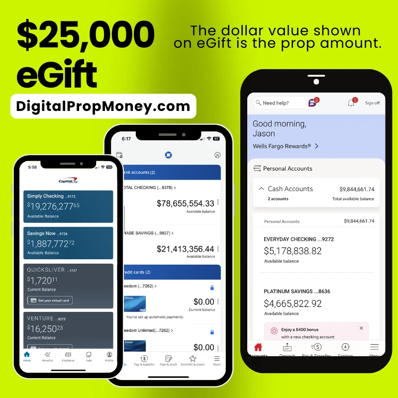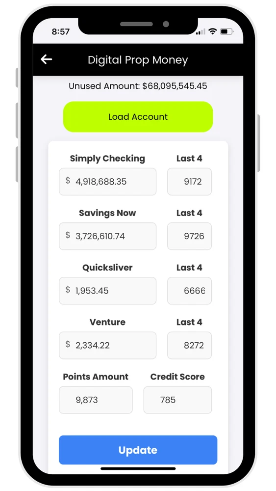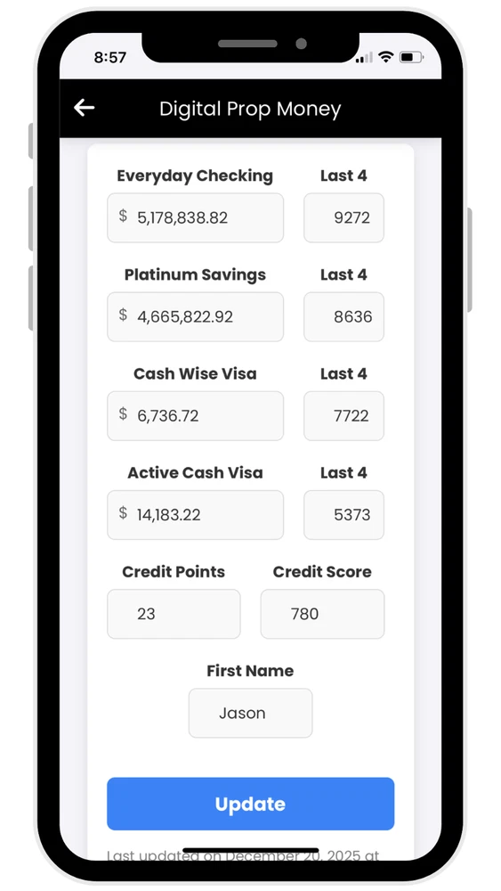 Prop Money App - eBay Listing DigitalPropMoney.com • eGift Card NO EXPIRATION DATE 💸 ADD MILLIONS TO YOUR ACCOUNT 💸 This listing is for the Digital Prop Money eGift Card. Signup for FREE at DigitalPropMoney.com and receive $100 FREE . Use this card to load your digital prop money to your account, which allows you to customize and display virtual balances across multiple prop accounts. The digital prop money does not expire, and your balances will remain accessible indefinitely. 💸 Prepaid Load Card $10,000 - $1,000,000 💸 Prank your friends with realistic prop balances or use for motion pictures and demonstrations! Digital Prop Money is an efficient and affordable alternative to physical prop money. Save the app by visiting DigitalPropMoney.com, then add it to your home screen. You can update and display digital prop funds on your phone, showcasing your prop accounts, credit cards, credit scores, and reward points for entertainment! eGift Card number with PIN enclosed will be messaged to buyer after purchased to use instantly and also shipped to the buyer for convenience and security. Important: The Digital Prop Money is for entertainment purposes only, showing simulated balances and credit scores . This app is not a functional banking tool. Key Features: Realistic Digital Displays: Showcase virtual account balances and credit scores for entertainment or professional use. Ideal for Entertainment and Media: Perfect for pranks, movies, and live demonstrations. Accessible Anywhere: Save the app to your phone and access it wherever you go. Auto Login: Keeps users logged in to their prop accounts for a seamless experience. 💸 Hot Seller Item 💸
