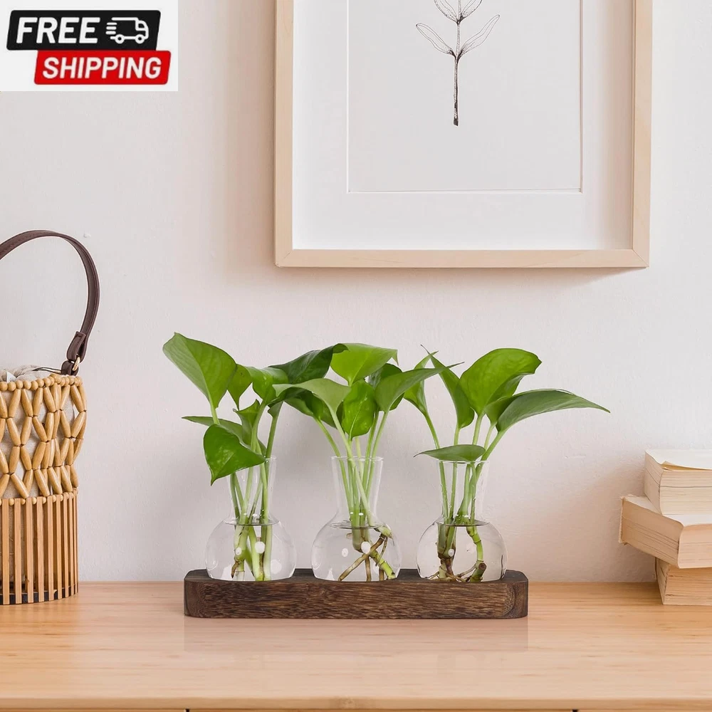 Propagation Stations,Plant Propagation Vase,Desk Plant Terrarium with Retro Wooden Stand,Plant Lover Gifts for Women for Hydroponics Plants Home Garden Wedding Decor(3 Vase) 【Plant Propagation Stations】This desktop propagation vases for plants is perfect for hydroponics, air plants, and flowers, and it also helps purify the air and create a relaxing atmosphere. Who likes plants and enjoy life will love it at a glance. 【Stylish Design】The groove design of the wooden tray is combined with a flat bottomed light bulb vase. Compared to other wall mounted bulb vases, it does not restrict plant growth and is easier to carry and exchange water. 【Retro Home Office Decor】Simple and elegant style plant propagation suit any style room. Add nice touch to your house, put it on window sill, coffee table, living room, ding room, kitchen, dormitory and bedroom. It will be more beautiful and eye-catching if you fill the bottle with colored water or some cobbles. 【Best gifts for women plant lovers】Mother's Day, birthday, Christmas, Valentine’s Day, Thanksgiving gift ideas. Nice present to your nature-loving, gardeners. Sweet wedding party, anniversary, and special occasions decoration gifts. 【Size】Wooden tray: 9.5'' L x 2.8'' W x 1'' H, Vase: 2.8"D x 3.9"H; Opening Diameter is 1.4". No need to install, can be used directly, the product should be placed in the no-sunlight to use.Note: Can not be placed in the sun! 【Service Guarantee】Customers First. We are responsible for any damage during transportation. If you have any questions, contact us through Amazon please. We will serve you wholeheartedly until you are satisfied. Product Description YIBOT Bring green into your life It really is cute,The glass is very clear and sit perfectly into the grooves in the wood base, which adds to the appeal, and the dark wood base has a rustic classiness to it. Gifts for Women This is an perfect desktop glass bulb vase for plant's propagations and cuttings, use to propagate baby plants. It is suitable for display fresh flower, hydroponics plants. Make a great gift for the plant-lover in your life. YIBOT Plants Propagation Stations Plant Terrarium With Wooden Stand Package Contents: 3x Glass Vase 1 x Wooden Tray 3 bottle wooden tray size: 9.5'' L x 2.8'' W x 1'' H Vase: 2.8"D x 4"H Material: Wood, Glass Note: No plants or other decorative objects included in this item! Note: Can not be placed in the sun! Best Gift for Plant lover Desktop Propagation station with retro style great for floral arrangement, home or office decoration as well as various gift ideas. Plant Gifts for Plant Lovers Women Best gifts for women plant lovers,suitable for various festivals such as: Mother's Day, birthday, Christmas, Valentine’s Day, Thanksgiving gift ideas. Shipping Fast shipping is very important for us. Our standard US shipping service is FREE. Your order will be shipped within 2-3 business days upon full payment received. Your order will be delivered within 2-3 business days after the handling time. We only ship to the confirmed PayPal address. We reserve the right to cancel any order for any reason at any time. We are not responsible for undeliverable addresses. Returns and payment We offer a 30 days return policy from checkout winning date. We allow only PayPal as payment method FeedBack Your feedback very important to us, after you get your package and you are satisfied with our service please leave us positive feedback If you have any problem with your order / any questions please before leave any type of feedback For any questions, using eBay contact system Please visit our eBay store to check out other items for sale! Thank you for shopping at our store.