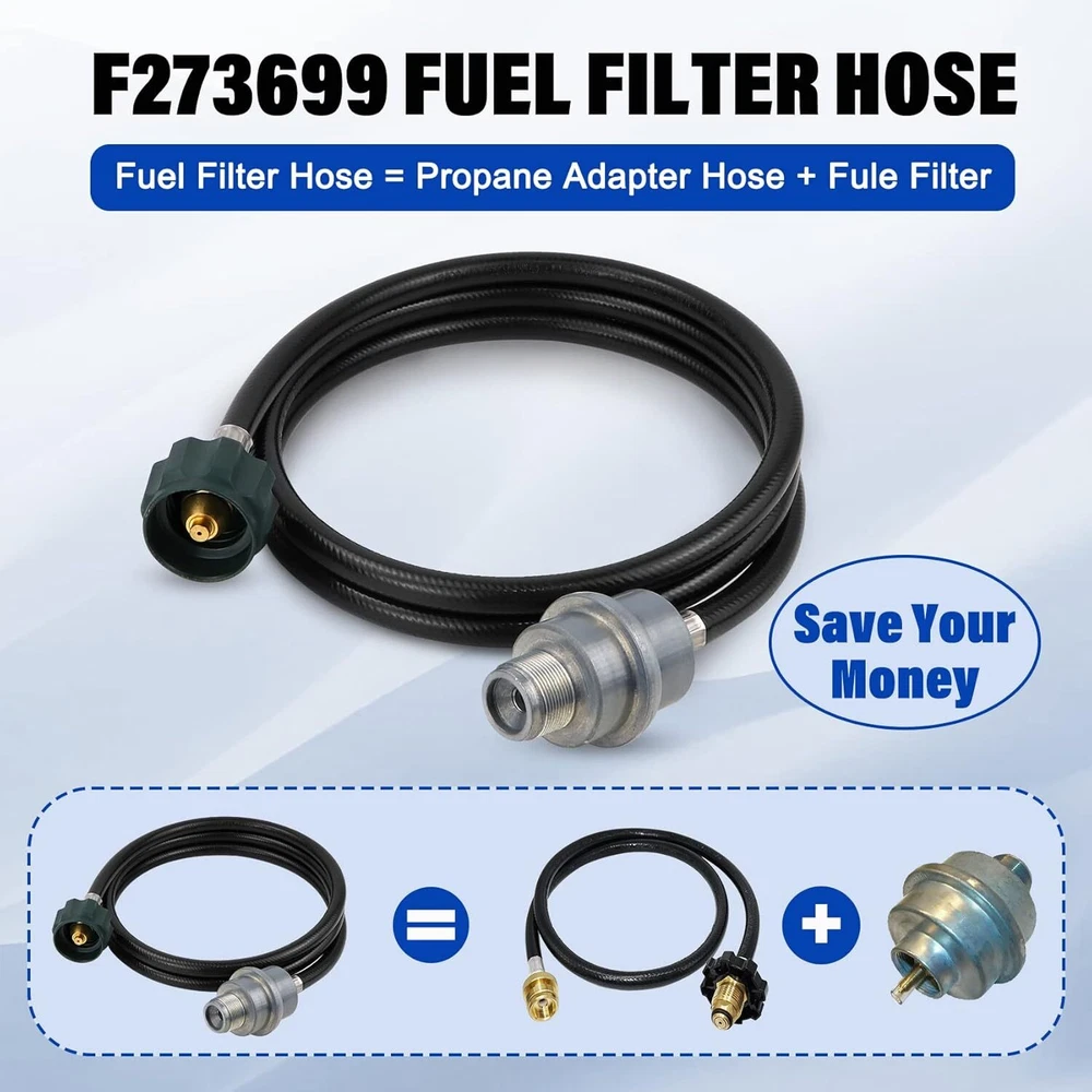 More Convenient: The Universal Fuel Filter with Hose is for the Portable, Big, and Tough Buddy Heaters in use with a bulk propane cylinder. No need for additional propane adapter hose. Convenient and save your money. For Use With: Fuel Filter F273699 Filtering Propane Servicing a Source, For Mr heater Buddy and Big Buddy 6351206, 6351207, 6351200, F273701, F273702, F232000, F274800, F23203 6FT Propane Adapter Hose:The hose with a QCC1/Type1 adapter, can connect directly to 20-45 lb propane tanks and ensure air tightness. and ensure air tightness. Allows you to use portable heaters more conveniently, quickly and safely. Professional Quality: Our products use high-quality raw materials. the filter is made of high quality steel. The tube adopts a three-layer structure, the outer layer is rubber, the galvanized steel support, and the inner layer is PVC. The joint is made of Solid brass. The product has passed the CSA professional certification, which is safe and durable. 1 Year Warranty: We provide 100% Satisfaction Guarantee. If you have any problem after receiving this item, please don't hesitate to contact us, we resolve all issues in 24 hours. Product Description 1 step1 2 step 2