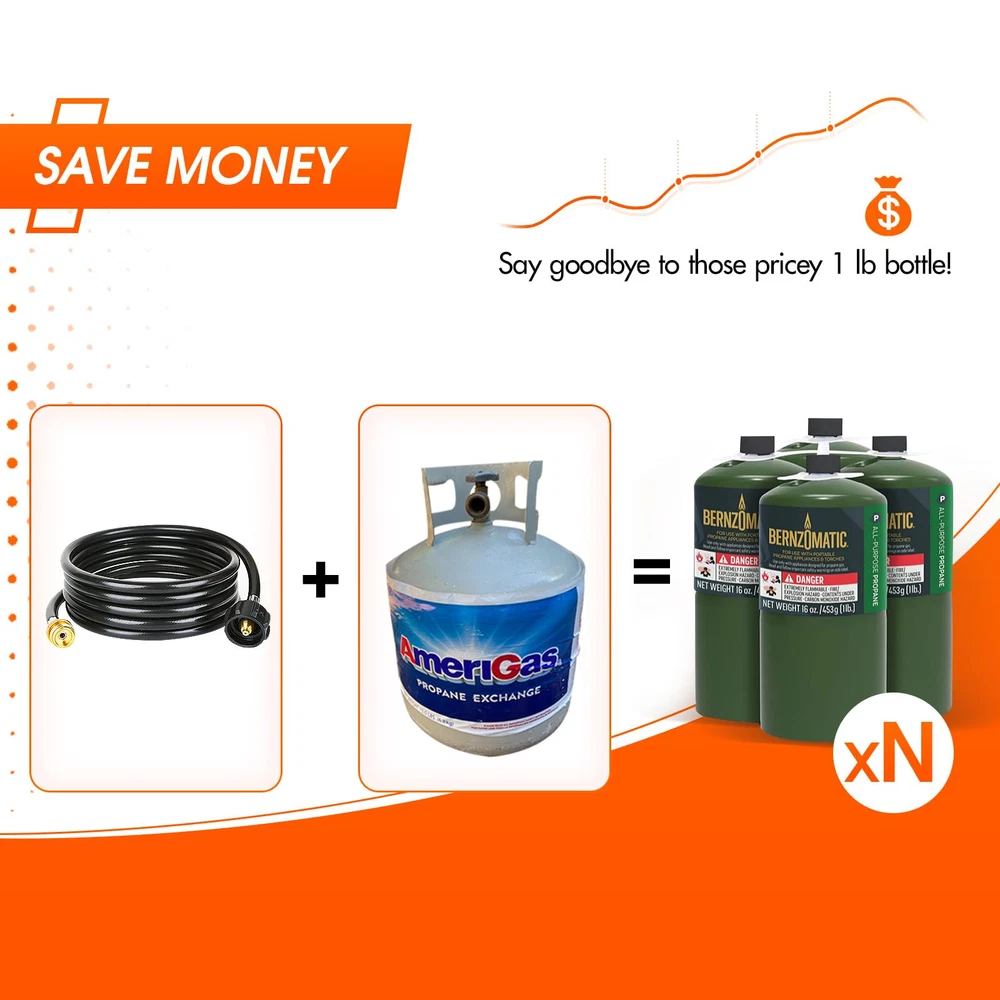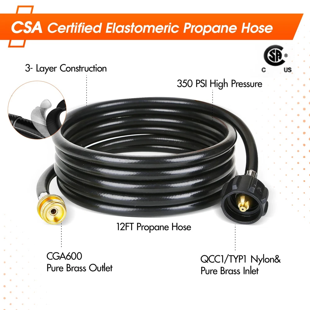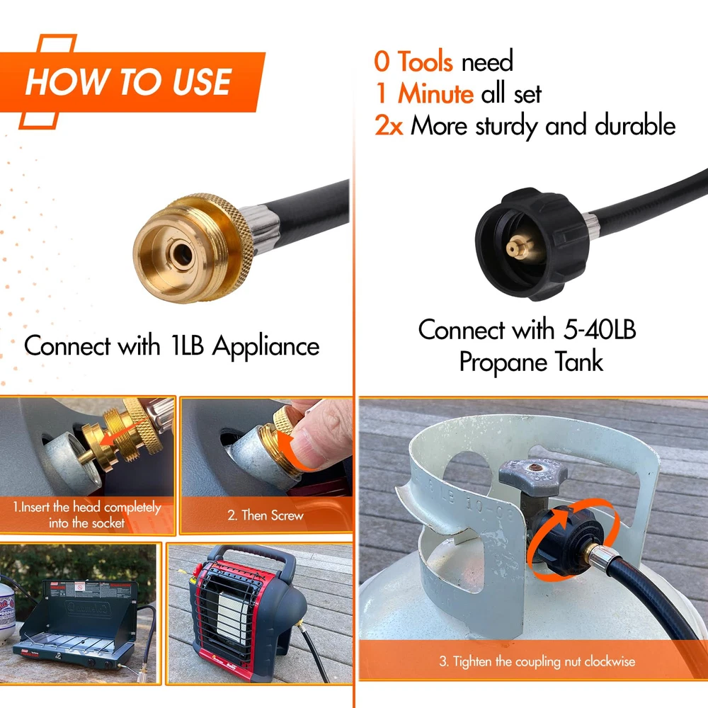 š„ćEasy Installation Propane Converter HosećOur 1lb to 20lb propane tank adapter hose with a 12ft length, is easy to install. No tools are needed; simply tighten the brass connectors by hand. In just one minute, you'll be all set and ready to use it right away. ļ¼Please ensure that your 1lb propane appliance can be connected to a CGA600 connector, before making your purchase. ļ¼ š„ć Versatile Propane Adapter Hose ćpropane heater hose is specifically designed for 1-pound appliances to connect to 5 to 40-pound propane tanks. This propane adapter 20lb to 1lb converter is fit for Buddy heaters/Weber Q grills/Coleman camping stoves/Blackstone 17" & 22" griddles (a regulator is required), and table heaters. Our propane heater hose is an ideal choice for camping, tailgating, heating, or outdoor grilling. š„ćEco-Friendly Propane Hose AdapterćThe 20lb to 1lb propane adapter provides a sustainable alternative for your 1lb propane appliances. By utilizing our propane conversion hose with a 20LB propane tank, you can significantly reduce single-use waste from disposable propane bottles. This adapter hose promotes environmental conservation by encouraging the reuse of larger propane containers, contributing to a greener planet. š„ćHigh-Pressure Propane Hose with Leakage-Proof DesignćThis propane converter hose is well-crafted with pure brass fittings, ensuring an airtight and leak-free connection during use. And our High pressure(max 350PSI) elastomeric hose consists 3 layers: weather-resistant layer, highly tensile cotton braiding, and anti-corrosion layer. With its durable and flexible structure, our propane heater hose is endure challenging outdoor conditions, making it perfect for outdoor propane grills. š„ćCSA Certified Propane Tank Hosećpropane hose adapter 1lb to 20lb is CSA certified and crafted with high-quality materials, ensuring its durability and safety during use. Additionally, we are committed to providing superior product and best service. If you encounter any post-purchase issues, our professional support team is available to assist you at any time.