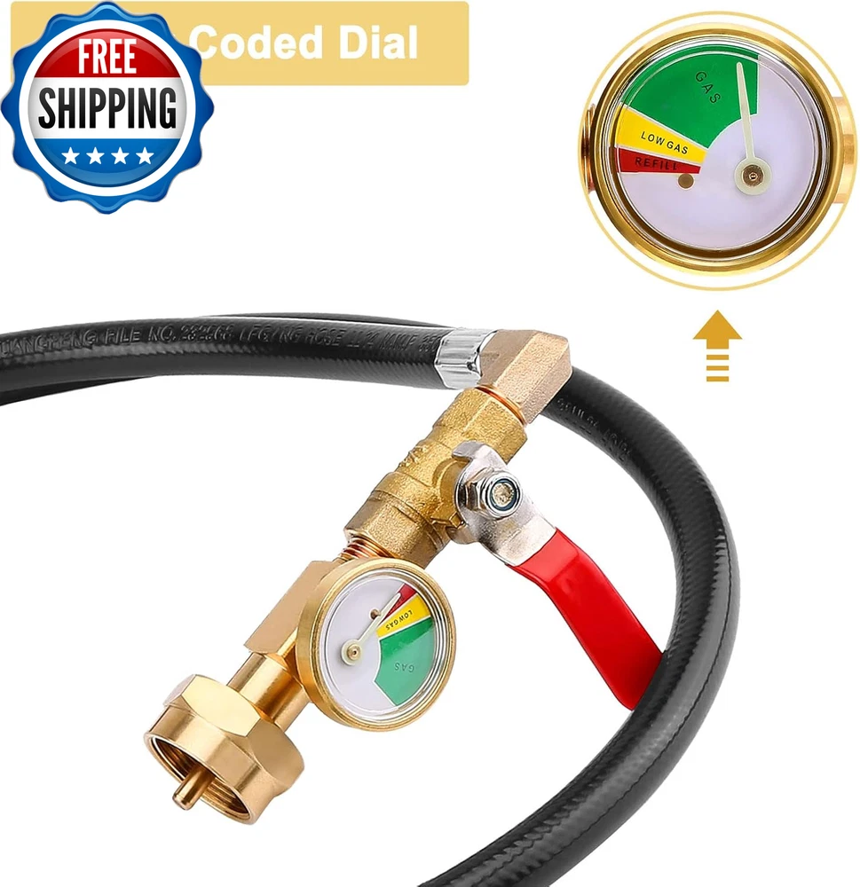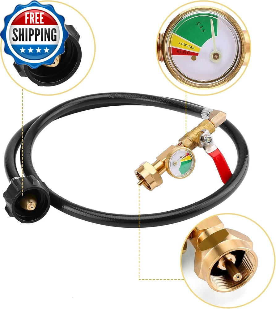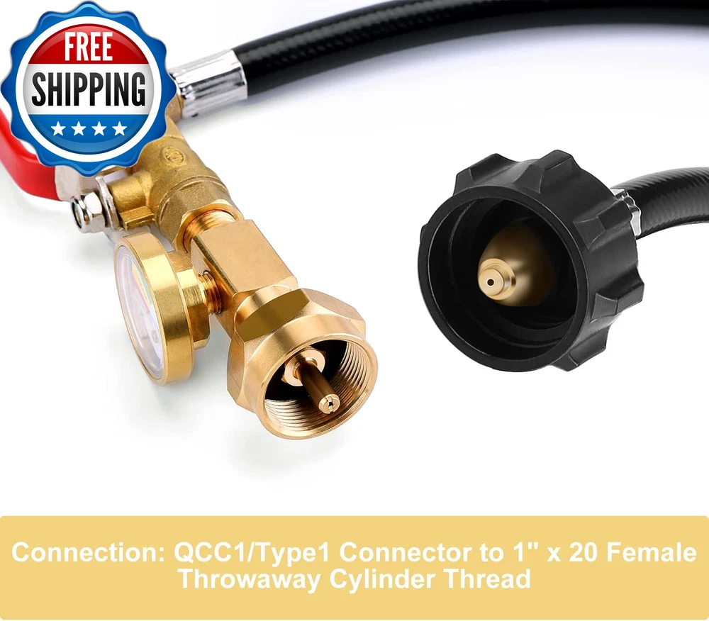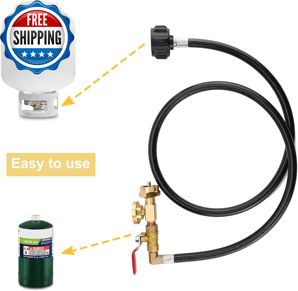 Propane Refill Adapter Hose with Gauge, 4 FT/48 Inch Propane Tank Refill Adapter Extension Hose for 1LB Propane Gas Tanks with On/Off Control Valve, 2X 1Lb Propane Bottle Caps Included 【4 Feet Propane Refill Hose】WADEO Propane Refill Adapter Hose is great for refilling your small 1lb propane cylinders with big tanks. Compared with other propane refill hoses,our adapter hose is much longer (48 in/ 4 FT), making it easier and more convenient to connect tanks without moving or carrying them. Ideal for camping, tailgating, heating needs or having an outdoor cooking. 【Premium Material】Our propane refill adapter for 1 lb tanks is made of high quality rubber and solid brass to ensure secure connection and withstand weather, scratching, denting and corroding, more flexible and durable to maintain long-lasting good performance. Hose rated pressure: 350 PSI. 【Easy to Install and Control】Easy install by connecting the side with QCC1 connection to 20-50 lb propane tanks and then the other side with control valve to 1lb small cylinders. With valve for easy control of refilling process and preventing leaking when not use. Please note to open gas for a few minutes before connecting to small cylinder, or it won’t start the refilling due to overflow protection. 【Upgraded With Gauge For Accurate Reading】Specially designed with a gauge at the side connect with 1 lb propane tank, our propane refill adapter hose allows you to read and monitor the gas volume in your 1 lb propane cylinder more accurately than using any other propane hose with gauge at the QCC end. Luminous pointer and gas level indicator make it easy to read even in the dark. 【Additional 1 LB Propane Bottle Caps】Come with 2x 1 LB propane bottle caps, which are useful for your camping stoves, home applications, barbecue, propane heater or others equipment that use 1 lb propane tank. You don't need to spend extra money to buy the caps. Product Description WADEO 4FT Propane Refill Adapter Hose with ON-OFF Control Valve Designed to easily fill your small 1 LB propane cylinders to big propane tank without moving or carrying the heavy gas bottle. Easily and conveniently refill your small propane bottles with our Propane Refill Adapter Hose, not only save you money and time, but also help to eliminate unnecessary waste and protect the environment. Come with 2x 1 LB Propane Bottle Caps You don't need to spend extra money to buy the caps. Useful for your camping stoves, home applications, barbecue, propane heater or others equipment that use 1 lb propane tank. Specifications Length: 4FT (48 inch) Hose rated pressure: 350PSI. Connection: QCC1/Type1 Connector to 1" x 20 Female Throwaway Cylinder Thread Material: Rubber Hose and Solid Brass Completed with ON-Off Control Valve Note: 1 lb tanks that are refilled reach a maximum of 80-90% capacity. No propane tank is completely filled to allow for heat expansion. Over Flow Protection Over flow protection device is designed in the QCC adapter. Please connect the QCC1 adapter to your tank first and open gas for few seconds before connect the 1 lb adapter to your small tanks, or it may not work. QCC1/Type 1 Connector to 1'' x 20 Female Throwaway Cylinder Thread Solid brass Corrosion resistance and long lasting Precise thread of the adapter ensures tight connection with tanks and smooth operation. Upgraded With Gauge For Accurate Reading Specially designed with a gauge at the side connect with 1lb propane tank Monitor the gas volume in your 1lb propane cylinder more accurately than using any other propane hose with gauge at the QCC end. Luminous pointer and gas level indicator make it easy to read even in the dark. Easy Control and Overflow Protection With valve for easy control of refilling process and preventing leaking when not use. Instructions Place the big propane tank in the sun for 2hrs or more. Place the 1lb propane cylinder in the freezer for 30 mins or more!! The most important step) Make sure the big propane tank valve is shut off then insert the black end of adapter hose install on a big tank. Turn on red control valve few second then turn off ( open gas for a few seconds after that because of the overflow protection. Or it may not work.) Screw in the 1 lb tank clockwise into the adapter hose. Turn the big tank upside down. Slightly open the big tank valve (do not open all the way, just a little). If you are having issues reaching the valve, slightly tip the tank back to expose BBQ valve. Allow about 10~15 mins to fill (it may take longer in some cases). You can control the filling process easily by the red control valve. Shut the BBQ valve and remove the 1lb cylinder. Your 1lb cylinder tank is ready for use! Troubleshooting: Not getting a full refill? Sometimes it takes longer to refill your tank. It's important to repeat steps 1 from the instructions before your second attempt. Refill > 30mins. The adapter valve will automatically cut off the flow of gas to avoid overfilling Still not working? Attempt to open the BBQ valve all the way following the steps above Wide Range of Application Our Propane Refill Adapter Hose is a great accessory for propane appliances like camping stove, propane heater, propane lantern, welding torch, etc. Save worry and better enjoy your camping, hiking, picnics, barbecue, and cookout. Batteries Required? No Maximum Pressure 350 Pound per Square Inch Color Black Material With Gauge Item Weight 0.55 Kilograms Batteries Included? No Item Length 4 Feet Shipping Fast shipping is very important for us. Our standard US shipping service is FREE. Your order will be shipped within 2-3 business days upon full payment received. Your order will be delivered within 2-3 business days after the handling time. We only ship to the confirmed PayPal address. We reserve the right to cancel any order for any reason at any time. We are not responsible for undeliverable addresses. Returns and payment We offer a 30 days return policy from checkout winning date. We allow on