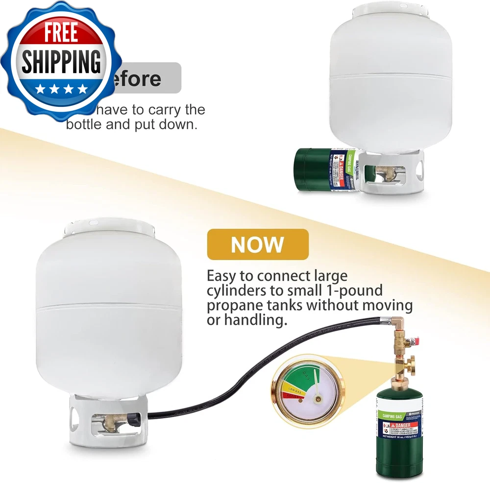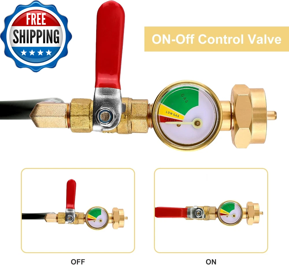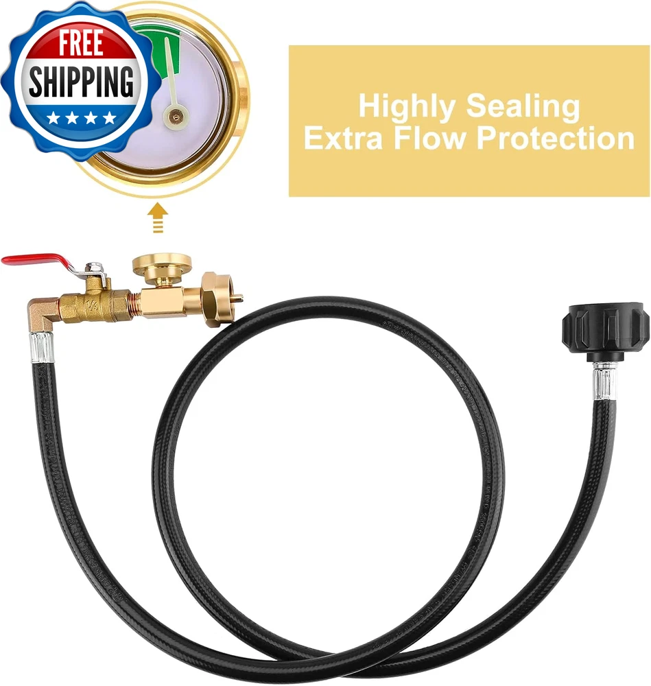 Propane Refill Adapter Hose with Gauge, 4 FT/48 Inch Propane Tank Refill Adapter Extension Hose for 1LB Propane Gas Tanks with On/Off Control Valve, 2X 1Lb Propane Bottle Caps Included 【4 Feet Propane Refill Hose】WADEO Propane Refill Adapter Hose is great for refilling your small 1lb propane cylinders with big tanks. Compared with other propane refill hoses,our adapter hose is much longer (48 in/ 4 FT), making it easier and more convenient to connect tanks without moving or carrying them. Ideal for camping, tailgating, heating needs or having an outdoor cooking. 【Premium Material】Our propane refill adapter for 1 lb tanks is made of high quality rubber and solid brass to ensure secure connection and withstand weather, scratching, denting and corroding, more flexible and durable to maintain long-lasting good performance. Hose rated pressure: 350 PSI. 【Easy to Install and Control】Easy install by connecting the side with QCC1 connection to 20-50 lb propane tanks and then the other side with control valve to 1lb small cylinders. With valve for easy control of refilling process and preventing leaking when not use. Please note to open gas for a few minutes before connecting to small cylinder, or it won’t start the refilling due to overflow protection. 【Upgraded With Gauge For Accurate Reading】Specially designed with a gauge at the side connect with 1 lb propane tank, our propane refill adapter hose allows you to read and monitor the gas volume in your 1 lb propane cylinder more accurately than using any other propane hose with gauge at the QCC end. Luminous pointer and gas level indicator make it easy to read even in the dark. 【Additional 1 LB Propane Bottle Caps】Come with 2x 1 LB propane bottle caps, which are useful for your camping stoves, home applications, barbecue, propane heater or others equipment that use 1 lb propane tank. You don't need to spend extra money to buy the caps. Product Description WADEO 4FT Propane Refill Adapter Hose with ON-OFF Control Valve Designed to easily fill your small 1 LB propane cylinders to big propane tank without moving or carrying the heavy gas bottle. Easily and conveniently refill your small propane bottles with our Propane Refill Adapter Hose, not only save you money and time, but also help to eliminate unnecessary waste and protect the environment. Come with 2x 1 LB Propane Bottle Caps You don't need to spend extra money to buy the caps. Useful for your camping stoves, home applications, barbecue, propane heater or others equipment that use 1 lb propane tank. Specifications Length: 4FT (48 inch) Hose rated pressure: 350PSI. Connection: QCC1/Type1 Connector to 1" x 20 Female Throwaway Cylinder Thread Material: Rubber Hose and Solid Brass Completed with ON-Off Control Valve Note: 1 lb tanks that are refilled reach a maximum of 80-90% capacity. No propane tank is completely filled to allow for heat expansion. Over Flow Protection Over flow protection device is designed in the QCC adapter. Please connect the QCC1 adapter to your tank first and open gas for few seconds before connect the 1 lb adapter to your small tanks, or it may not work. QCC1/Type 1 Connector to 1'' x 20 Female Throwaway Cylinder Thread Solid brass Corrosion resistance and long lasting Precise thread of the adapter ensures tight connection with tanks and smooth operation. Upgraded With Gauge For Accurate Reading Specially designed with a gauge at the side connect with 1lb propane tank Monitor the gas volume in your 1lb propane cylinder more accurately than using any other propane hose with gauge at the QCC end. Luminous pointer and gas level indicator make it easy to read even in the dark. Easy Control and Overflow Protection With valve for easy control of refilling process and preventing leaking when not use. Instructions Place the big propane tank in the sun for 2hrs or more. Place the 1lb propane cylinder in the freezer for 30 mins or more!! The most important step) Make sure the big propane tank valve is shut off then insert the black end of adapter hose install on a big tank. Turn on red control valve few second then turn off ( open gas for a few seconds after that because of the overflow protection. Or it may not work.) Screw in the 1 lb tank clockwise into the adapter hose. Turn the big tank upside down. Slightly open the big tank valve (do not open all the way, just a little). If you are having issues reaching the valve, slightly tip the tank back to expose BBQ valve. Allow about 10~15 mins to fill (it may take longer in some cases). You can control the filling process easily by the red control valve. Shut the BBQ valve and remove the 1lb cylinder. Your 1lb cylinder tank is ready for use! Troubleshooting: Not getting a full refill? Sometimes it takes longer to refill your tank. It's important to repeat steps 1 from the instructions before your second attempt. Refill > 30mins. The adapter valve will automatically cut off the flow of gas to avoid overfilling Still not working? Attempt to open the BBQ valve all the way following the steps above Wide Range of Application Our Propane Refill Adapter Hose is a great accessory for propane appliances like camping stove, propane heater, propane lantern, welding torch, etc. Save worry and better enjoy your camping, hiking, picnics, barbecue, and cookout. Batteries Required? No Maximum Pressure 350 Pound per Square Inch Color Black Material With Gauge Item Weight 0.55 Kilograms Batteries Included? No Item Length 4 Feet Shipping Fast shipping is very important for us. Our standard US shipping service is FREE. Your order will be shipped within 2-3 business days upon full payment received. Your order will be delivered within 2-3 business days after the handling time. We only ship to the confirmed PayPal address. We reserve the right to cancel any order for any reason at any time. We are not responsible for undeliverable addresses. Returns and payment We offer a 30 days return policy from checkout winning date. We allow on