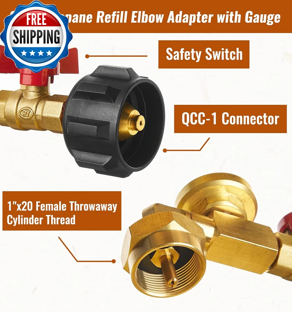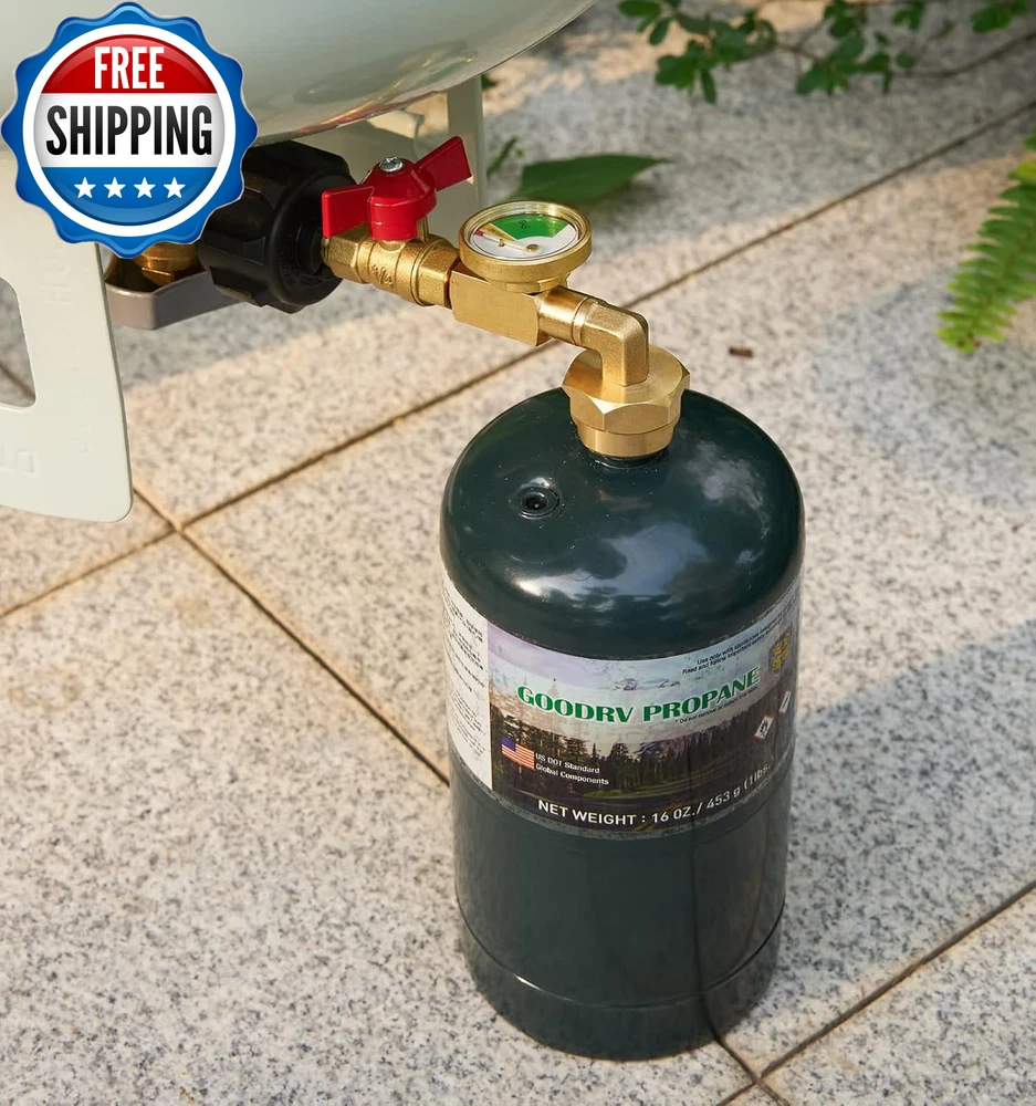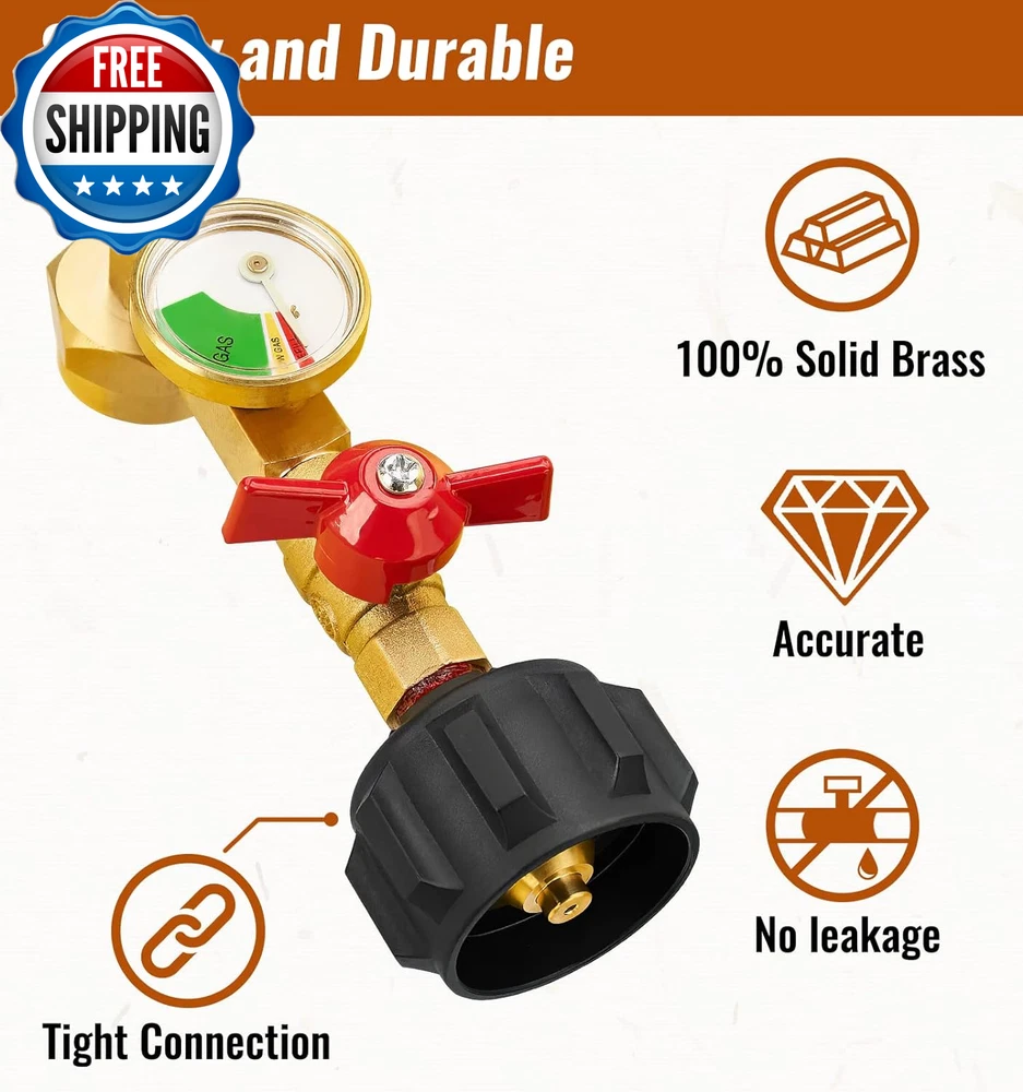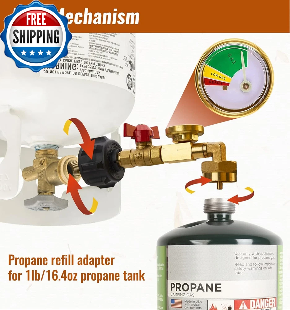 Propane Refill Adapter with Valve and Gauge, Fill 1 Pound Bottles from 20Lb Tank, Fits QCC1 / Type1 Propane Tank and 1 Lb Throwaway Disposable Cylinder Propane Bottle Connector Effortless Refilling - The 90-degree elbow design facilitates smooth gas flow to smaller cylinders, allowing for easy attachment to large tanks and 16oz tanks, enabling refills in just one minute. Enhanced Design - Equipped with a propane ON-OFF control valve, this adapter minimizes gas leaks during cylinder connections, allowing for safe and controlled refilling. Rapid Monitoring - Swiftly assess the remaining gas in your large tank to avoid any inconvenience caused by insufficient gas levels during the refilling process. Secure Construction - The corrosion-resistant solid brass material ensures superior sealing, while the integrated safety features effectively mitigate the risk of overfilling gas cylinders. User-Friendly Functionality - Refill your 1-pound bottles multiple times without the need for tools, ultimately reducing the expense associated with purchasing new green propane gas cylinders. Product Description CALPOSE Propane Refill Adapter, Fill 1 Pound Bottles from 20lb Tank, Fits QCC1 / Type1 Propane Tank and 1 lb Throwaway Disposable Cylinder Specifications Fuel Type: Propane Material: Solid Brass Upgrade:with valve and gauge Inlet: QCC-1 Outlet: 1"-20 Female Throwaway Cylinder Installation Steps Step 1. Screw the propane refill adapter on the big tank. Step 2. Screw the 1lb propane tank on the adapter. Step 3. Flip the big tank over, then open the valve and it starts refilling. Note: ONLY used for outdoors. Valve Type Ball Valve Part Number PRA2 Item dimensions L x W x H 1.5 x 1.5 x 2.5 inches Power Source propane Color Golden Material Brass Country of Origin China Batteries Required? No Item Weight 8.1 ounces Number of Ports 2 Batteries Included? No Outlet Connection Type Threaded Item model number PRA2 Exterior Finish Brass Product Dimensions 1.5 x 1.5 x 2.5 inches Shipping Fast shipping is very important for us. Our standard US shipping service is FREE. Your order will be shipped within 2-3 business days upon full payment received. Your order will be delivered within 2-3 business days after the handling time. We only ship to the confirmed PayPal address. We reserve the right to cancel any order for any reason at any time. We are not responsible for undeliverable addresses. Returns and payment We offer a 30 days return policy from checkout winning date. We allow only PayPal as payment method FeedBack Your feedback very important to us, after you get your package and you are satisfied with our service please leave us positive feedback If you have any problem with your order / any questions please before leave any type of feedback Please visit our eBay store to check out other items for sale! Thank you for shopping at our store.