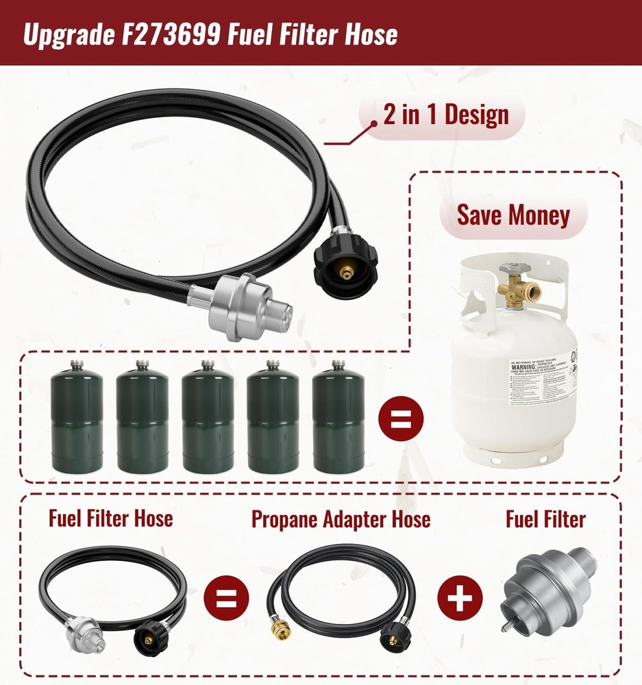 1. This propane fuel filter kit is a game-changer for my Mr. Heater Buddy! The dual-function design with built-in hose saves me time and hassle—no extra adapters needed for standard tanks. I love how it improves heater performance while protecting it from impurities. The CSA-certified construction feels sturdy and reliable, giving me peace of mind during winter camping trips. Installation took seconds, and I immediately noticed smoother operation. The heavy-duty hose resists kinking, making setup a breeze every time. Perfect upgrade for anyone using propane heaters regularly!