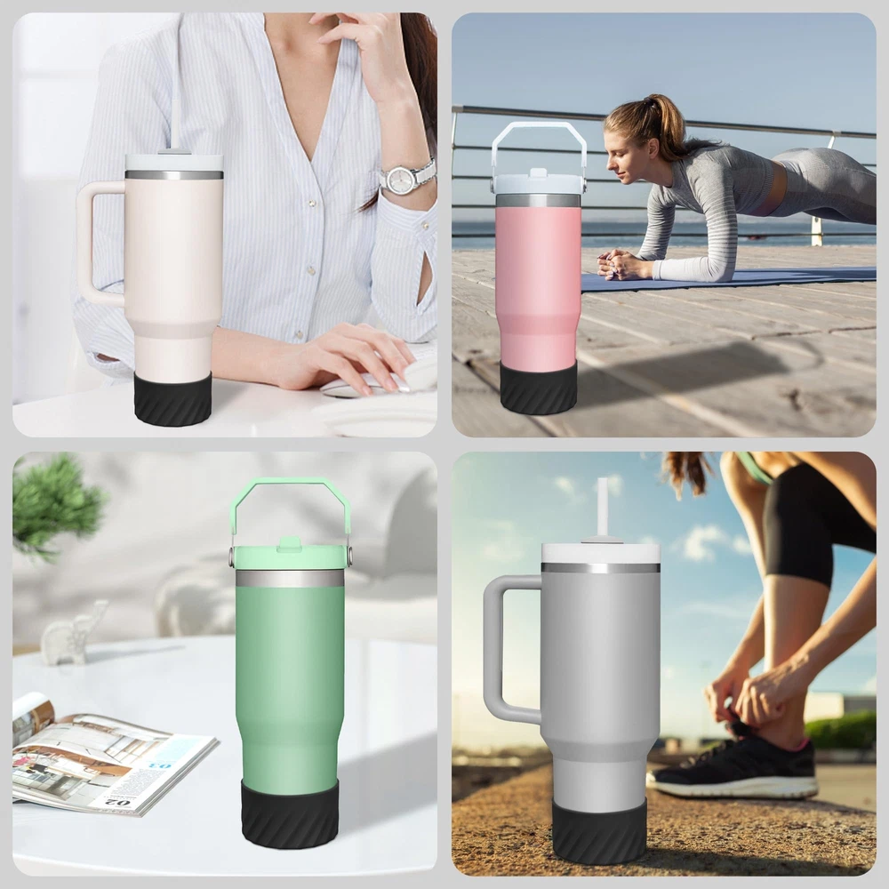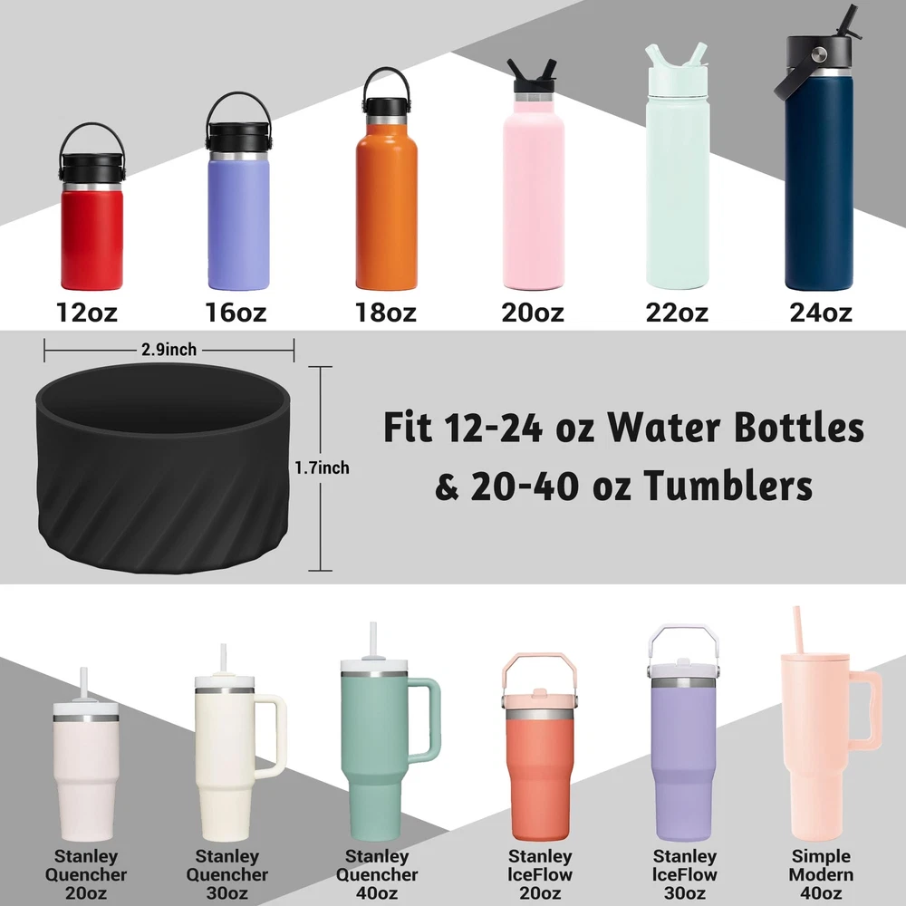 ✦Product Details: Our silicone boots are 2.9 inches in diameter and 1.7 inches high. Suitable for tumblers or water bottles with a base diameter of 2.8-3 inches. If you are not sure whether it is suitable, please measure the size of the bottom of your bottle before purchasing. ✦Fits Perfectly: Our protective boots are perfect fits Stanley Quencher(30/40oz) H2.0 and Stanley lceFlow (20/30 oz) Tumblers, Hydro Flask Wide Mouth (12/16/18/20/24 oz), Hydro Flask Standard Mouth (18/21/24 oz), Yeti Rambler Tumbler(20/30 oz), Yeti Rambler Travel Mug(20/30 oz), Simple Modern Tumbler (20/24/28/40 oz), Simple Modern Summit (14/18/22 oz) and Ascent (12/17/20/24 oz), and others. ✦Creative Texture: The novel shape design makes the sleeve cover look more fashionable, and improves the non-slip and easy to grip. The bottom has a raised design to avoid scratches and scuffs. ✦Premium Material: This water bottle boot is made of high-quality silicone, more flexible and will not deform. Odorless, easy to use, easy to clean and reusable. Both adult and children will love it. ✦Easy to Use: Wipe the surface of the water bottle first to keep it clean and dry. Slowly place the bottle boot on the bottle. If you have any questions about the product, please contact us and we will give you a satisfactory solution!