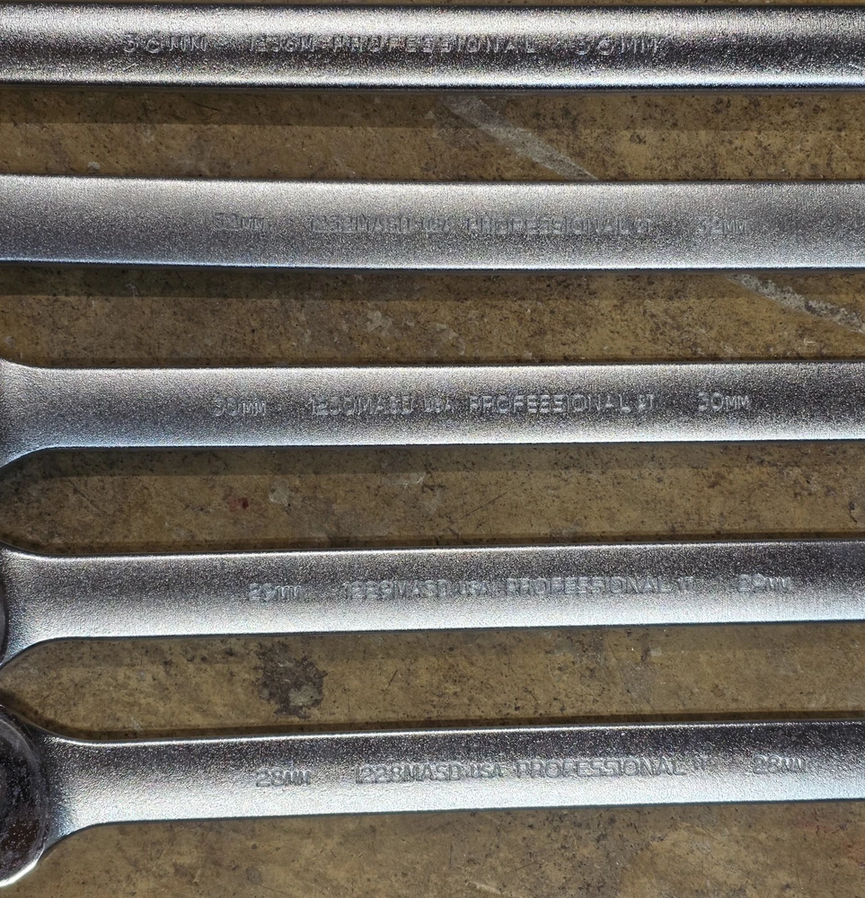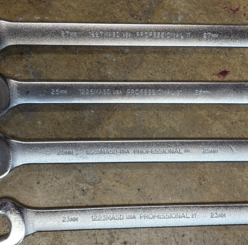 Proto Professional Metric 26pc Wrench Set 7-30 32 36mm 12pt Satin Finish Unused USA metric satin finish mostly anti-slip wrench set. 7mm-30mm, 32mm, and 36mm. The 7mm - 9mm and 36mm are NOT anti-slip style. UPDATE: NOW INCLUDES 24mm. IT'S A PROTO SAME MODEL NUMBER BUT NOT MARKED AS "PROFESSIONAL". ALSO THE ORIGINAL TWO PICTURES WEREN'T CORRECT (Accidentally showed full polish models). BUT DESCRIPTION IS. THESE ARE SATIN FINISH AS INDICATED. I HAVE UPDATED THE PICTURES. SORRY FOR ANY CONFUSION. Have shelf wear such as scratches, blemishes in spots, and other light shelf wear. Includes following: 7mm 1207MA 8mm 1208MA 9mm 1209MA 10mm 1210MASD 11mm 1211MASD 12mm 1212MASD 13mm 1213MASD 14mm 1214MASD 15mm 1215MASD 16mm 1216MASD 17mm 1217MASD 18mm 1218MASD 19mm 1219MASD 20mm 1220MASD 21mm 1221MASD 22mm 1222MASD 23mm 1223MASD 24mm 1224MASD (Proto but doesn't say "Professional") 25mm 1225MASD 26mm 1226MASD 27mm 1227MASD 28mm 1228MASD 29mm 1229MASD 30mm 1230MASD 32mm 1232MASD 36mm 1236M Does NOT include 31mm or 33mm-35mm sizes. Does NOT include storage bag.