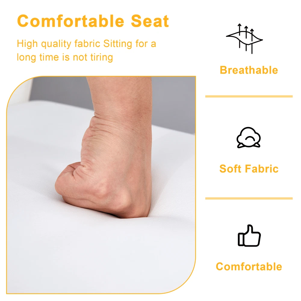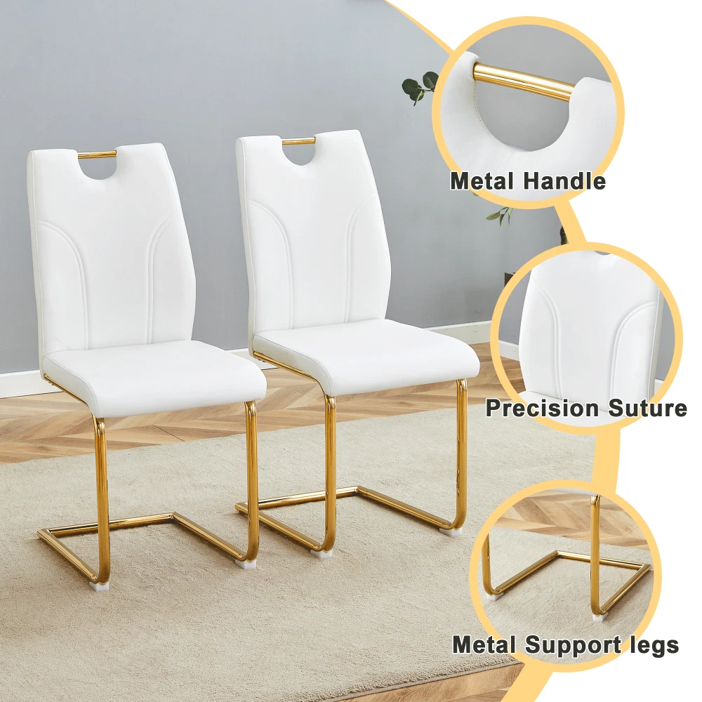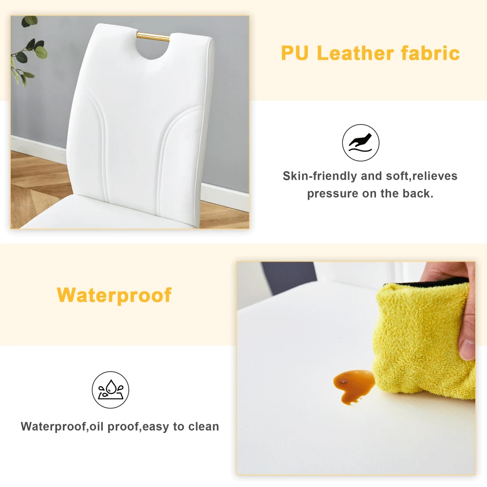 Premium Materials for Durability & Comfort High-Quality PU Leather : Soft to the touch, scratch-resistant, and incredibly easy to clean—just wipe away spills or stains with a damp cloth. Boasts excellent breathability, so you'll stay comfortable even during long meals or extended work sessions. High-Density Sponge Filling : Both the seat and backrest are filled with high-resilience sponge that offers exceptional rebound. Sits comfortably and maintains its shape over time, no sagging or loss of support. Sturdy Gold Metal Legs : Features a sleek gold metal frame that adds a touch of luxury to any decor. Built for stability, each chair supports up to daily use while maintaining a delicate, modern visual appeal. Anti-Slip Adjustable Feet : Thoughtful adjustable bottom feet prevent scratches on hardwood, tile, or carpet floors. Also ensures the chairs stay stable on uneven surfaces—no wobbling! Ergonomic Design for All-Day Comfort Designed with your comfort in mind! The elongated backrest hits at the perfect height to cradle your lower back, conforming to your waistline for optimal support. Smooth, streamlined lines create a comfortable silhouette that reduces fatigue, making these chairs ideal for long dinners, workdays, or meetings. Product Specifications Item Details Assembled Dimensions (L×W×H) 15.70 × 16.00 × 37.40 inches Product Weight (per chair) 13.67 lbs Package Dimensions (L×W×H) 37.60 × 21.65 × 18.50 inches Package Weight 86.42 lbs Material Metal (legs) + PU Leather (upholstery) + High-Density Sponge (filling) Color White + Gold (Black + Gold also available—mix & match for your decor!) Hassle-Free Assembly & Peace of Mind Quick & Easy Assembly : Includes detailed installation instructions and all necessary hardware. Most users can assemble a chair in just 15-20 minutes—no professional tools needed! 1-Year Warranty : We stand behind our quality! Enjoy a 1-year warranty against manufacturing defects for total peace of mind. 30-Day Free Return & Exchange : Not satisfied? Return or exchange your chair set within 30 days of delivery—no questions asked! Color Variation Notice: Due to differences in display devices (monitors/phones) and lighting conditions, there may be a slight color difference between the actual product and the images. This is a normal phenomenon and not a quality issue. Transform your space with style, comfort, and durability—order our White PU Dining Chair Set of 6 today and enjoy premium quality with unbeatable after-sales support!