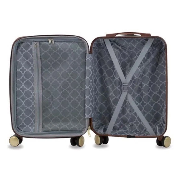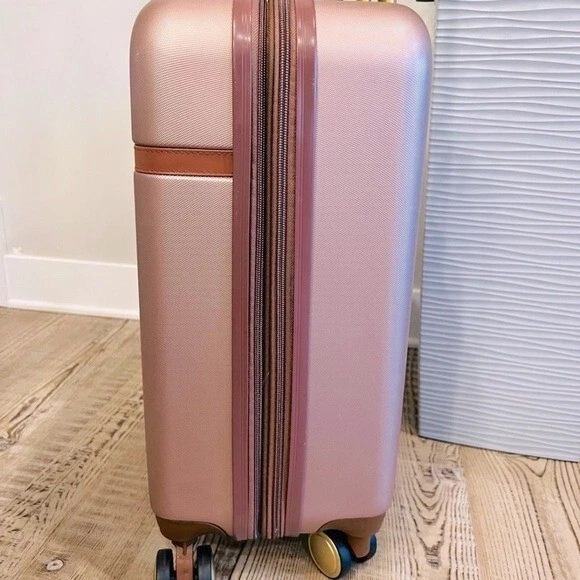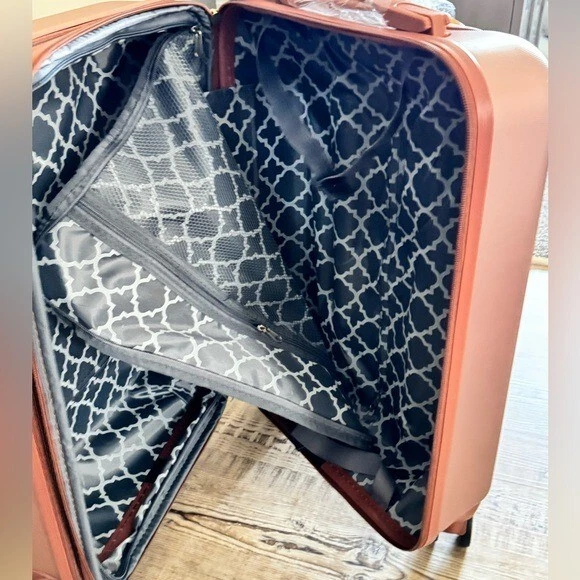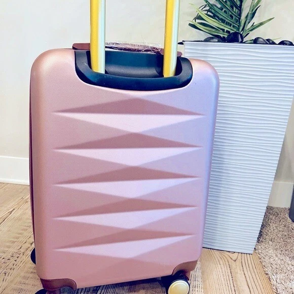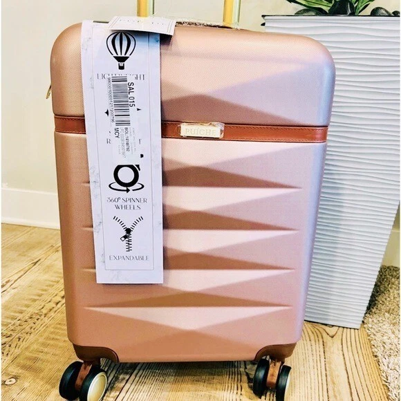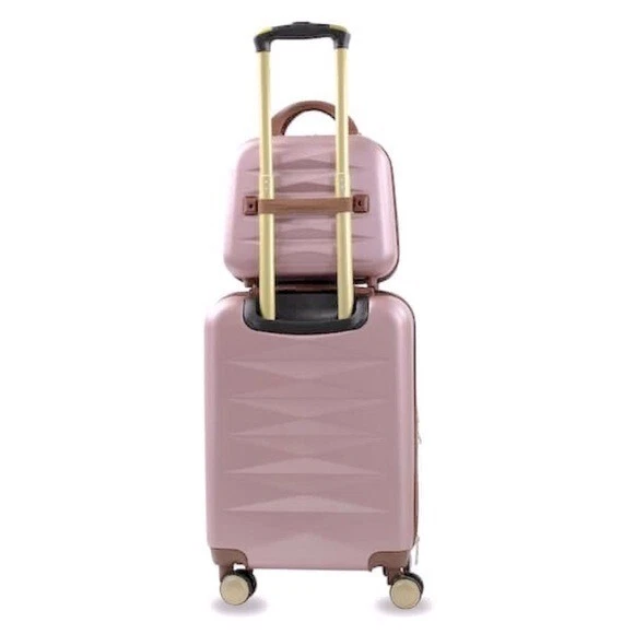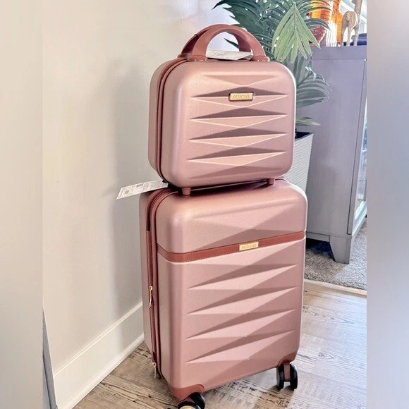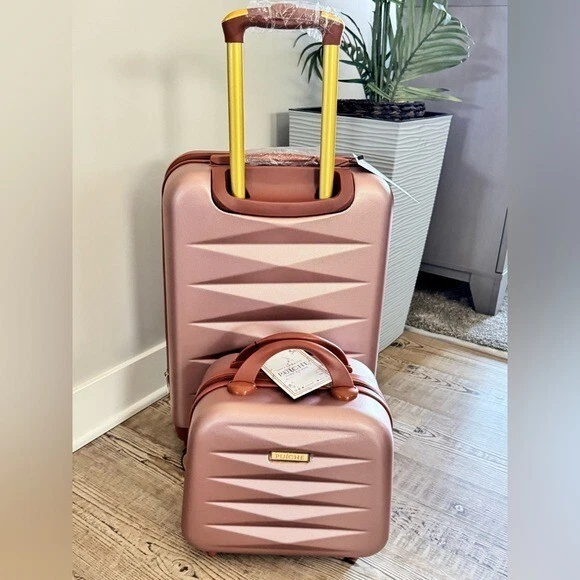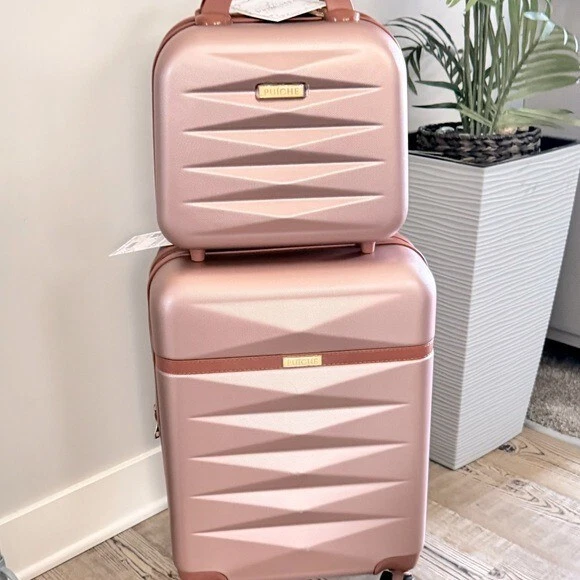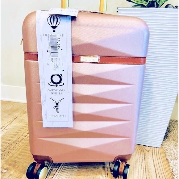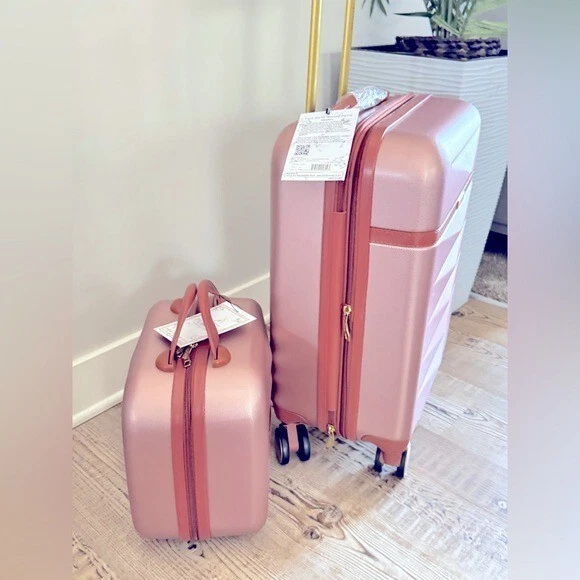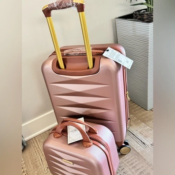 Puiche Jewel 2-Piece Rose Gold Carry-On Weekender Expandable Spinner Luggage Set, suitcase Elevate your travel experience with the Jewel collection by Puiche - a stunning two-piece set featuring a chic vanity case and a spacious carry-on. The carry-on offers smart organization with a roomy compartment, zippered separator, mesh organizer, and elastic clothing straps. Glide effortlessly with four 360° double spinners and an adjustable telescopic handle. Stay prepared with the vanity case's ample space and inner elastic straps, perfect for toiletries and cosmetics during air travel. Chic design: the scratch-resistant hardshell boasts an eye-catching pattern, complemented by accents for a contemporary yet classic look Smart organization: the carry-on opens to reveal a spacious compartment with a zippered separator (up to 20% more), mesh organizer, and elastic clothing straps to keep your belongings neat and organized Effortless mobility: enjoy seamless travel with four 360° double spinners and an adjustable telescopic handle on the carry-on Accessory bliss: the vanity case provides secure storage for toiletries and cosmetics with 2-pouches and buckled elastic straps Dimensions (Weight): 20 x 13.5 x 9 in. (5.9 lb.) +2 in. for external / 11 x 12 x 7 in. (1.9 lb.) +2 in. for external