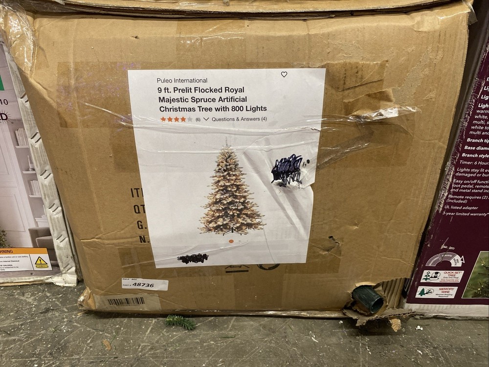 Description: Puleo International 9 ft Pre-Lit Flocked Royal Majestic Spruce Christmas Tree Model: Royal Majestic Spruce – Flocked Condition: Brand New in Box Bring a stunning winter look into your home with this premium 9-foot flocked Christmas tree from Puleo International. The Royal Majestic Spruce features full, heavily flocked branches for a realistic snow-covered appearance and comes pre-lit with 800 clear incandescent lights , giving your space a warm, classic holiday glow. Features: 9 ft height – perfect for rooms with tall ceilings Beautiful flocked finish for a realistic snowy look 800 pre-strung clear lights Full, hinged branches for quick and easy setup Sturdy metal stand included Flame-retardant materials Traditional warm incandescent lighting Indoor use only What’s Included: 9 ft Flocked Royal Majestic Spruce Tree Pre-installed 800 clear lights Metal stand