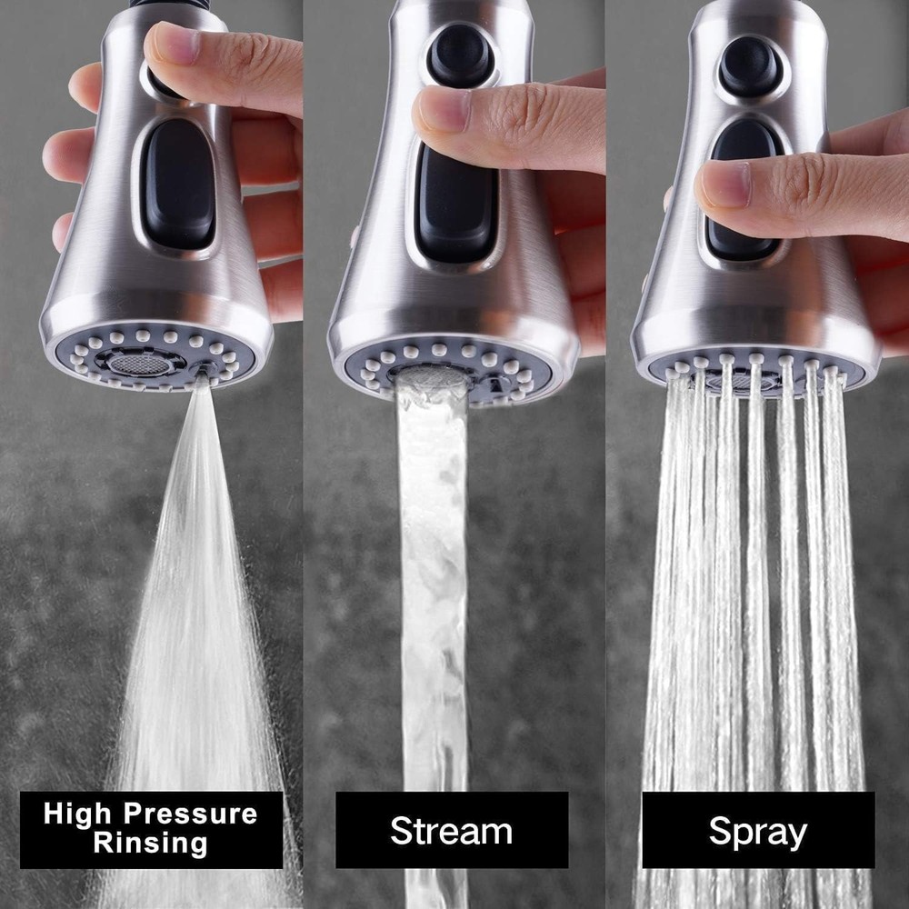 Pull Down Spray Head for Kitchen Faucet, NSF/ANSI/CAN 61 & CUPC Certified 3-Function Spray Nozzle, 15 Adapters, Sink Faucet Head Compatible with Moen, Delta, Kohler, Brushed Nickel Easily Switch Between 3 Modes: The kitchen faucet sprayer head has stream, spray, and high-pressure rinsing modes; The unique-designed high-pressure rinsing mode is a very strong power mode, which can easily flush the food debris with blade water; Simply press and release the button to switch between 3 modes Available In 15 Connection Sizes: This pull-down spray head comes with 15 adapters for various connections that are compatible with major product faucet hoses, not to compatible with American Standard, Moen, Delta, AquaSource, Kohler, Hansgrohe and Grohe (Pfister or Glacier not included). Please note that this spray head is not suitable for RV faucets Removable & Washable Faucet Aerator: An aerator key is included for removing or replacing the faucet aerator to clean; The interior multi-mesh aerator creates a quiet no-splashing aerated stream; The aerator can be removed and cleaned to ensure clean water and continuous flow Quality & No Dripping: This kitchen faucet head is crafted from high-grade PC/ABS engineering plastic, featuring an ergonomic design and an industry-leading finish that resists scratches, ensures longevity, and effectively withstands rust. Certified by NSF, cUPC, and low-lead standards, it meets strict safety and performance standards Easy to Install: It's very easy to install the sink faucet head, simply unscrew your old shower head and replace it with the new one; No tools are needed