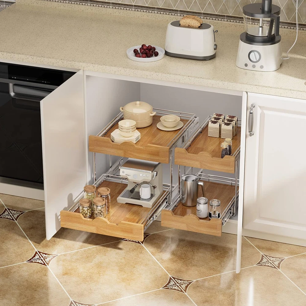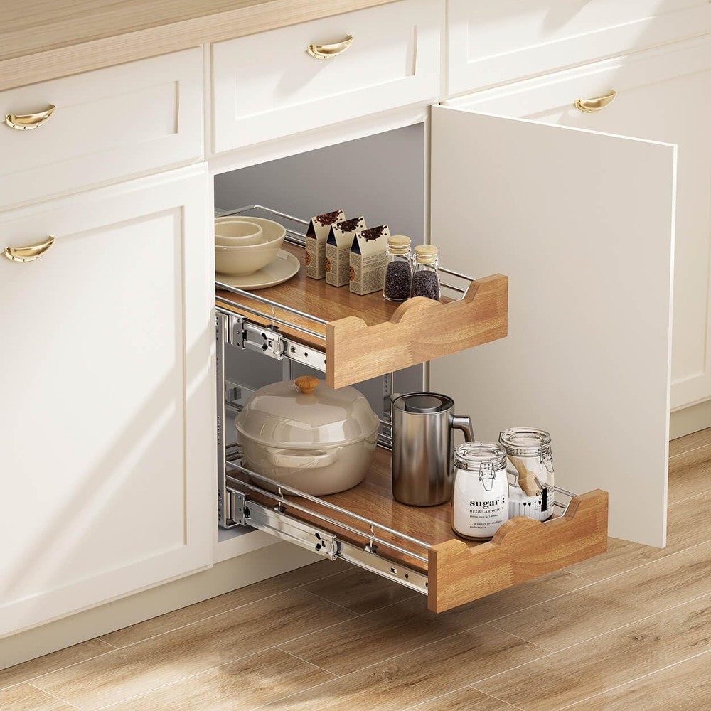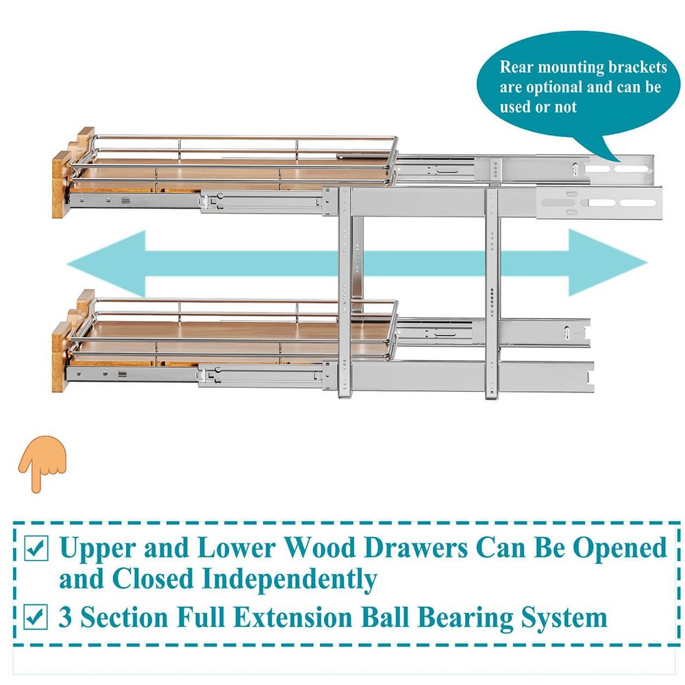 2 Tier Pull Out Wood and Wire Drawer: Organizing your cabinet space just got easier with the 2 tier pull out shelf. Now you can make the most of cabinet space and easily access all your pots, pans, small kitchen appliances, cleaning products, canned goods, and other items The Size of Cabinet Pull Out Shelves:14"W x 21"D x 15.5"H. This 2 tier slide out cabinet organizer needs at least 15 inch wide or larger net cabinet openings. Min cabinet interior depth: 22.5 inch. Please Note: This item size includes the frame Easy to Install: Comes with step by step installation manual. Mounting template and all the hardware necessary for a quick, easy install. Both upper and lower Drawers fully slide out independently on precision ball bearing slides so you can reach to your items easily and more quickly. Install and secure at the bottom of the cabinet (Bottom mount). Excellent Design: The upper and lower shelves has 2 height adjustment options, and the installation compatibility in the cabinet is better. When installing the lower Drawer, there are two heights to choose from, Which can easily solve the problem that the lower Drawer cannot be pulled out due to the lip of the cabinet. PREMIUM SERVICE: Please choose the right size before you purchase. we recommend that the net opening width of the cabinet should be at least one inch wider than the overall width of the pull out shelf. For our customers, this pull out shelves comes with Lifelong Technical Support & Premium Service. If you have any issues about the pull out drawers, please contact us, we will give you the satisfied solution as soon as possible.