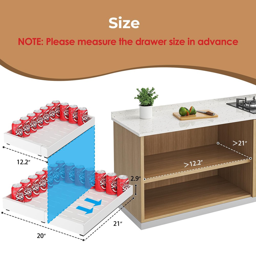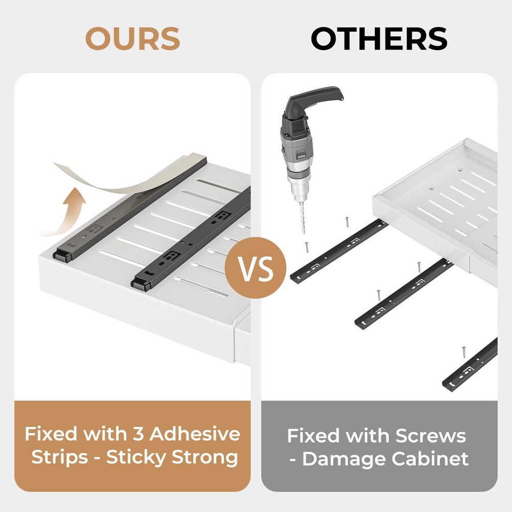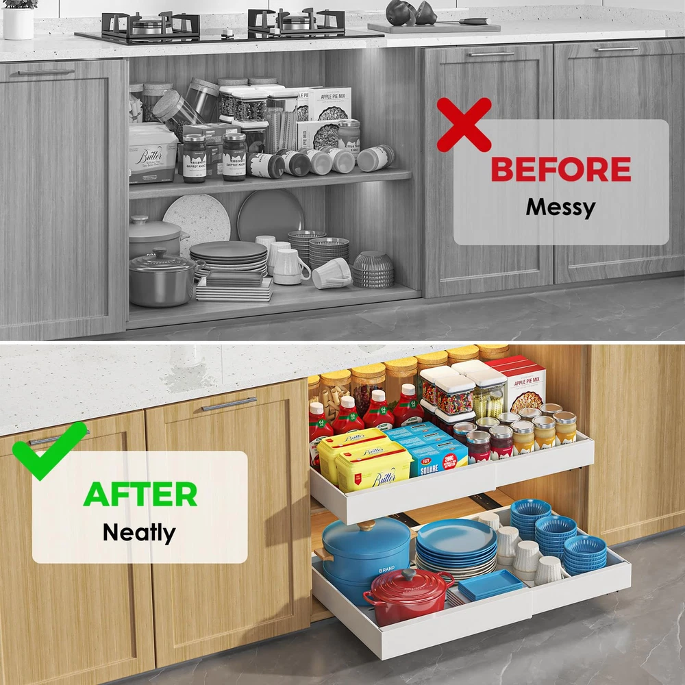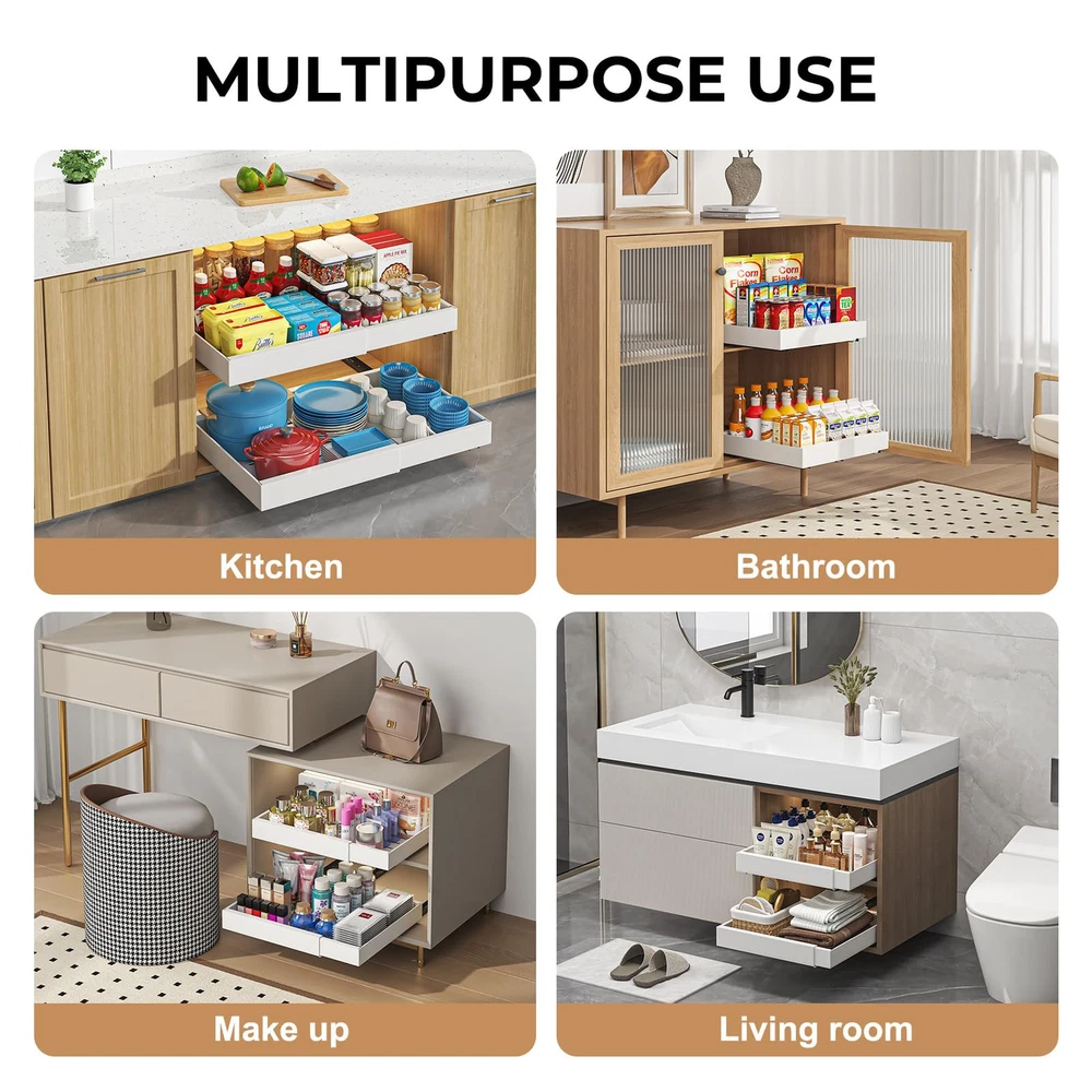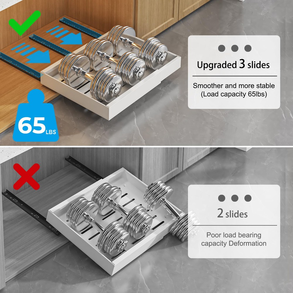 Expandable Cabinet Organizer: The Homehut pull out cabinet drawer organizer features an expandable design that can be adjusted to fit various cabinets. Its dimensions are 20.9 inches in depth by 2.9 inches in height, with a width adjustable from 12.2 inches to 20.5 inches. Therefore, please confirm the size of your cabinet before selecting the slide out drawers for kitchen cabinets. Silent Smooth Glide Rails: Our pantry organizer is designed with dampened glide rails that have been tested for 40,000 cycles of opening and closing. Our pull out cabinet shelves can glide out in just 1 second, with no worries about jamming. It slides smoothly and quietly, ensuring there is no unpleasant noise. Maximum Load Capacity of 75lbs: Our pull out cabinet organizer has been upgraded with three glide rails, enhancing its load-bearing capacity by 30% compared to other similar organizers with only two rails on the market. It can support a maximum weight of up to 75lbs. Easy 10-Second Installation: The kitchen cabinet organizer and storage cabinet come with detailed instructions for easy installation. There is no need for assembly; simply secure it in place, and it offers two mounting options: screws or nano adhesive, both included. The installation process is quick and can be completed in just 10 seconds, making it perfect for organizing storage in your kitchen, bathroom, under the sink, and pantry. Multipurpose Use: With the pull out cabinet organizer, organizing your cabinet space becomes easier. You can make full use of the cabinet space and effortlessly access all your cookware, frying pans, small kitchen utensils, cleaning products, canned goods, and other items.