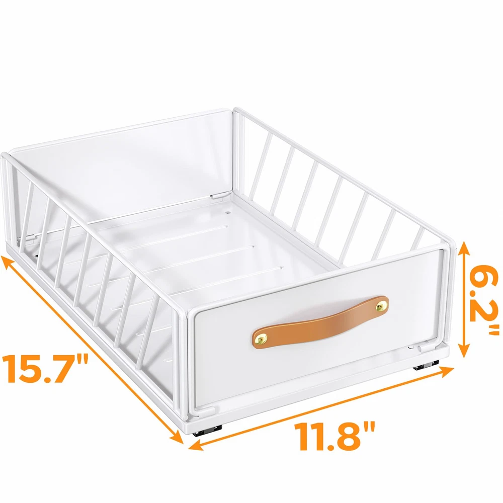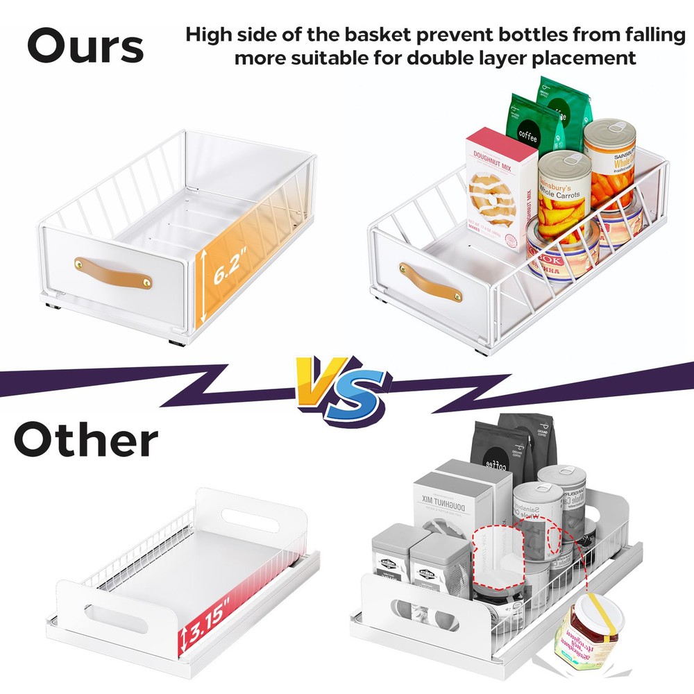 【No Need Drill & Nail】The pull out cabinet organizer for kitchen cabinet is simple and easy to install. No need to require measuring, screws, drilling, or nails to install. What you need to do is tear off the nano glue and install it where you like. Slide out design is an ideal choice for deep cabinets in the kitchen or bathroom 【Smooth and Quiet Sliding】The pull out cabinet drawer for kitchen cabinet is designed with a damping guide rail, which has been tested by 4W times of opening and closing, it can slide smoothly without unpleasant noise 【Versatile Use】The under-sink organizer is perfect for containing and organizing loose items and keeping them neat. It is a great slide out cabinet organizer for cabinets, kitchen, pantry, bathroom, living room, office, and more 【Easy Access to Items 】With our pull-out cabinet drawer, you no longer needed to be on your knees to access anything on the lower shelves, no need to unload stuff stored in front to get to anything in the back 【Strong Bearing Capacity】Our sliding cabinet organizer pull out shelves are made of premium carbon steel with a black powder finish. The sturdy construction of this sliding cabinet organizer will provide a strong load-bearing to contain and organize loose items easily