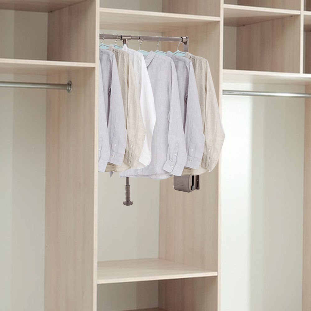 Wardrobe Organizer Garment Rack Clothes Shelf Metal Pull-down Clothes hanging ✔PRODUCT SIZE:The cross bar can stretch 35-47.2inch (89-120cm). It can be determined according to the width of your wardrobe. The interior height of the closet must be greater than 34.65inch (88cm) for installation. ✔USEFUL ADDITION TO ANY CLOSET: Polished Chrome Soft-close Expanding Wardrobe Lift. ✔ADJUSTABLE LENGTH: The length of the crossbar can be adjusted to meet your needs. A soft close damper is provided to ensure that the lift is gently pulled down. ✔DURABLE AND LONG LASTING: Constructed of aluminum alloy with plastic housing and handle. Rated for a weight capacity for up to 55 lbs. ✔HIGH QUALITY DESIGN: thickened arc support,dust-proof design, safety protection. Product Description: Material: aluminum alloy+plastic Color: coffee - The cross bar can stretch 35-47.2inch (89-120cm). - Simple pull-down clothes hanger,55 lb Weight Rating. - Width adjustable to fit a wide range of openings. Unique Twist and Lock Adjustable Pole with Ergonomic Handle. - Soft-close bumper for smooth operation. Mounting Brackets Allow for Easy Install and Clean Finished Look. Hidden mounting screws.