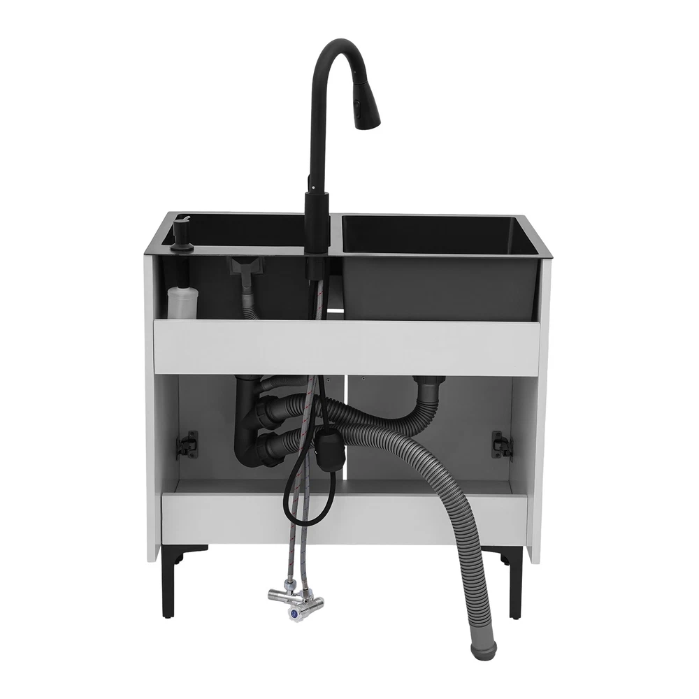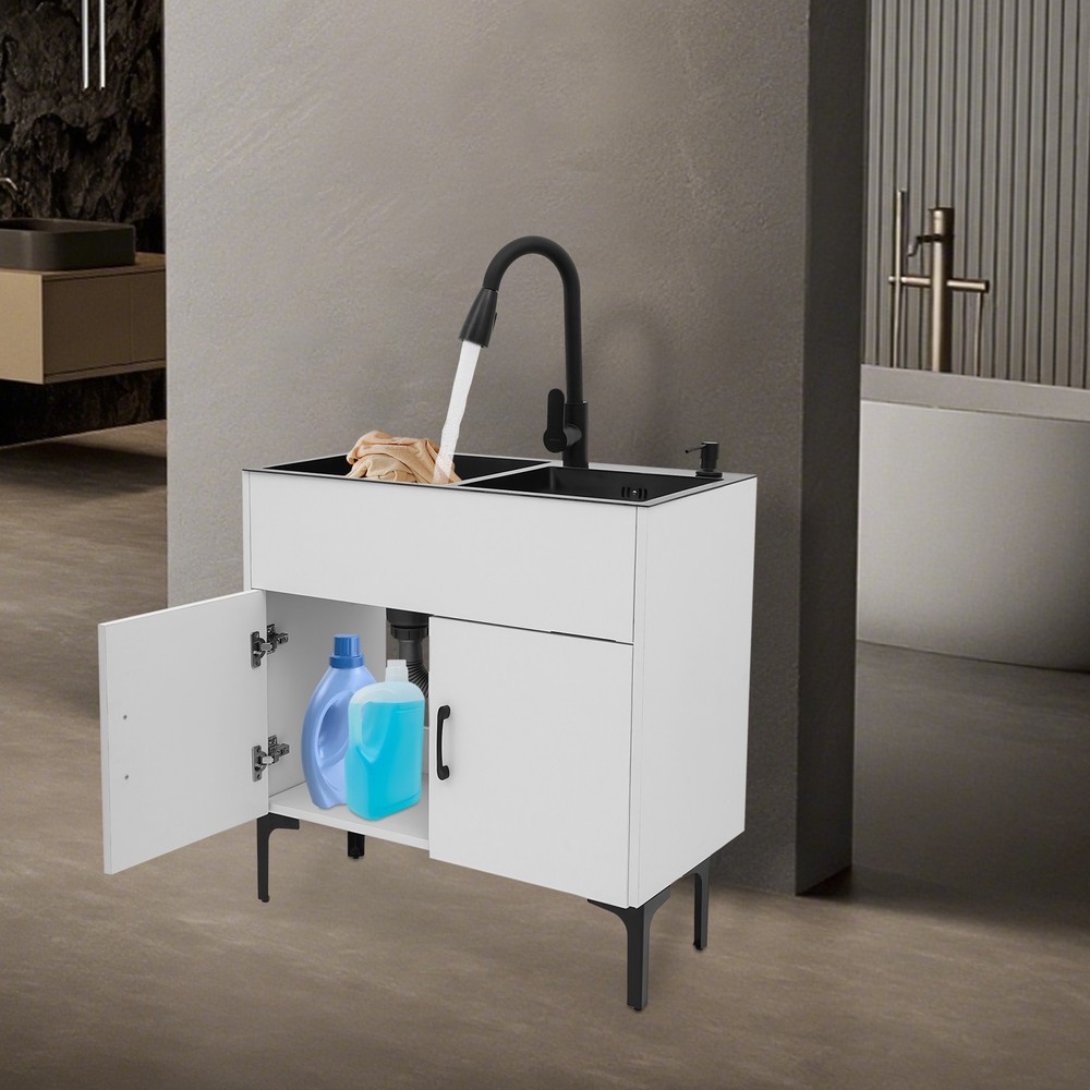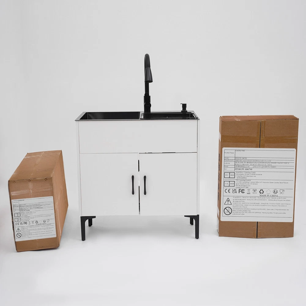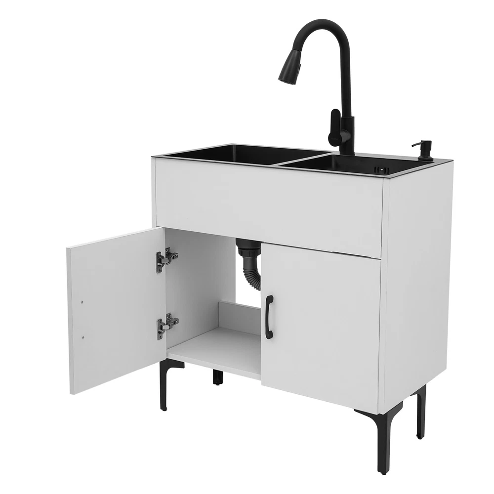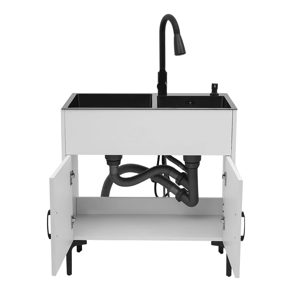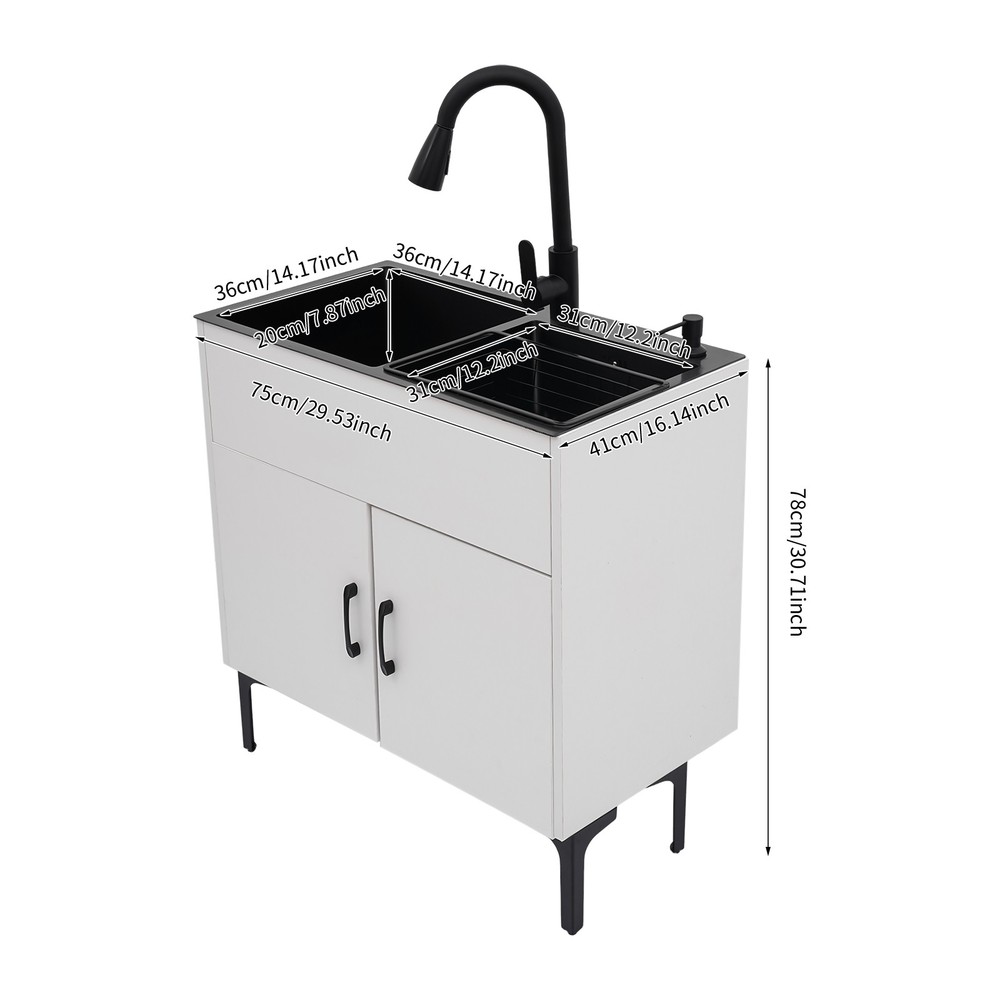 Pull-Out Sprayer Faucet Utility Sink & Stainless Steel Laundry Sink with Cabinet Description Are you looking for a kitchen sink solution that combines practicality and beauty? Then look at our product! The pulled-out faucet makes cleaning the sink a breeze, bringing you a convenient experience. It creates an efficient and clean kitchen environment for you. Choosing it is to choose quality and convenience, making your kitchen life more relaxed and enjoyable! Key Features Build to Last : The product is mainly made of high-class 201 stainless steel, solid wood, and cold rolled steel, with manual welding and grinding, and nano-coating processes, which is impact-resistant, and scratch-resistant, with high durability and reliability, ensuring long-term use. Convenient and Flexible: The faucet's spray head can be pulled out within 11.81 inches for flexible use. It also has 2 water outlet modes: water column and shower spray water outlet, to meet your daily different washing needs. Storage Assistant: The large and deep double sinks ( 7.87 in) allow you to multitask and clean vegetables, fruits, plates, and cookware with ease, improving cleaning efficiency and avoiding splashing. The spacious cabinet under the sinks allows you to store enough cleaning supplies. Good Drainage: It adopts an X-shaped diversion design and large diameter outlets (each: 4.33 in) for fast drainage. The dual filter design (coarse filter, fine filter) can effectively filter impurities, preventing food or other waste into the drain. The V-shaped drain pipe is equipped with an anti-odor water design, which can effectively prevent the drain odor from returning and keep the kitchen air fresh. Thoughtful Design: The silent pads can reduce the noise caused by water flow impact and create a quieter environment. The anti-condensation coating reduces the generation of condensation water outside the sink, keeps the cabinet dry and hygienic, and extends the service life of the product. The drainage basket allows you to safely put washed utensils or fruits and vegetables (all not included) into it to drain water and keep the countertop clean. Good Sealing Effect : The good connection adds to its good sealing to avoid leaks. In addition, the door gap of the cabinet is less than 0.2 in, which has a good sealing effect and effectively reduces the accumulation of dust and dirt, keeping the cabinet clean and hygienic. User-friendly: It has a freestanding design and can be adapted to various kitchen layouts. It not only saves cabinet space but also gives a concise, modern feel visually. Moreover, the moderate height (30.71 in) reduces the burden of working in the kitchen and brings you a more comfortable user experience. In addition, we have designed two installation holes for the kitchen sink. Therefore, you can directly install a pull-out faucet and a soap dispenser without drilling any more holes. Complete Set: The product package includes two sinks, a soap dispenser , a faucet, V-shaped drainage pipe s, a draining basket, etc, so you don't have to buy additional items, which greatly saves you time and money. Easy to Clean : The elevated base design and a pull-out faucet not only enhance cleanliness but also ensure quick and easy cleaning, making daily maintenance a breeze. Good Customer Service: We stand behind all our guests and look forward to assisting you with your purchase. It is our pleasure to answer your confusion and questions. The end of the story between us is not "we sell and you buy". Details R -corners: They not only increase the beauty of the product but also facilitate cleaning. Soap Dispenser: The included soap dispenser gives you easy access to hand sanitizer, dish soap, and other cleaning supplies, making kitchen cleaning even easier and more efficient. Practical Handles : The two cabinet door handles provide easy and secure opening and closing, ensuring convenience and safety during use. Anti-overflow Holes : They can help drain water and prevent the ground from getting wet when you forget to turn off the water. Cold Rolled Steel Cabinet Feet: They are not only durable but also can effectively prevent the cabinet feet from moisture deformation and extend the service life. Application It is suitable for kitchens, restaurants, dessert shops, coffee shops, garages, hotels, laundry rooms, bathrooms, pet shops, and other places. Specification Material: 201 Stainless Steel, Solid Wood, Cold Rolled Steel Process: Nano-Coating, Manual Welding and Grinding Color: Black+White Shape: Rectangular Assembly Required: Yes Mounting Type: Freestanding Water Outlet Modes: Water Column, Shower Spray Faucet Pull-out Length: About 30cm/11.81in Each Drain Opening Diameter: 11cm/4.33 in Door Gap Spacing: <5mm/0.2in Large Sink Inner Size: 36*36*20cm/ 14.17*14.17*7.87 in Small Sink Inner Size: 31*31*20cm/ 12.2*12.2*7.87 in Overall Sink Outer Size(L*W): 75*41cm/ 29.53*16.14 in Product Size: 75*41*78cm/29.53*16.14*30.71in Cabinet: Package Size: 77*47*13cm/30.31*18.5*5.12in Gross Weight: 13kg/28.66 lbs Net Weight: 12.35kg/ 27.23 lbs Drainage Basket + Drainage Kit: Package Size: 78*45*25cm/30.71*17.72*9.84in Gross Weight: 9kg/19.84 lbs Net Weight: 8.55kg/18.85 lbs Package Included 1* Sink 1* Faucet 1* Cabinet 1* Drainage Basket 2* Drainers 1* Soap Dispenser 1* Chinese Installation Instruction All Accessories for Assembly Notes Please check the product size carefully before purchasing. We send the cabinet and drainage basket & drainage kit separately to protect the product from damage during transportation. Please wait patiently for all parts to arrive. Please note that the sink and the cabinet can bear about 55.12-66.14 lbs. Please use within the product's load-bearing range. Please allow the slight color difference caused by the shooting light and the 1-3 cm error due to manual measurement, and make sure you do not mind before ordering. Payment Delivery details Terms of sales About us Contact us Payment We accept ebay payment 。 Fees such as 