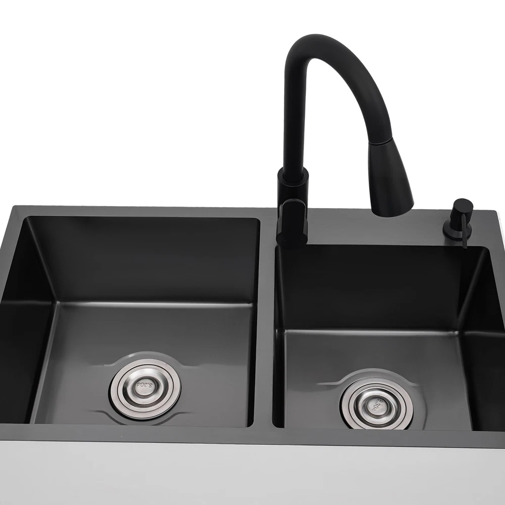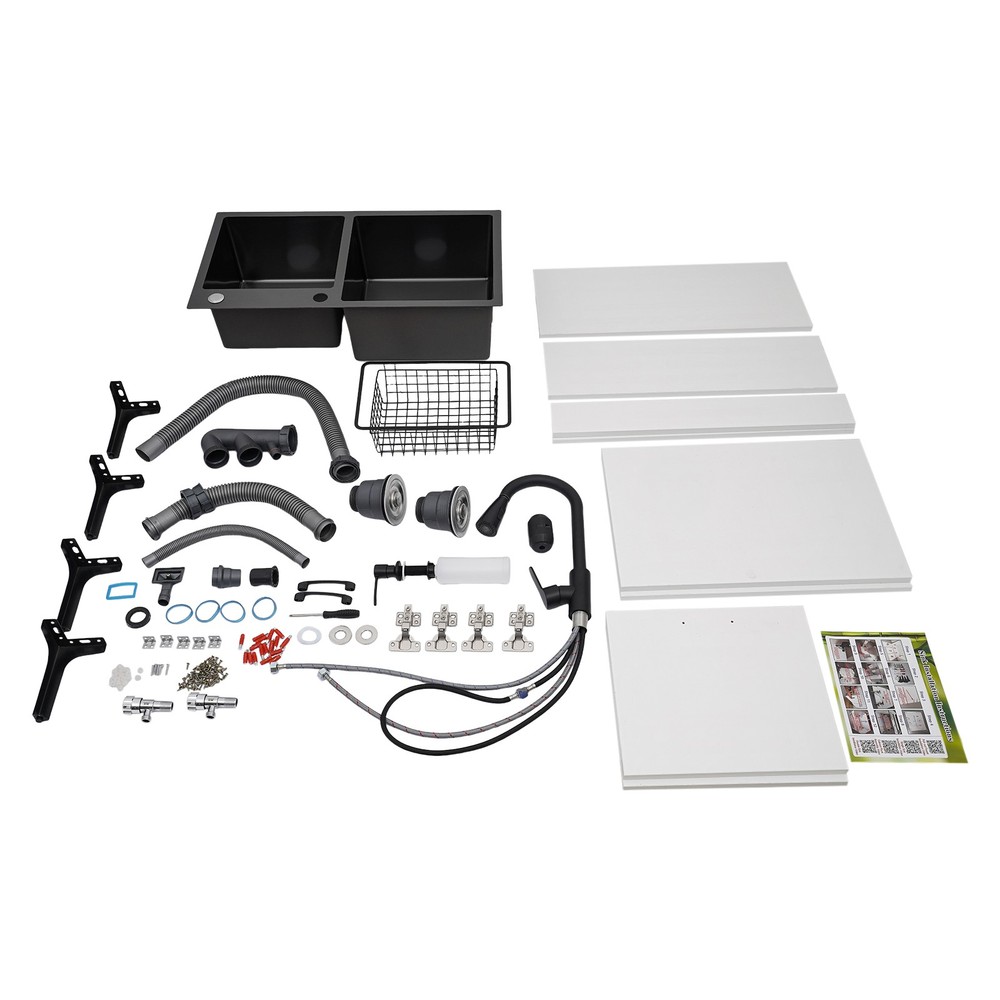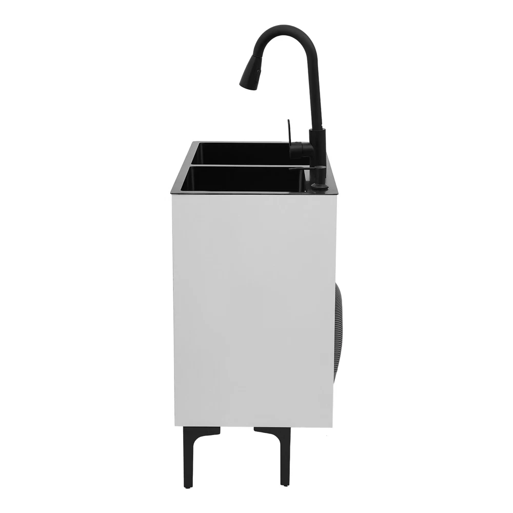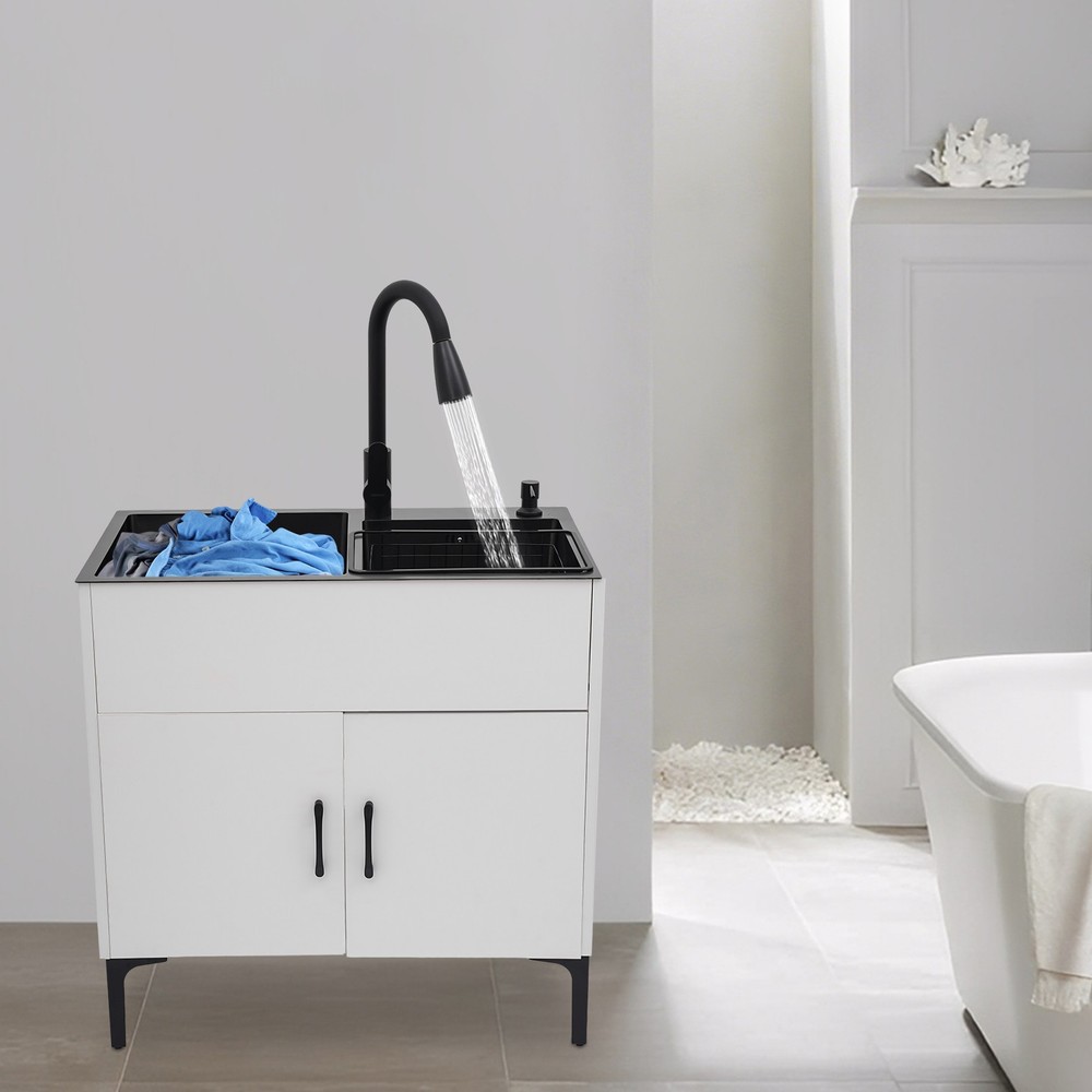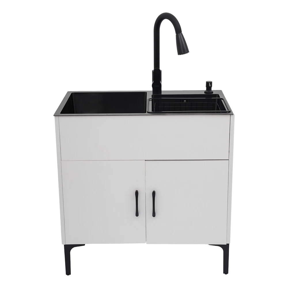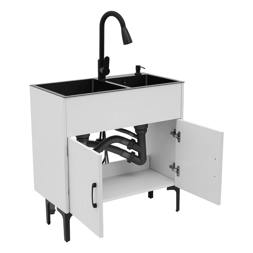 Pull-Out Sprayer Faucet Utility Sink & Stainless Steel Laundry Sink with Cabinet Description Are you looking for a kitchen sink solution that combines practicality and beauty? Then look at our product! The pulled-out faucet makes cleaning the sink a breeze, bringing you a convenient experience. It creates an efficient and clean kitchen environment for you. Choosing it is to choose quality and convenience, making your kitchen life more relaxed and enjoyable! Key Features Build to Last : The product is mainly made of high-class 201 stainless steel, solid wood, and cold rolled steel, with manual welding and grinding, and nano-coating processes, which is impact-resistant, and scratch-resistant, with high durability and reliability, ensuring long-term use. Convenient and Flexible: The faucet's spray head can be pulled out within 11.81 inches for flexible use. It also has 2 water outlet modes: water column and shower spray water outlet, to meet your daily different washing needs. Storage Assistant: The large and deep double sinks ( 7.87 in) allow you to multitask and clean vegetables, fruits, plates, and cookware with ease, improving cleaning efficiency and avoiding splashing. The spacious cabinet under the sinks allows you to store enough cleaning supplies. Good Drainage: It adopts an X-shaped diversion design and large diameter outlets (each: 4.33 in) for fast drainage. The dual filter design (coarse filter, fine filter) can effectively filter impurities, preventing food or other waste into the drain. The V-shaped drain pipe is equipped with an anti-odor water design, which can effectively prevent the drain odor from returning and keep the kitchen air fresh. Thoughtful Design: The silent pads can reduce the noise caused by water flow impact and create a quieter environment. The anti-condensation coating reduces the generation of condensation water outside the sink, keeps the cabinet dry and hygienic, and extends the service life of the product. The drainage basket allows you to safely put washed utensils or fruits and vegetables (all not included) into it to drain water and keep the countertop clean. Good Sealing Effect : The good connection adds to its good sealing to avoid leaks. In addition, the door gap of the cabinet is less than 0.2 in, which has a good sealing effect and effectively reduces the accumulation of dust and dirt, keeping the cabinet clean and hygienic. User-friendly: It has a freestanding design and can be adapted to various kitchen layouts. It not only saves cabinet space but also gives a concise, modern feel visually. Moreover, the moderate height (30.71 in) reduces the burden of working in the kitchen and brings you a more comfortable user experience. In addition, we have designed two installation holes for the kitchen sink. Therefore, you can directly install a pull-out faucet and a soap dispenser without drilling any more holes. Complete Set: The product package includes two sinks, a soap dispenser , a faucet, V-shaped drainage pipe s, a draining basket, etc, so you don't have to buy additional items, which greatly saves you time and money. Easy to Clean : The elevated base design and a pull-out faucet not only enhance cleanliness but also ensure quick and easy cleaning, making daily maintenance a breeze. Good Customer Service: We stand behind all our guests and look forward to assisting you with your purchase. It is our pleasure to answer your confusion and questions. The end of the story between us is not "we sell and you buy". Details R -corners: They not only increase the beauty of the product but also facilitate cleaning. Soap Dispenser: The included soap dispenser gives you easy access to hand sanitizer, dish soap, and other cleaning supplies, making kitchen cleaning even easier and more efficient. Practical Handles : The two cabinet door handles provide easy and secure opening and closing, ensuring convenience and safety during use. Anti-overflow Holes : They can help drain water and prevent the ground from getting wet when you forget to turn off the water. Cold Rolled Steel Cabinet Feet: They are not only durable but also can effectively prevent the cabinet feet from moisture deformation and extend the service life. Application It is suitable for kitchens, restaurants, dessert shops, coffee shops, garages, hotels, laundry rooms, bathrooms, pet shops, and other places. Specification Material: 201 Stainless Steel, Solid Wood, Cold Rolled Steel Process: Nano-Coating, Manual Welding and Grinding Color: Black+White Shape: Rectangular Assembly Required: Yes Mounting Type: Freestanding Water Outlet Modes: Water Column, Shower Spray Faucet Pull-out Length: About 30cm/11.81in Each Drain Opening Diameter: 11cm/4.33 in Door Gap Spacing: <5mm/0.2in Large Sink Inner Size: 36*36*20cm/ 14.17*14.17*7.87 in Small Sink Inner Size: 31*31*20cm/ 12.2*12.2*7.87 in Overall Sink Outer Size(L*W): 75*41cm/ 29.53*16.14 in Product Size: 75*41*78cm/29.53*16.14*30.71in Cabinet: Package Size: 77*47*13cm/30.31*18.5*5.12in Gross Weight: 13kg/28.66 lbs Net Weight: 12.35kg/ 27.23 lbs Drainage Basket + Drainage Kit: Package Size: 78*45*25cm/30.71*17.72*9.84in Gross Weight: 9kg/19.84 lbs Net Weight: 8.55kg/18.85 lbs Package Included 1* Sink 1* Faucet 1* Cabinet 1* Drainage Basket 2* Drainers 1* Soap Dispenser 1* Chinese Installation Instruction All Accessories for Assembly Notes Please check the product size carefully before purchasing. We send the cabinet and drainage basket & drainage kit separately to protect the product from damage during transportation. Please wait patiently for all parts to arrive. Please note that the sink and the cabinet can bear about 55.12-66.14 lbs. Please use within the product's load-bearing range. Please allow the slight color difference caused by the shooting light and the 1-3 cm error due to manual measurement, and make sure you do not mind before ordering. Payment Delivery details Terms of sales About us Contact us Payment We accept ebay payment 。 Fees such as 