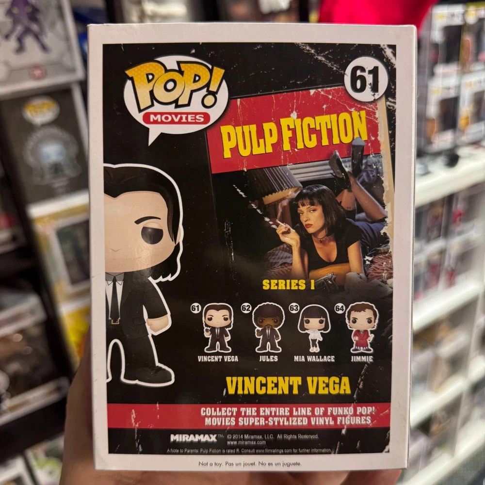 Release Year:2014Character:Vincent VegaProduction Run:1000Brand:FunkoPackaging:Original (Unopened)Theme:MoviesSeller Notes:“Excellent Condition. Standard age wear, but otherwise perfect.”Product Line:PopMovie:Pulp FictionType:Pop! VinylGrade:95+Material:VinylFeatures:CommonCollection:MoviesExclusive Event/Retailer:San Diego Comic Con Toy Tokyo (Sdcctt)Franchise:SDCC