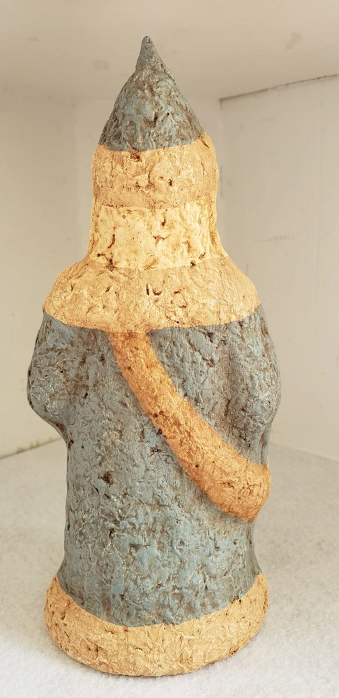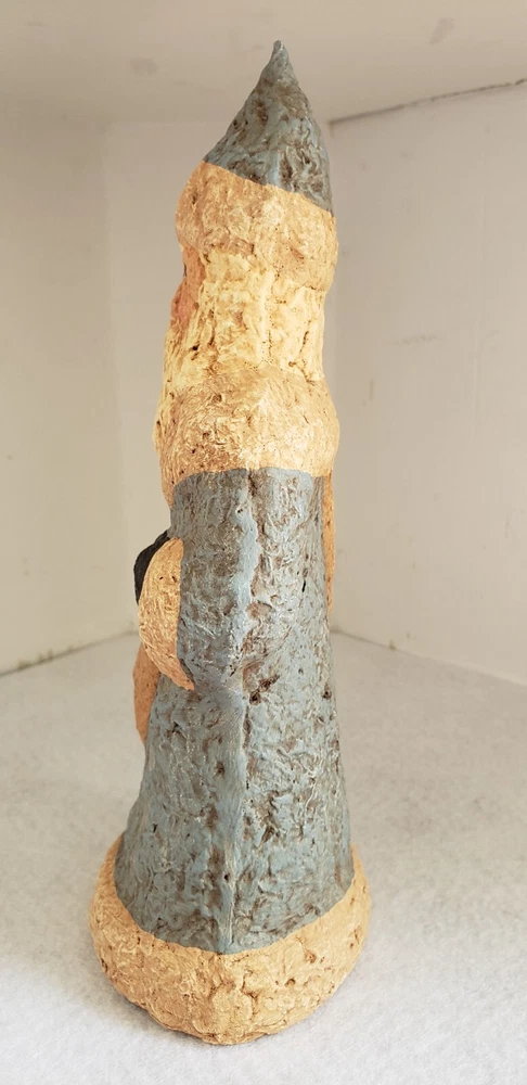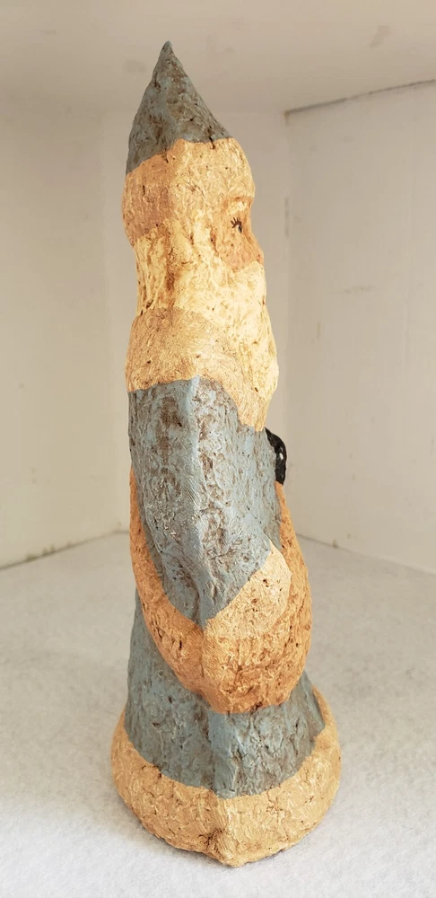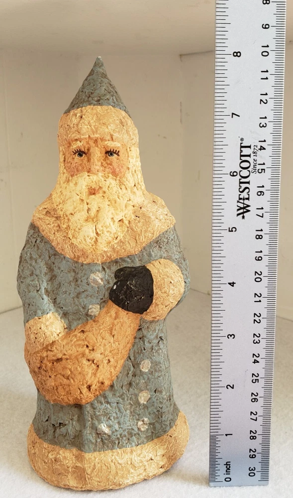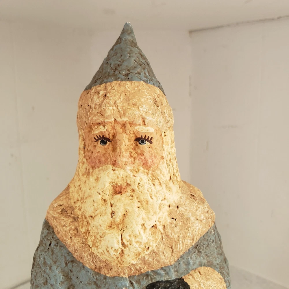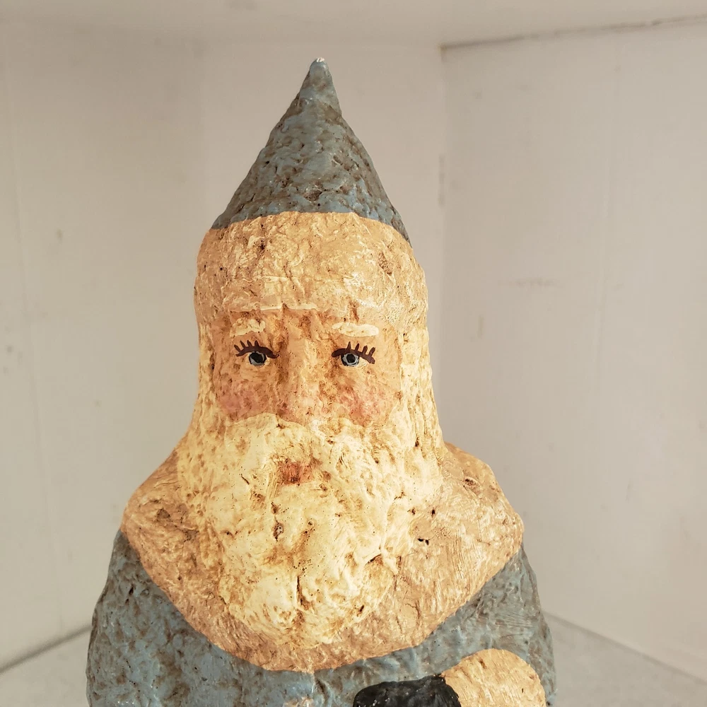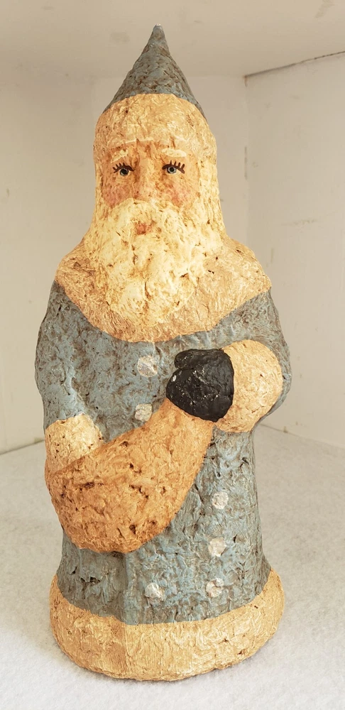 Pulp / Paper Mache Old World Santa with toy bag - Blue Coat Handmade and hand painted Height 8.25: Weight 8 oz. Stored in a smoke and pet free home Inside storage Add a touch of old-world charm to your Christmas decorations with this handmade figurine of Santa Claus carrying a toy bag. The figurine is finely crafted from pulp paper mache, with a textured 3D effect and hand-painted finish in beautiful shades of blue. Measuring 8.5 inches in height and weighing 6 ounces, this medium-sized figurine is perfect for adults looking to add a festive touch to their home decor. The Santa Claus figurine is an original piece of folk art, with a unique design that captures the spirit of the holiday season. The figurine is perfect for collectors of holiday and seasonal decor, and would make a great gift for anyone who loves Santa Claus or handmade crafts. With its classic style and beautiful finish, this figurine is sure to become a cherished part of your holiday decor for years to come.