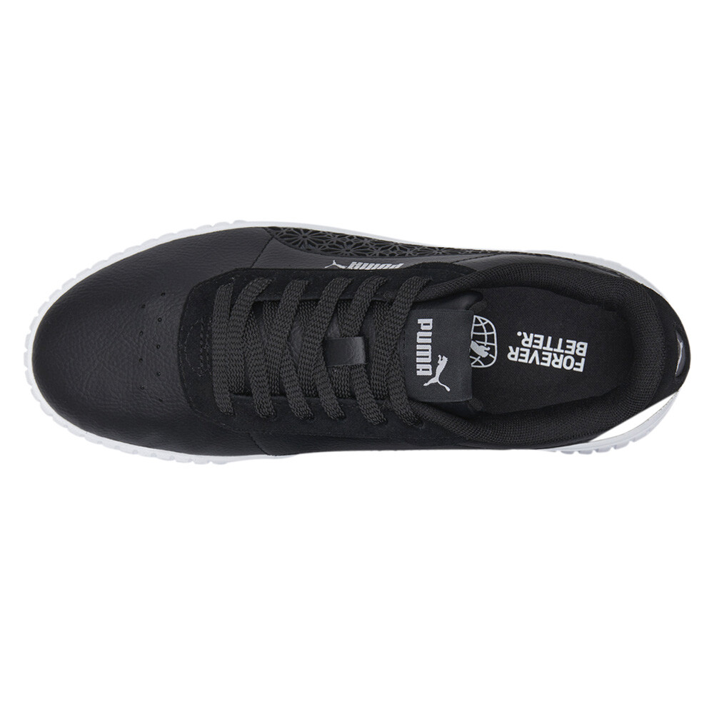Carina 2.0 Laser Cut Lace Up Sneakers Product Details Leather upper Rubber midsole Rubber outsole PUMA Formstrip on the medial and lateral sides A refresh from the '80s archive, this version of the Carina dons some flowery laser cut details to freshen up the classic silhouette. Additional Details Color: Black Occasion: Casual Gender: Womens Age: Adult Brand: Puma