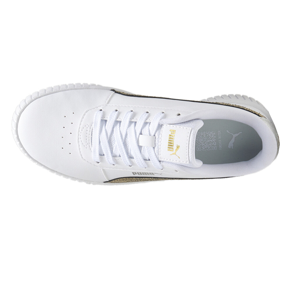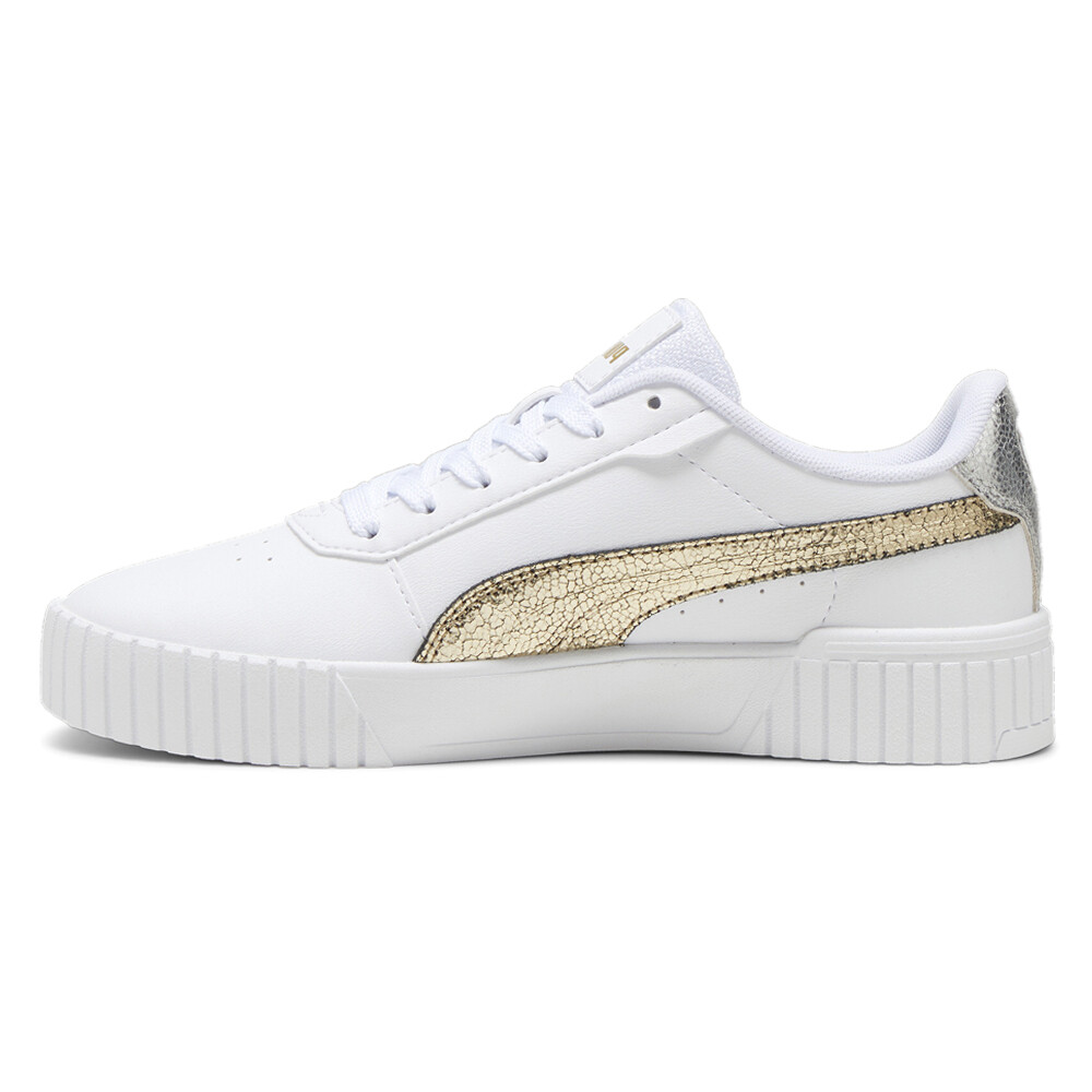 Carina 2.0 Metallic Shine Lace Up Sneakers Product Details Leather and synthetic upper Perforated vamp Textile lining Soft Foam Plus sockliner Rubber outsole Introducing the Carina 2.0 Metallic Shine. Taking its design cues from the '80s, this classic tennis silhouette feels right at home with the laid-back sneaker style of Californian beach towns. Staying true to its beloved look and feel, Carina steps into the new season with some refreshments: wider lines on the heel and perforations on the vamp and metallic gold and silver details to give a feminine look. What's more, the Soft Foam Plus sockliner is there to provide soft cushioning and comfort all day long. Additional Details Color: White Occasion: Casual Gender: Womens Age: Adult Brand: Puma