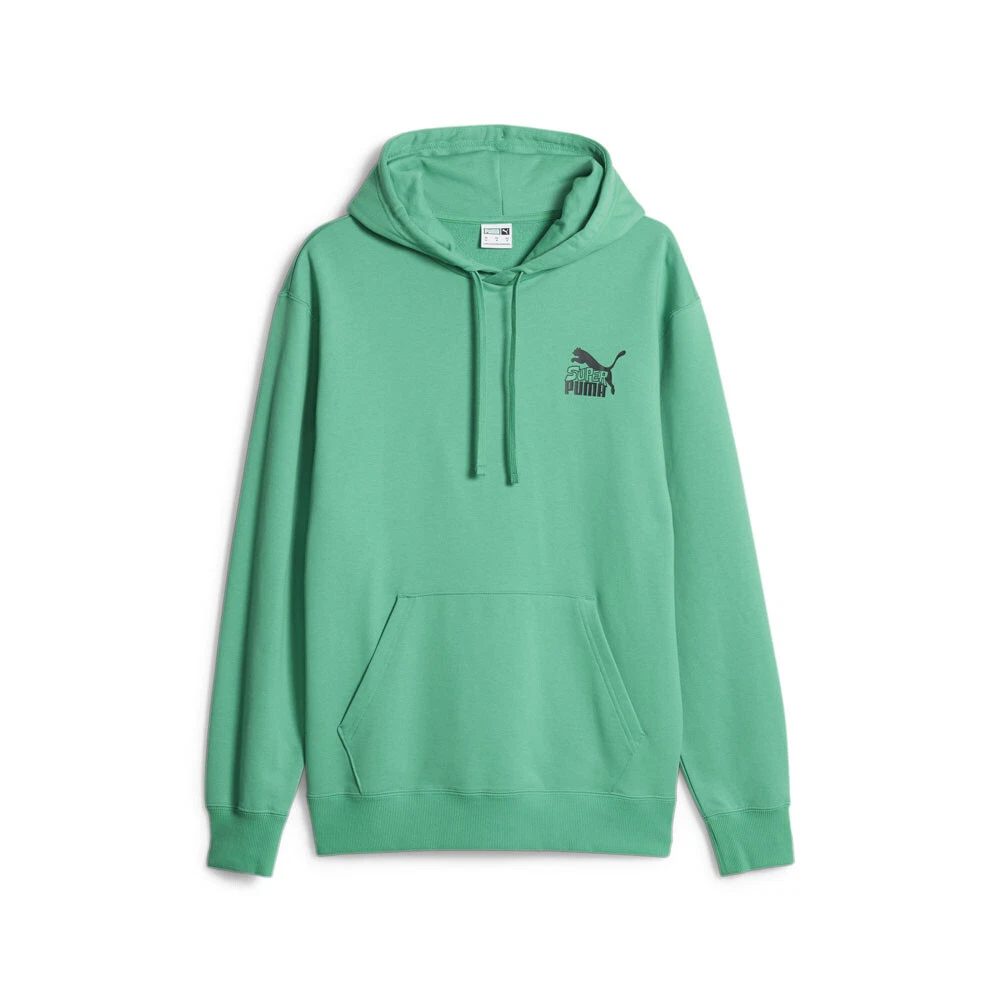 Classics Super Graphic Pullover Hoodie Product Details Regular Fit Crewneck with hood and drawcord for an adjustable fit Kangaroo pocket Ribbed cuffs and hem Graphic print on the front and the back Super PUMA, the eponymous hero from the '70s cartoons, is back to show off your love for football. Featuring a graphic print on the front and back, bold colors with lots of contrast, this classic hoodie offers comfort and impactful styling. Additional Details Color: Green Occasion: Casual Gender: Mens Age: Adult Brand: Puma