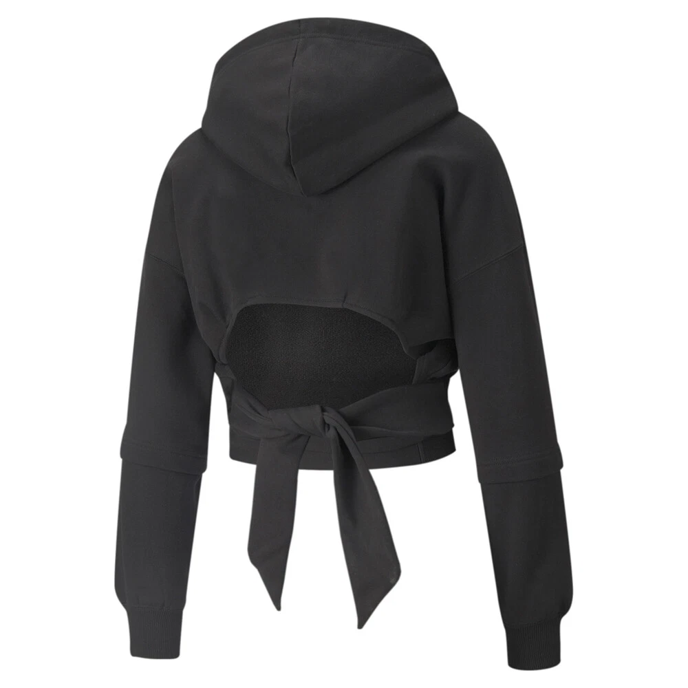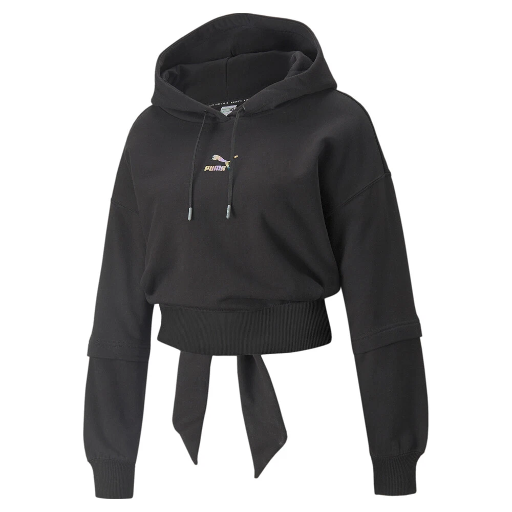 Crystal Galaxy Pullover Hoodie Product Details Regular fit Hood with drawcord for an adjustable fit Open back with bow closure for a flattering look PUMA Cat Logo at chest 68% cotton, 32% polyester Experience a whole new wavelength in our Crystal Galaxy collection, inspired by modern trends to deliver looks that are chill vibes only. Get the best of both worlds with the roomy, relaxed fit and figure-flattering accents of the Crystal Galaxy Hoodie, featuring double-layered sleeves and an open back with a bow closure. Additional Details Color: Black Occasion: Casual Gender: Womens Age: Adult Brand: Puma