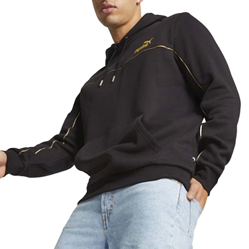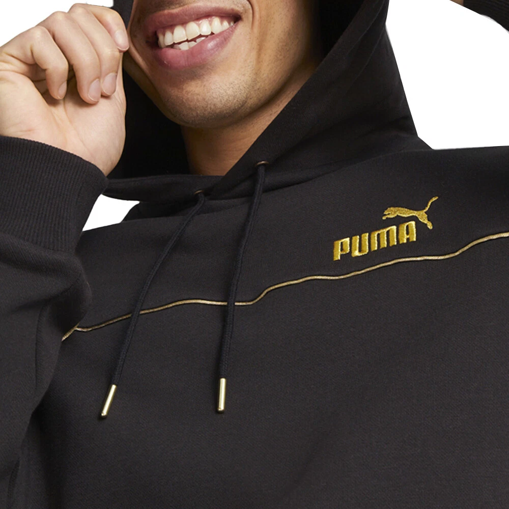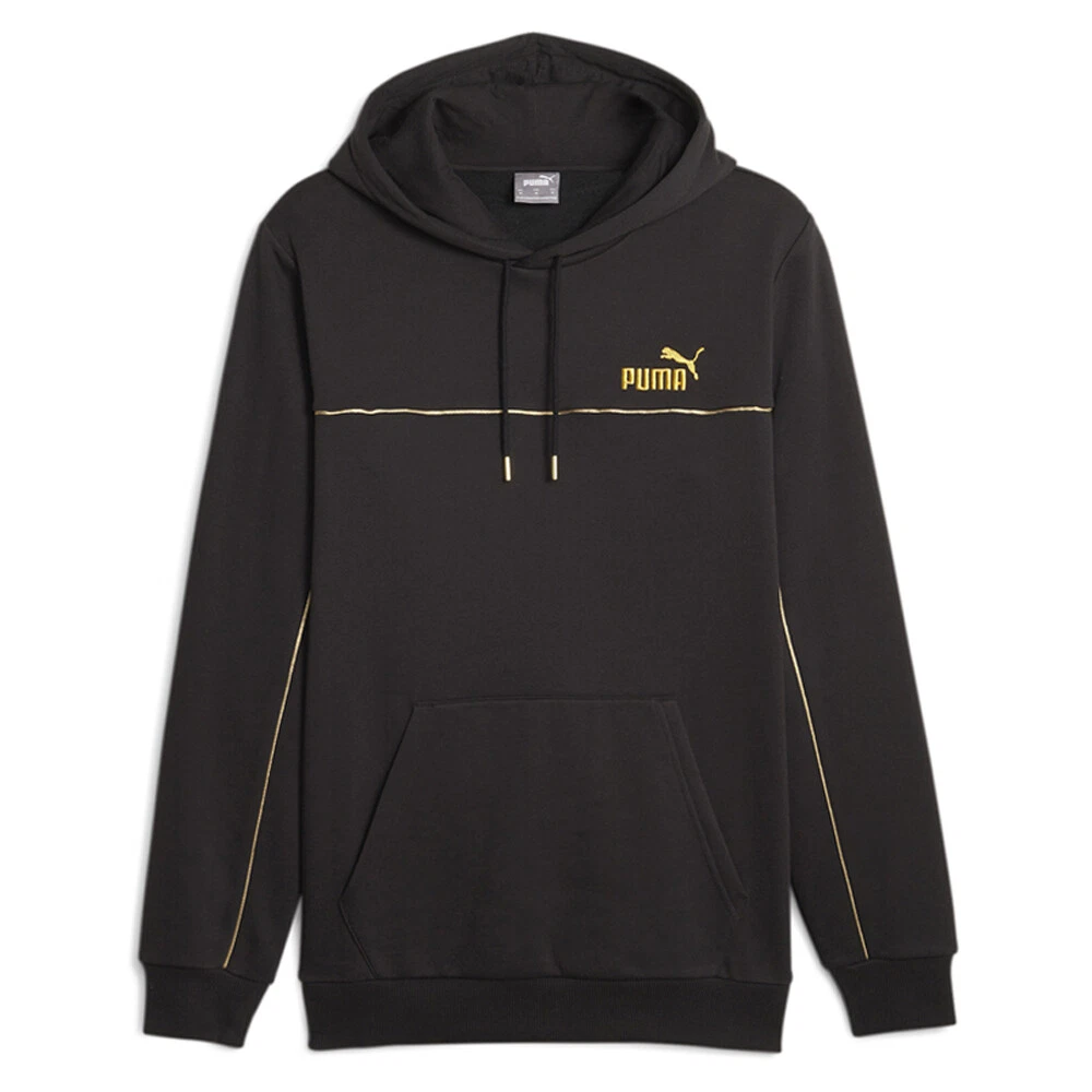 Essential Minimal Gold Pullover Hoodie Product Details Hood with drawcord Rib cuffs and hem Golden piping across chest and inner sleeve Embroidered PUMA No.1 Logo on chest Regular fit We've taken our stipped-back Essentials range and levelled it up a bit with the ESS+ collection, and, now, in this hoodie we've added a gilded touch with some sparkly, gold branding on the PUMA logo. Additional Details Color: Black Occasion: Casual Gender: Mens Age: Adult Brand: Puma