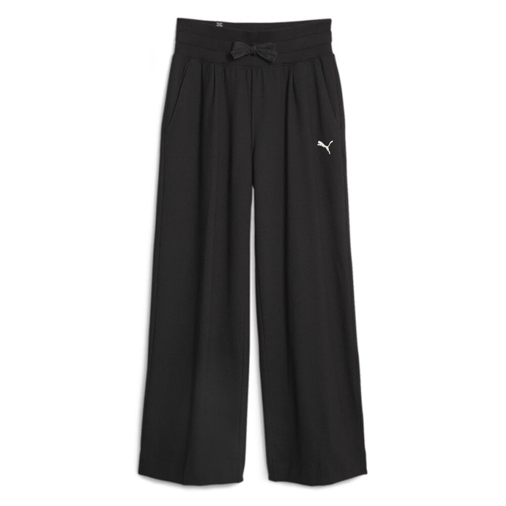 Her High Waist Straight Pants Product Details Elasticated waistband High waist Embroidered PUMA Cat Logo 57% cotton, 40% polyester, 3% elastane Inspired by Japanese street fashion, these straight-legged pants with decorative pleats are knitted, making them stretchier and easier to wear than jeans. The prominent waistband is elasticated and comes with external drawcords for a superb fit. Additional Details Color: Black Occasion: Casual Gender: Womens Age: Adult Brand: Puma
