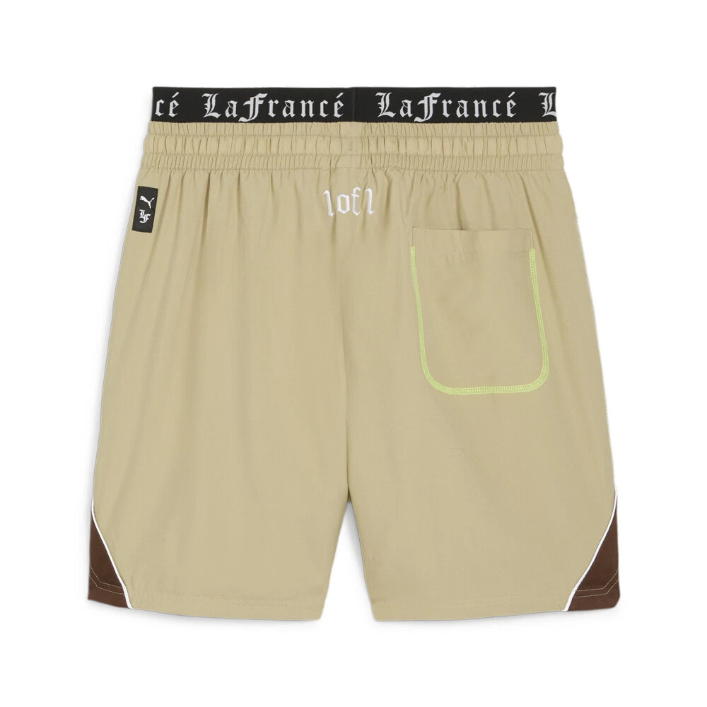 Hoops X Lafrance Woven Shorts Product Details PUMA HOOPS x LaFrancé branding Zip pockets on each side for storage Mid rise waistband Regular fit 100% polyester PUMA HOOPS and LaMelo Ball's LaFrancé brand have teamed up for a capsule collection that takes the superstar's signature style and gives it a high-end approach. The result? Styles like these shorts with extravagant branding. Additional Details Color: Beige Occasion: Casual Gender: Mens Age: Adult Brand: Puma