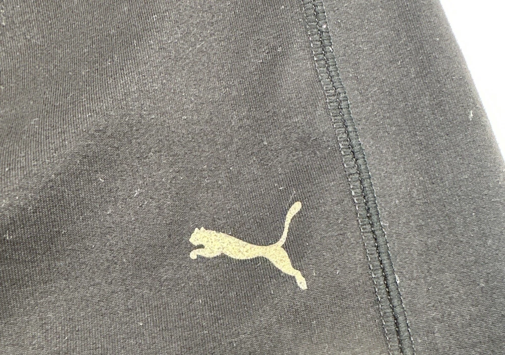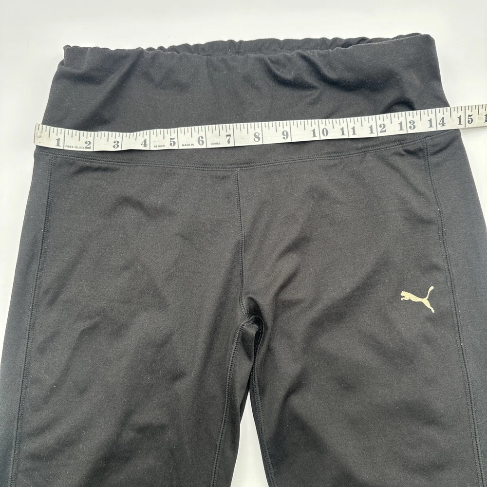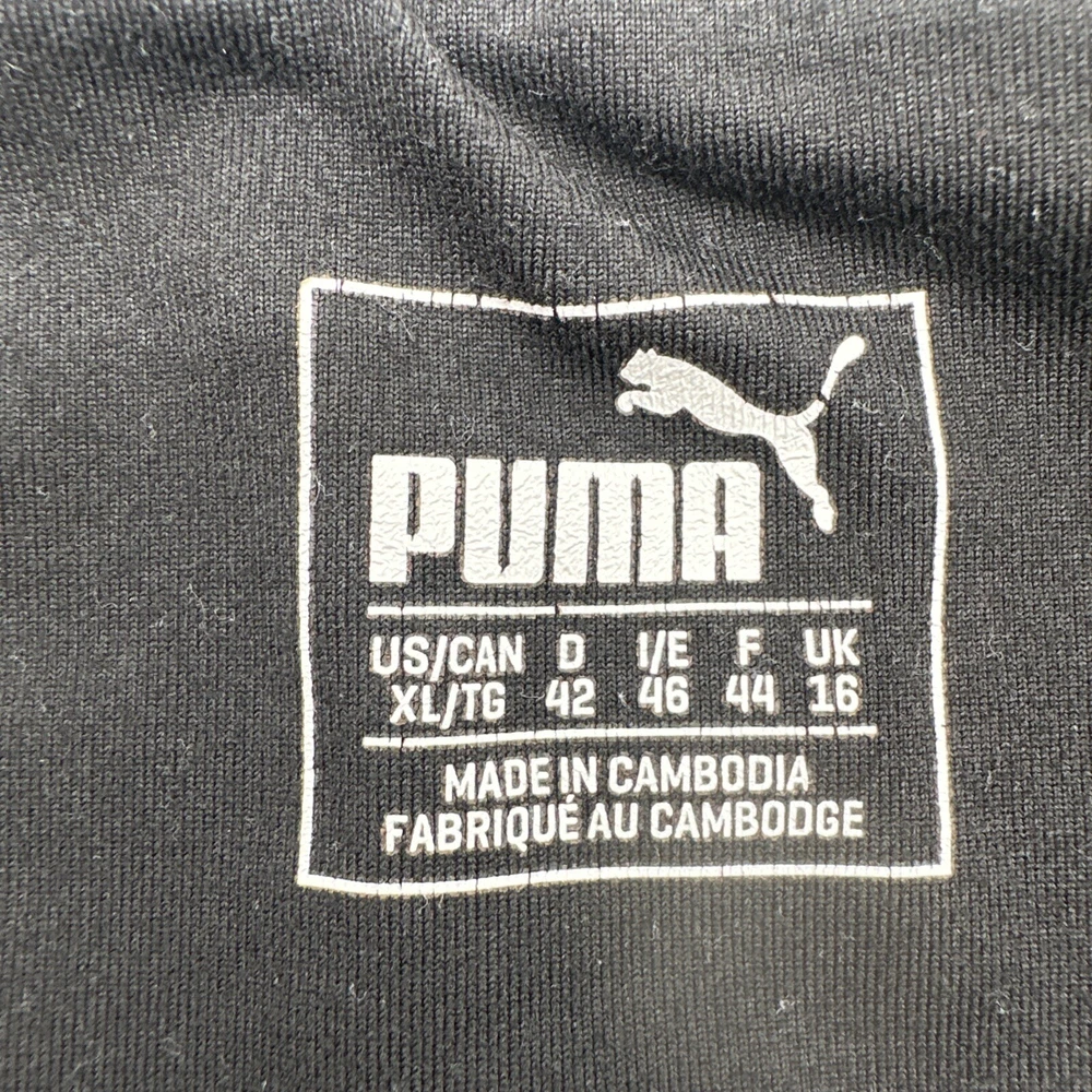 This is a pair of PUMA leggings for women in size XL. They are solid black with a logo design, featuring a pull-on closure and an ankle length. Made of a blend of spandex and cotton, these leggings offer a relaxed fit with compression on the legs. Suitable for activewear, they have an elastic waist for comfort during activities like gym training, cross-training, and running. Ideal for summer and spring seasons. Check pictures for flaws and measurements