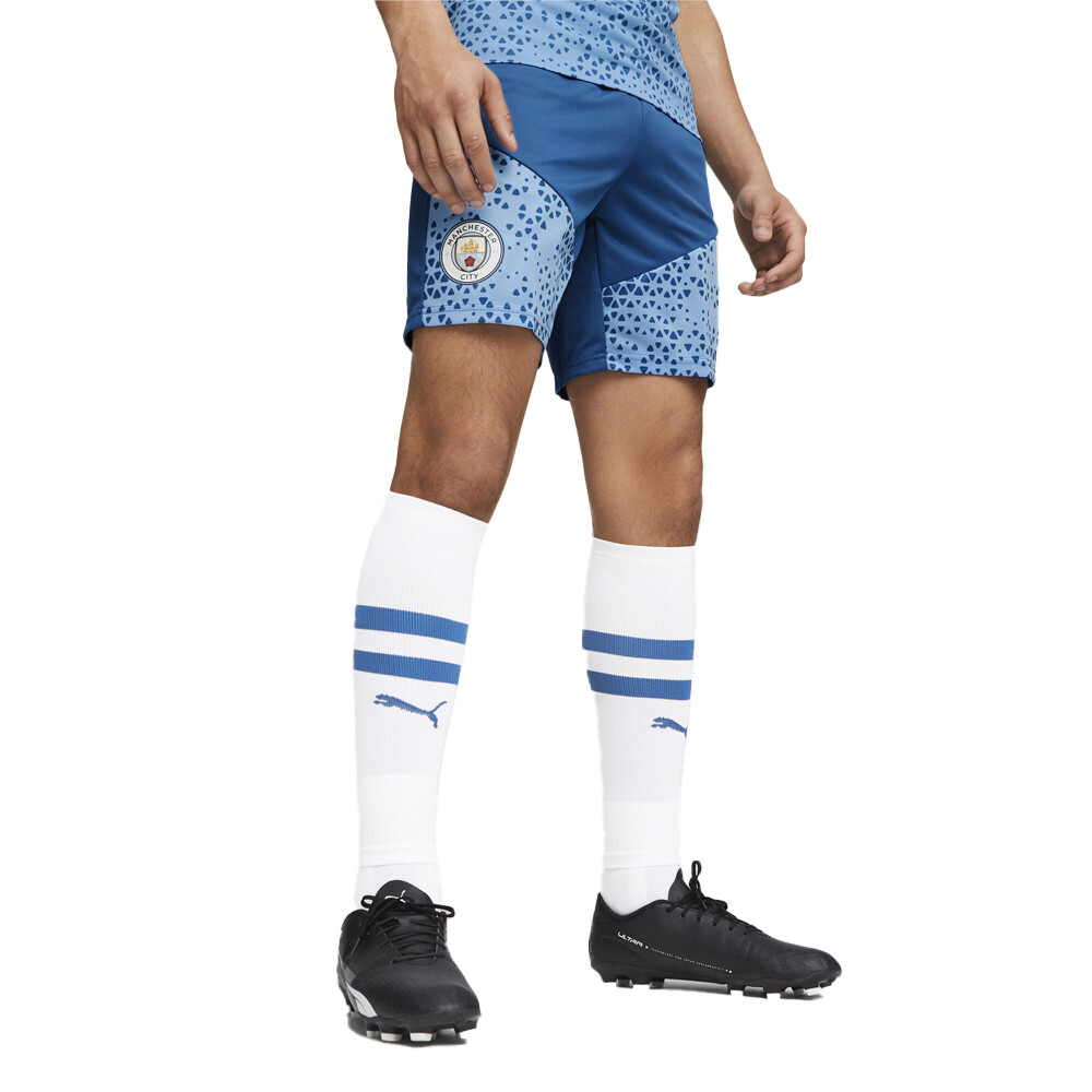 MCFC Soccer Training Shorts Product Details Regular fit Above Knee Length Elastic waistband Official team crest 100% Polyester Cityzens, light up the pitch just like the pros in these MCFC training shorts that are crafted for soccer excellence. Expertly designed with a lightweight construction and moisture-wicking fabrication, you’ll be kicking screamers and practicing your sprints in the ultimate comfort – just like the first team. Additional Details Color: Blue Occasion: Casual Gender: Mens Age: Adult Brand: Puma