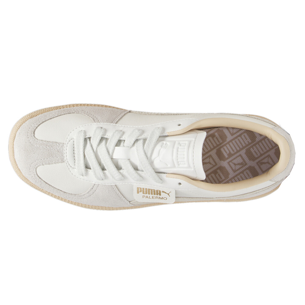 Palermo Lace Up Sneakers Product Details Leather and synthetic upper Lace up closure Mesh sockliner Rubber midsole Rubber outsole A terrace legend from our archives returns: The Palermo. The silhouette debuted back in the early '80s, where it quickly became a staple among the terrace crowds in British soccer stadiums. Now, we’ve brought it back for the fans. Like the original, the Palermo is complete with its signature tag at the upper, a T-toe construction, and, of course, the classic gum sole. This version has a leather base with a suede Formstrip and suede overlays. Additional Details Color: White Occasion: Casual Gender: Womens Age: Adult Brand: Puma