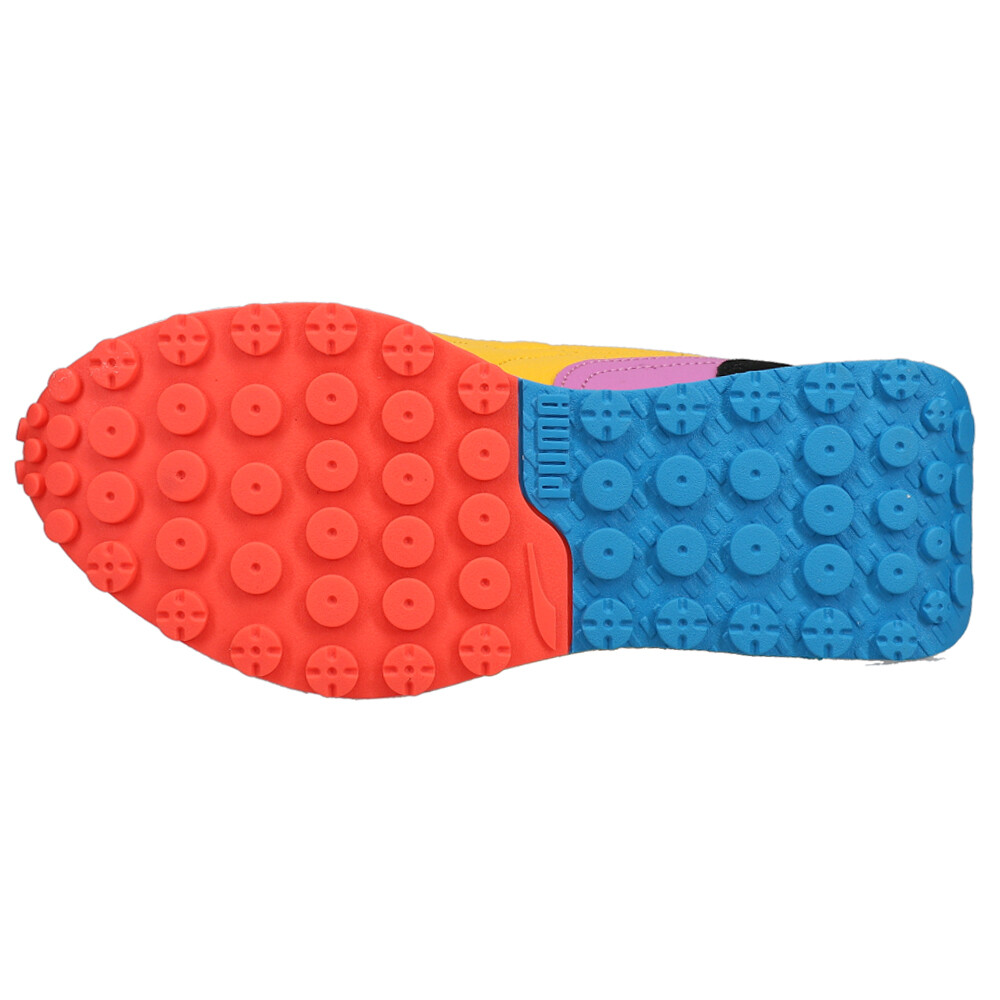 Rider Fv Lava Lace Up Sneakers (Big Kid) Product Details Mesh upper Leather and suede overlays Foam midsole Rubber outsole The newest addition to the Rider family is celebrating the past while standing firmly in the present – just like the people who wear it. Rider FV is all about a combination of past and future, with a nostalgic, heritage-inspired upper and fresh tooling. LAVA features bright and energetic color palettes with glow in the dark accents. Glow in the Dark lava graphic print on the collar. Additional Details Color: Black Occasion: Casual Gender: Boys Age: Youth Brand: Puma
