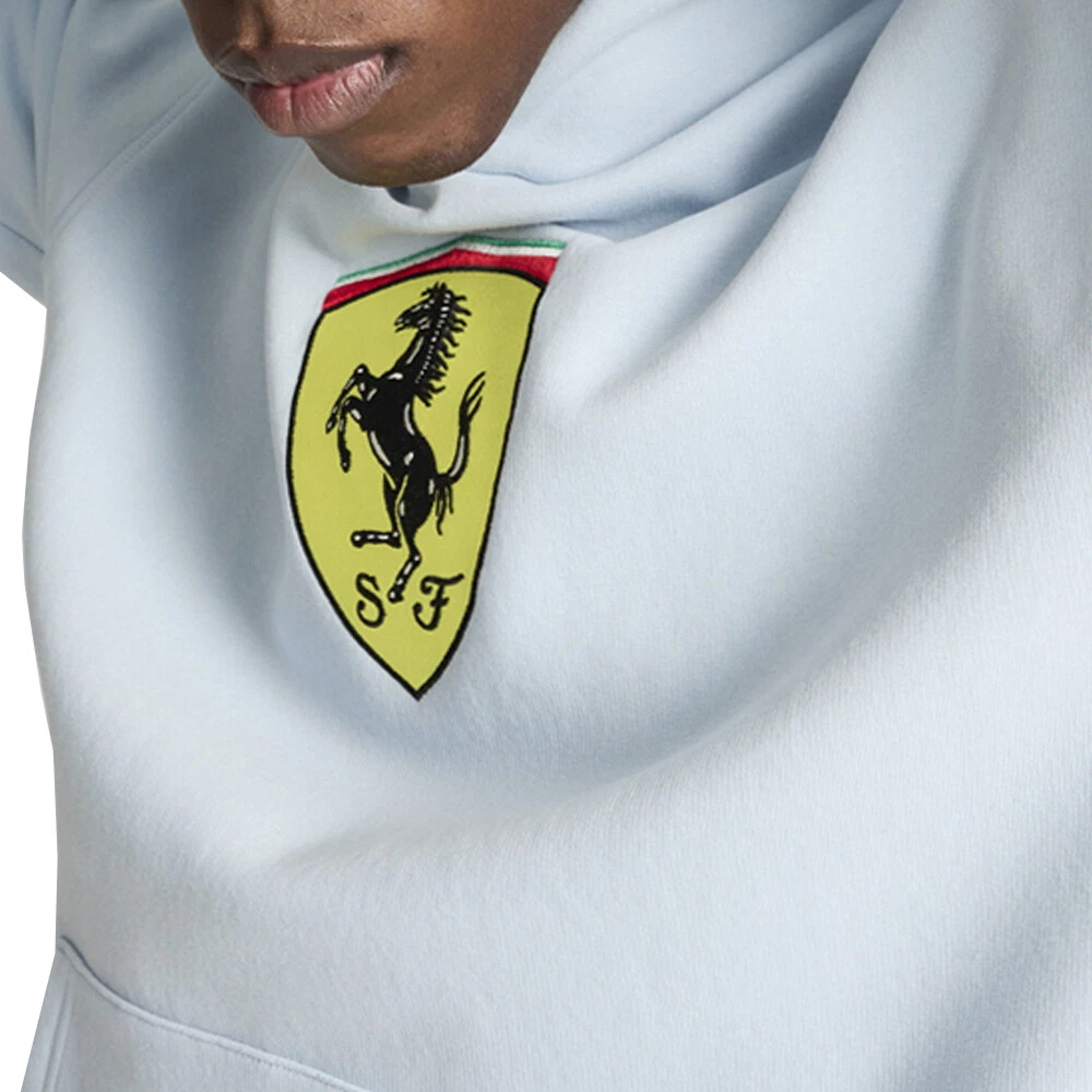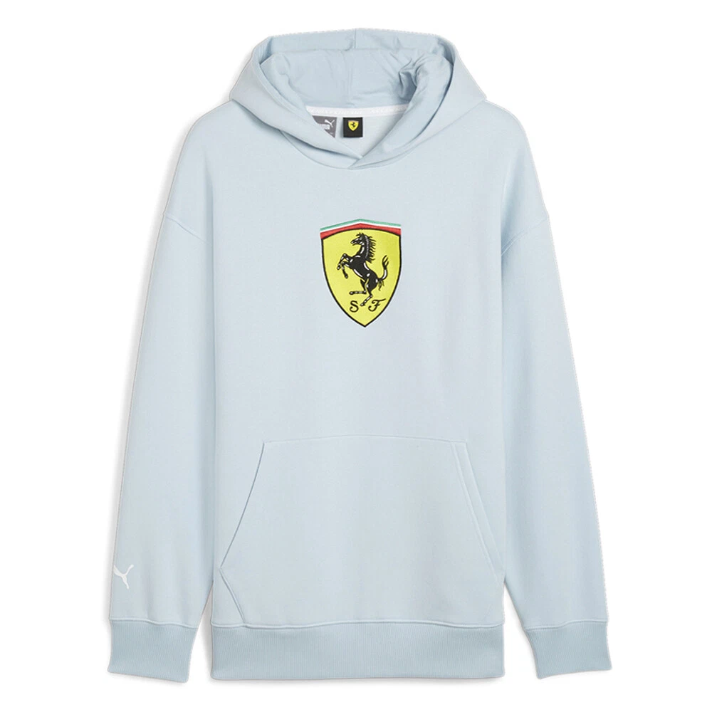 SF Race Big Shield Pullover Hoodie Product Details Regular fit, regular length 68% cotton, 32% polyester Brushed fleece lining Hood Long sleeves Accelerate your style in this bold SF hoodie. The brushed fleece lining keeps you warm as the SF shield boldly proclaims your passion for speed. Conquer cold weather and show your love for the prancing horse. Additional Details Color: Blue Occasion: Casual Gender: Mens Age: Adult Brand: Puma