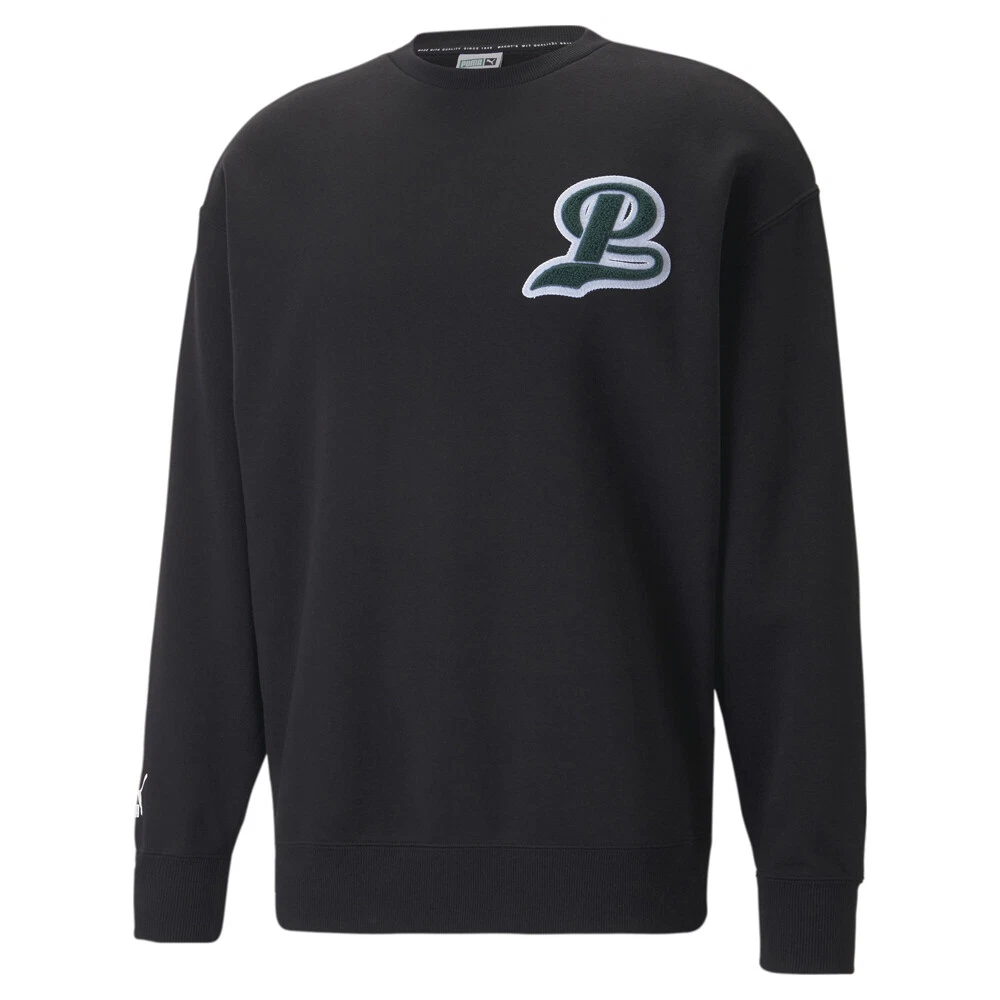 Team Crew Neck Long Sleeve Sweatshirt Product Details Regular fit Striped crew neckline Long sleeve Custom embroidery 68% cotton, 32% polyester This comfortable pullover is adorned with custom "P" embroidery on the front, a striped crew neckline, long sleeves, and ribbed trimming. Additional Details Color: Black Occasion: Casual Gender: Mens Age: Adult Brand: Puma