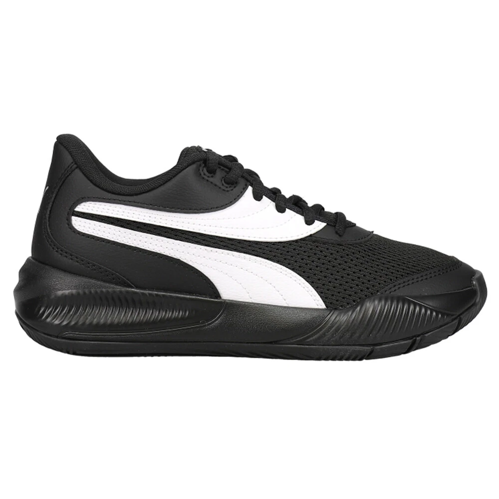 Triple Basketball Shoes (Big Kid) Product Details Textile upper with mesh and leather overlays Textile tongue Full-length ProFoam midsole engineered for basketball Full-coverage rubber outsole Amplify your style threefold in our Triple trainers, a basketball shoe that is style cubed. The placement of triple PUMA Formstrips takes the stunning silhouette of this trainer over the top. Our Triple Basketball Shoes feature amazing performance, equipped with a ProFoam midsole for lightweight cushioning and impeccable energy return and bold a design for the baller who wants to stand out from the crowd. Additional Details Color: Black, White Occasion: Casual Gender: Boys Age: Youth Brand: Puma