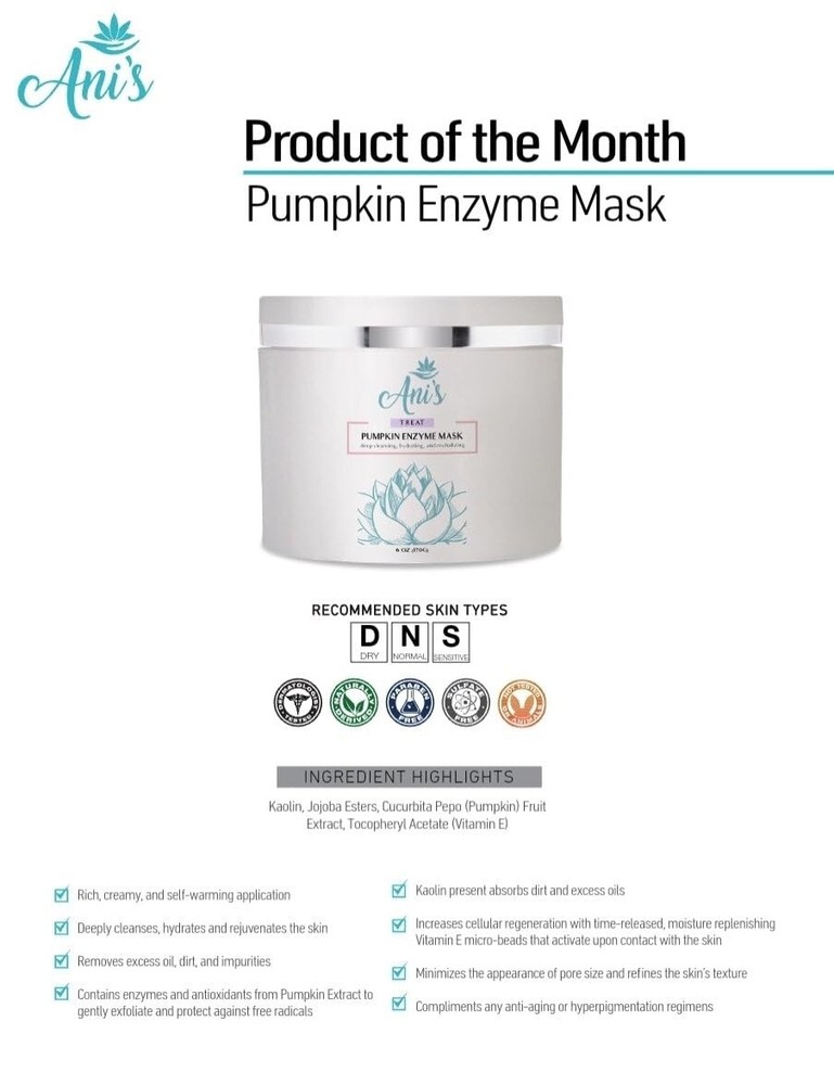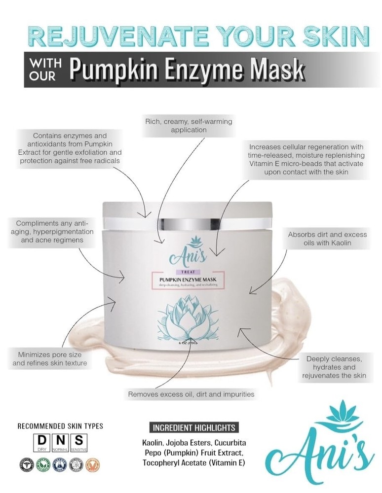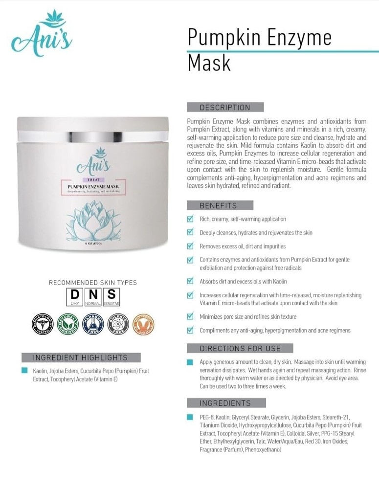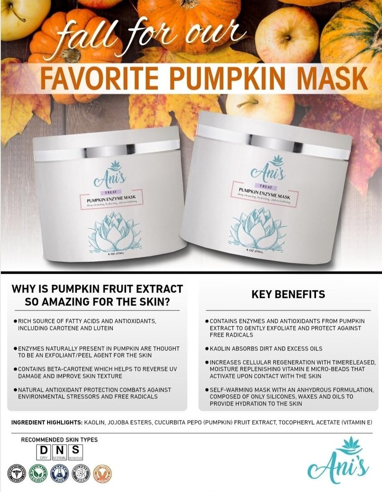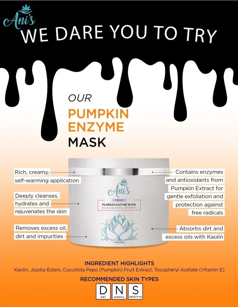 Pumpkin Enzyme Mask – Deep Cleansing, Hydrating & Rejuvenating Facial Mask with Gentle Exfoliation Indulge in the ultimate skincare experience with our Pumpkin Enzyme Mask , a rich, creamy, self-heating formula designed to deeply cleanse, hydrate, and refresh your skin. Infused with the power of natural pumpkin enzymes , antioxidants, and essential vitamins, this luxurious mask helps refine skin texture, minimize the appearance of pores, and remove excess oil, dirt, and impurities for a smoother, more radiant complexion. Formulated with kaolin clay , this mask effectively absorbs dirt and oil while the gentle exfoliating action of pumpkin enzymes supports natural skin renewal, leaving your skin feeling soft, refreshed, and glowing. The time-release vitamin E microspheres activate upon contact, replenishing moisture and promoting a revitalized, healthy look. Perfect for all skin types, this rejuvenating mask complements any skincare routine, enhancing the skin’s natural clarity and brightness. Whether you are looking to refine pores, balance excess oil, or achieve a hydrated, glowing complexion, our Pumpkin Enzyme Mask is the perfect addition to your self-care regimen. Key Benefits: Deep Cleansing & Detoxifying – Removes dirt, oil, and impurities for fresher, cleaner skin Hydration & Rejuvenation – Nourishing formula helps restore and retain moisture Gentle Exfoliation – Pumpkin enzymes promote natural skin renewal for a smoother texture Pore Refining – Helps reduce the appearance of pores and supports a balanced complexion Self-Heating Formula – Provides a soothing, spa-like experience during application Perfect for All Skin Types – Works well with any skincare routine How to Use: Apply a generous amount to clean, dry skin. Massage gently until the warming sensation fades. Wet your hands and massage again for deeper penetration. Rinse thoroughly with warm water. Use 2-3 times per week for best results. Elevate your skincare routine with the Pumpkin Enzyme Mask and experience smoother, brighter, and more hydrated skin! 🌿✨