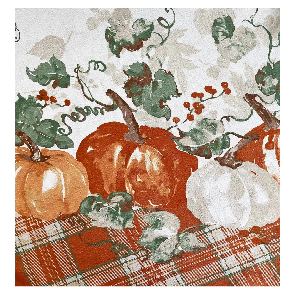 Pumpkin Gingham Country Rustic Bordered Thanksgiving Fabric Tablecloth, Autumn Farmhouse Pumpkin Vine Plaid Easy Care Fall Tablecloth, 52” x 70” Oblong/Rectangle SIZING: 52" x 70" Oblong / Rectangle (132 x 178cm) - Fits tables from 28 Inch x 46 Inch to 40 Inch x 54 Inch and Seats 4 to 6 People - Rectangle/Oblong STYLING:The Pumpkin Gingham Country Rustic Bordered Thanksgiving Fabric Tablecloth features a bordered design of farmhouse rustic orange and natural beige pumpkins with green and brown vine and berries twisted on a cottage styled orange, green and beige plaid border on an ivory beige background. FEATURES: Festive Easy Care, Soil Resistant and Permanent Press Kitchen and Dining Room Tablecloth for Fall, Autumn and Thanksgiving Dining, Entertaining, Parties, Picnics, Restaurants and Cafeterias. Indoor and Outdoor Thanksgiving Holiday Tablecloths Napkins sold separately. Easy Care 100% polyester construction is machine washable and tumble dry and requires little or no ironing