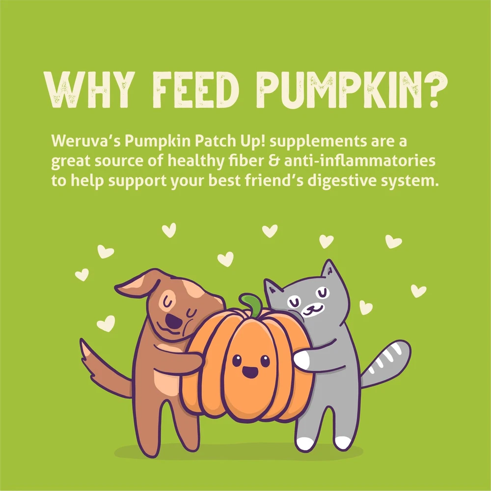 Pumpkin supplement for dogs & CATS featuring GMO-Free pumpkins Pumpkins are naturally rich in soluble & insoluble fibers which help support gut Motility & stool quality Grain-free, Potato-Free, gluten-free, GMO-Free, MSG-Free, Starch-Free, carrageenan free, vegetarian Only two ingredients in a convenient, easy-to-open non-bpa pouch & pureed for easy mixing Family owned for Over 10 years & Made in a Human-Food Facility with Superior Safety Standards & Quality Control